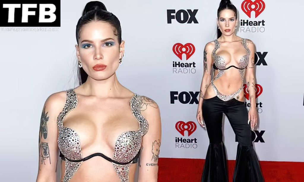 Halsey appare senza reggiseno in un abito nero aderente alla Vanity Fair Oscar Party 2023 a Beverly Hills, 12/03/2023. Il tessuto trasparente è un omaggio al suo Instagram, e mostra anche le protuberanze dei capezzoli sul tappeto rosso.