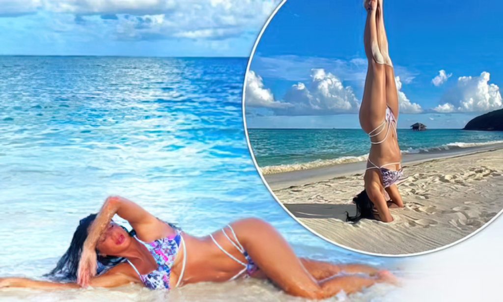 La star di The Fappening Nicole Scherzinger mostra la sua abilità nello yoga, posando in bikini sulla spiaggia – Instagram, 10/08/2021.