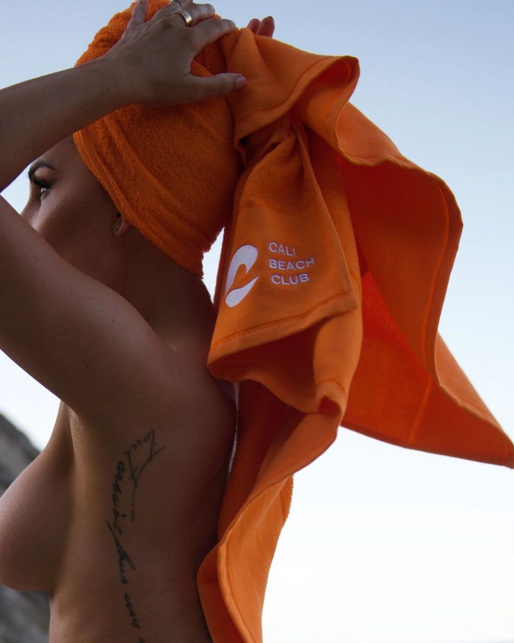 La modella Rosanna Arkle posa topless, mostrando il suo sideboob in un servizio fotografico per Cali Beach Club – Instagram, 23/09/2021.