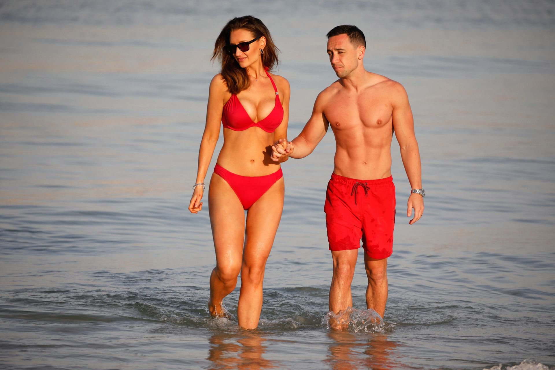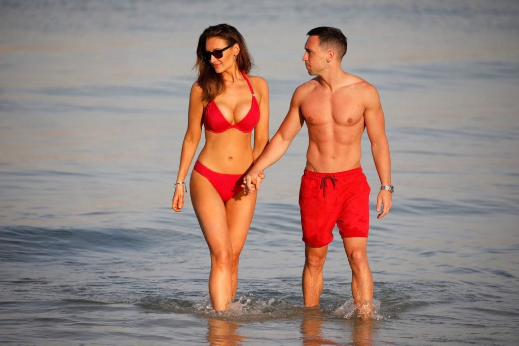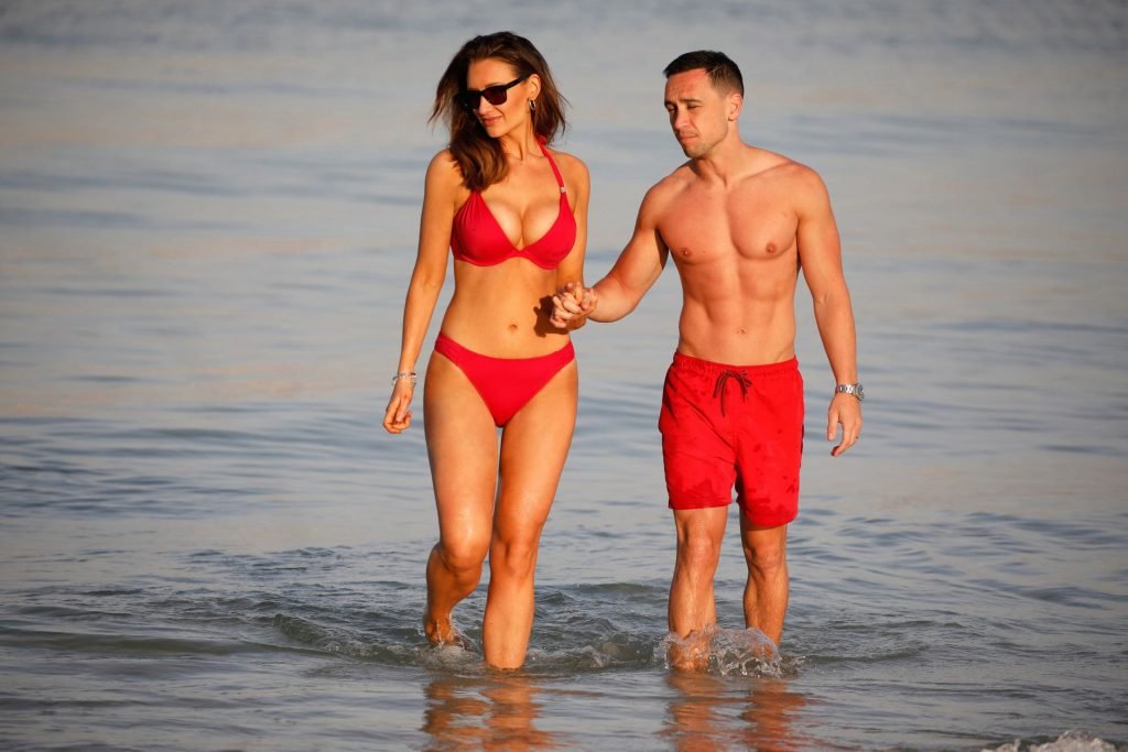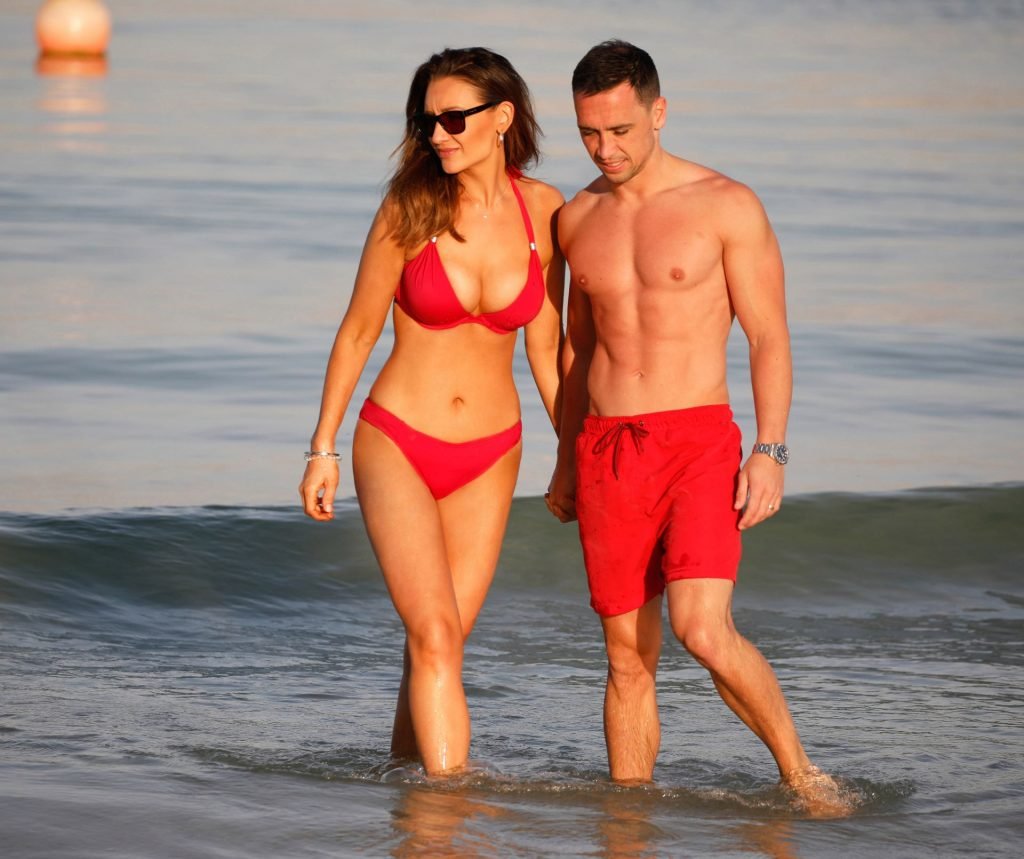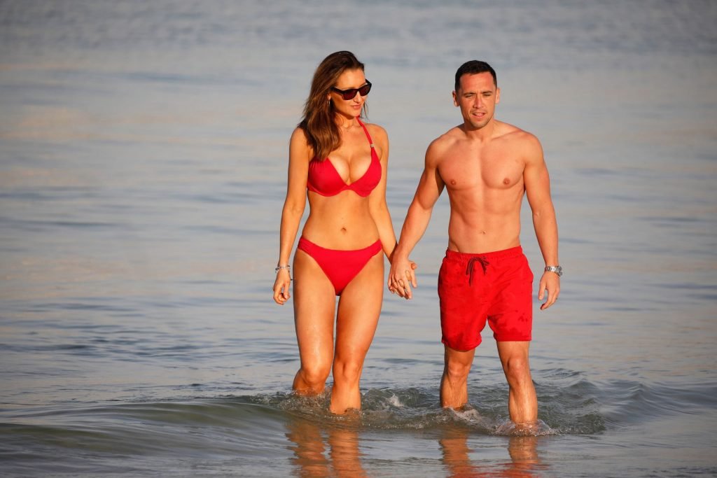 L’attrice formosa Catherine Tyldesley è stata vista in bikini rosso sulla spiaggia dell’hotel Le Royal Meridien a Dubai, 30/03/2019.