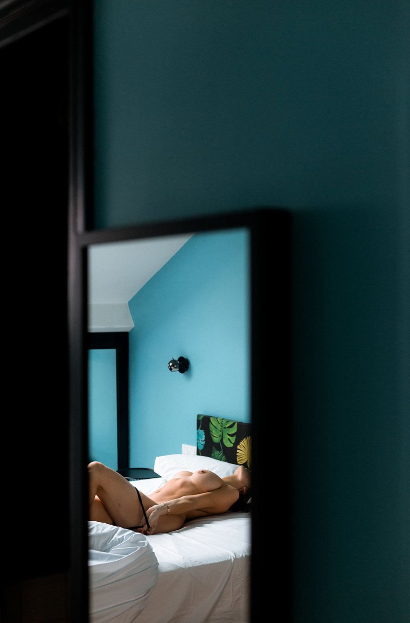Fotografo e modella hanno presentato un nuovo servizio fotografico di Vincent Amar (giugno 2018). Celine ha mostrato il suo bellissimo corpo nudo nella camera da letto con pareti turchesi.