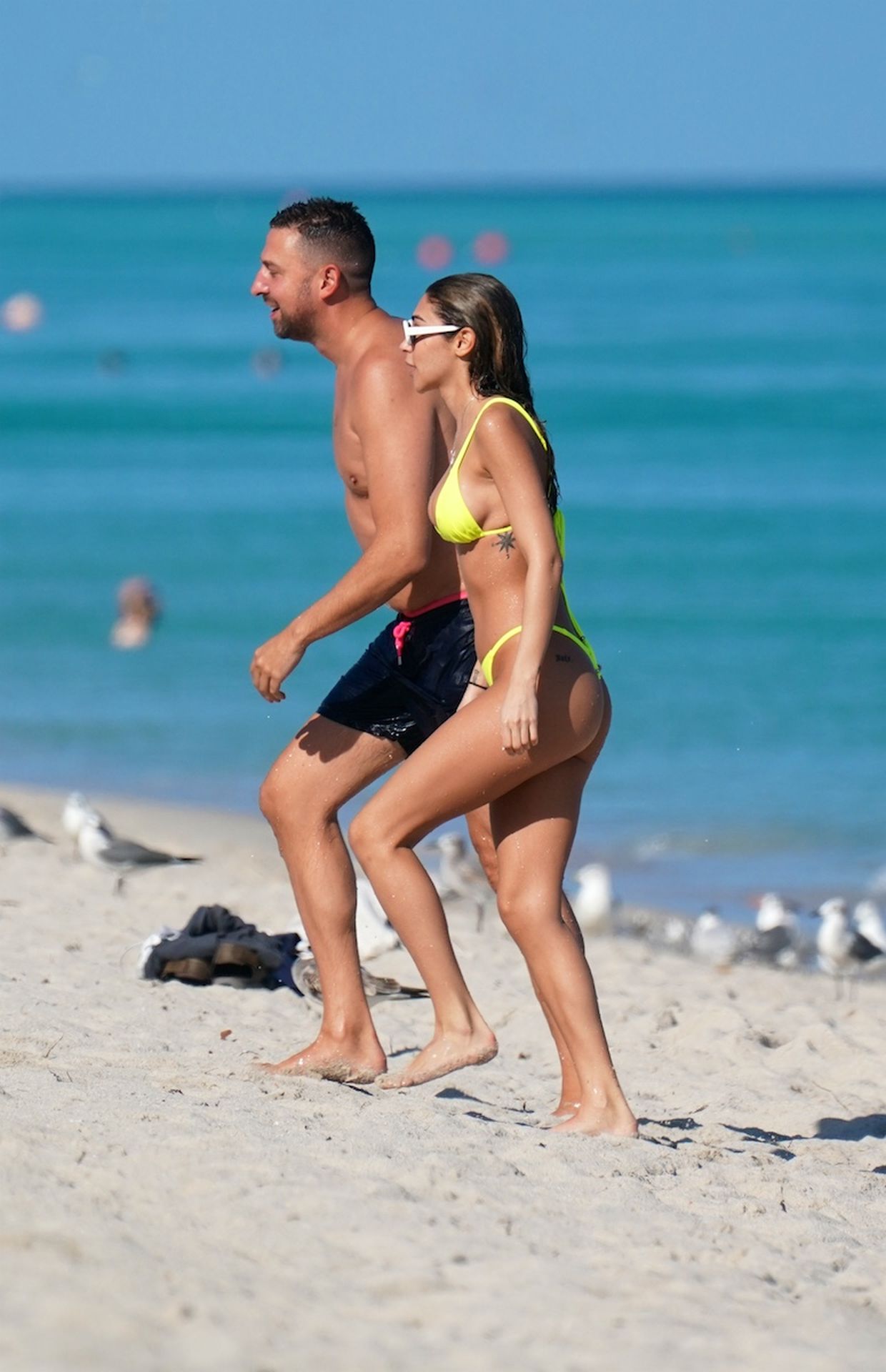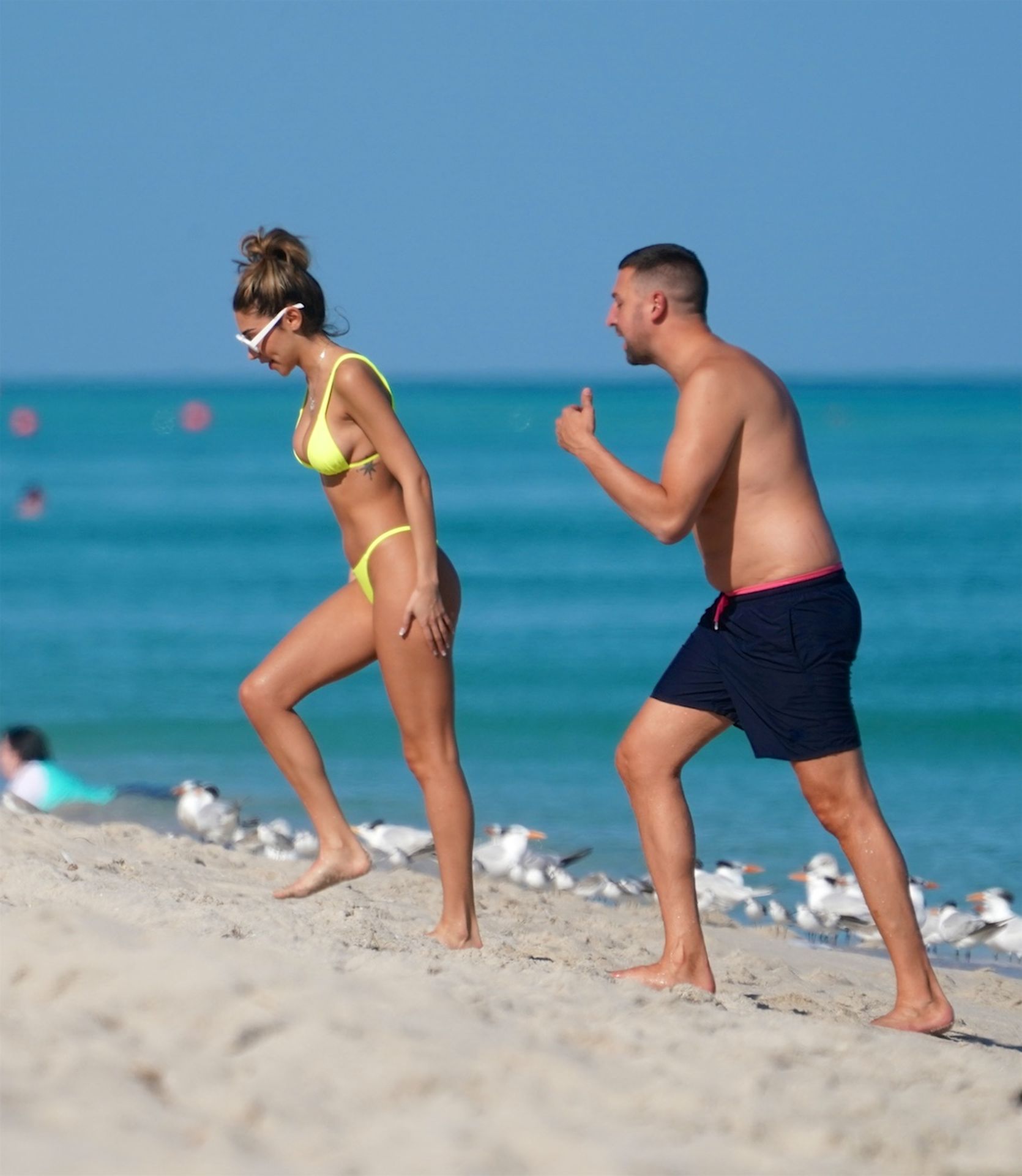 L’ex fidanzata di Justin Bieber, la star di The Fappening Chantel Jefferies, è stata vista in un bikini a perizoma neon sulla spiaggia con un uomo misterioso a Miami Beach, 12/02/2019.