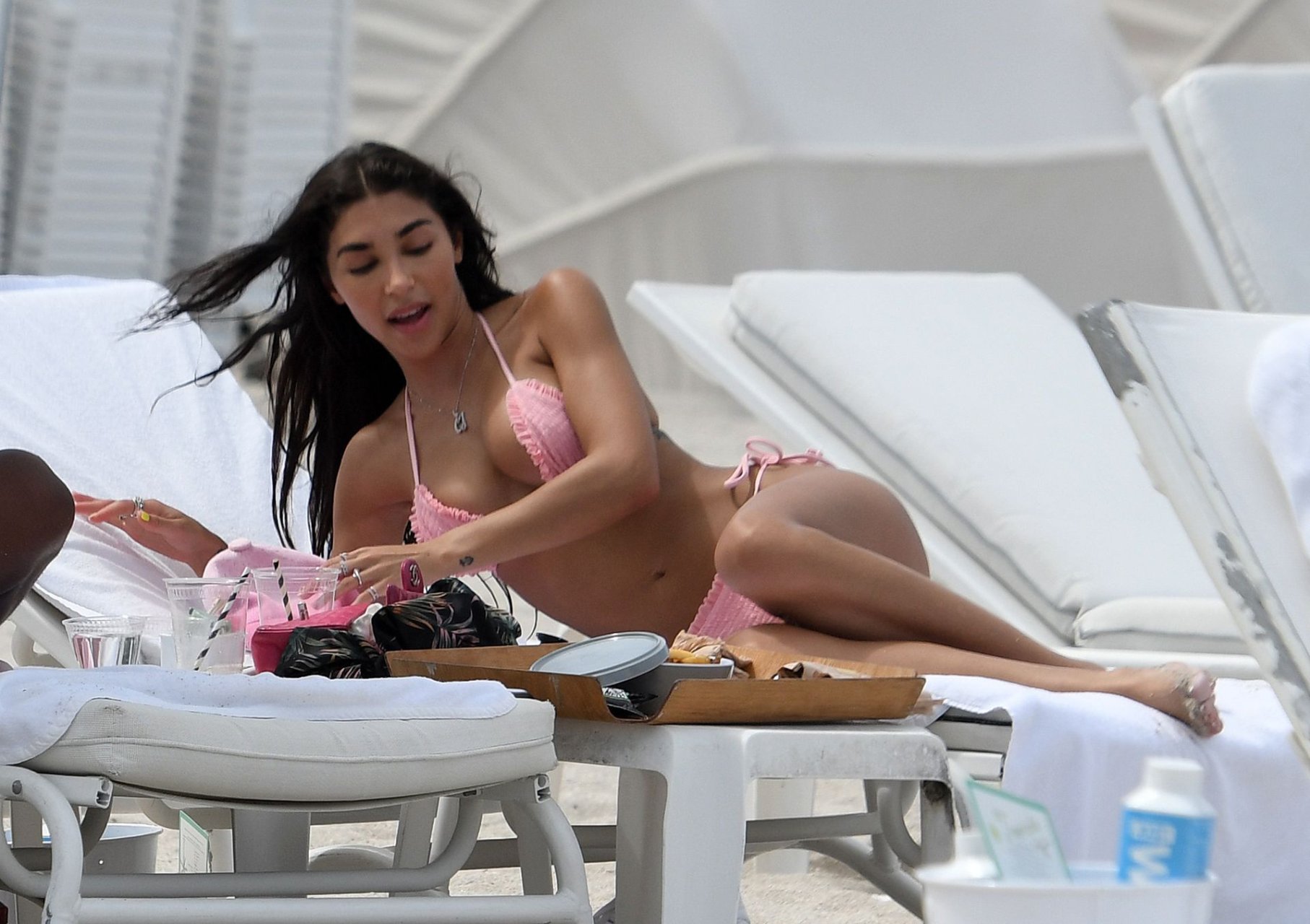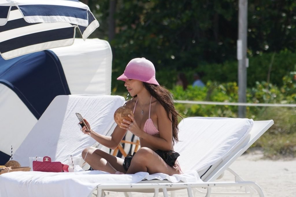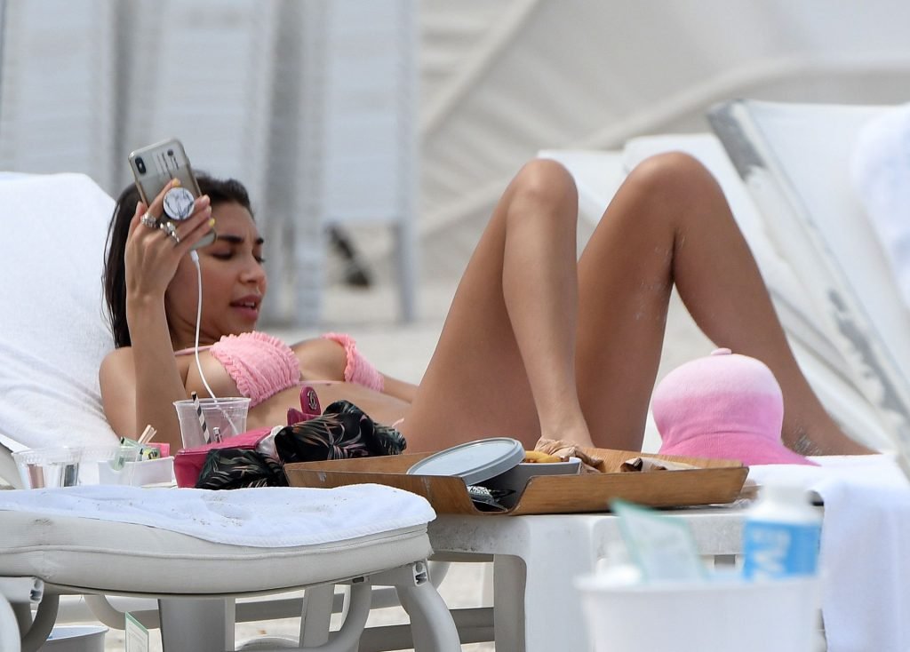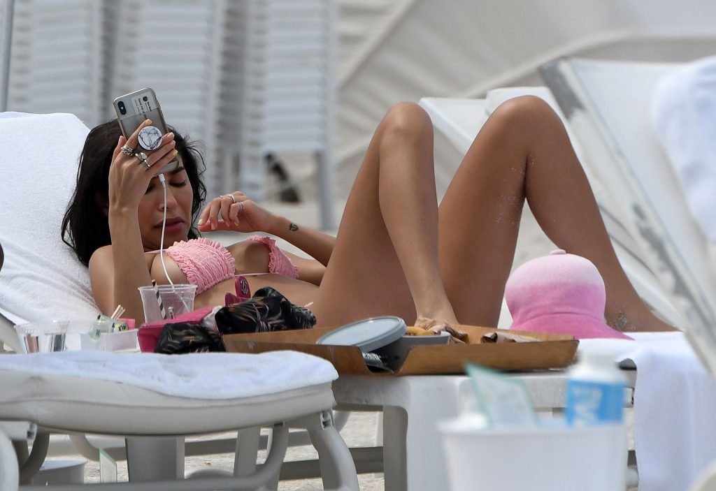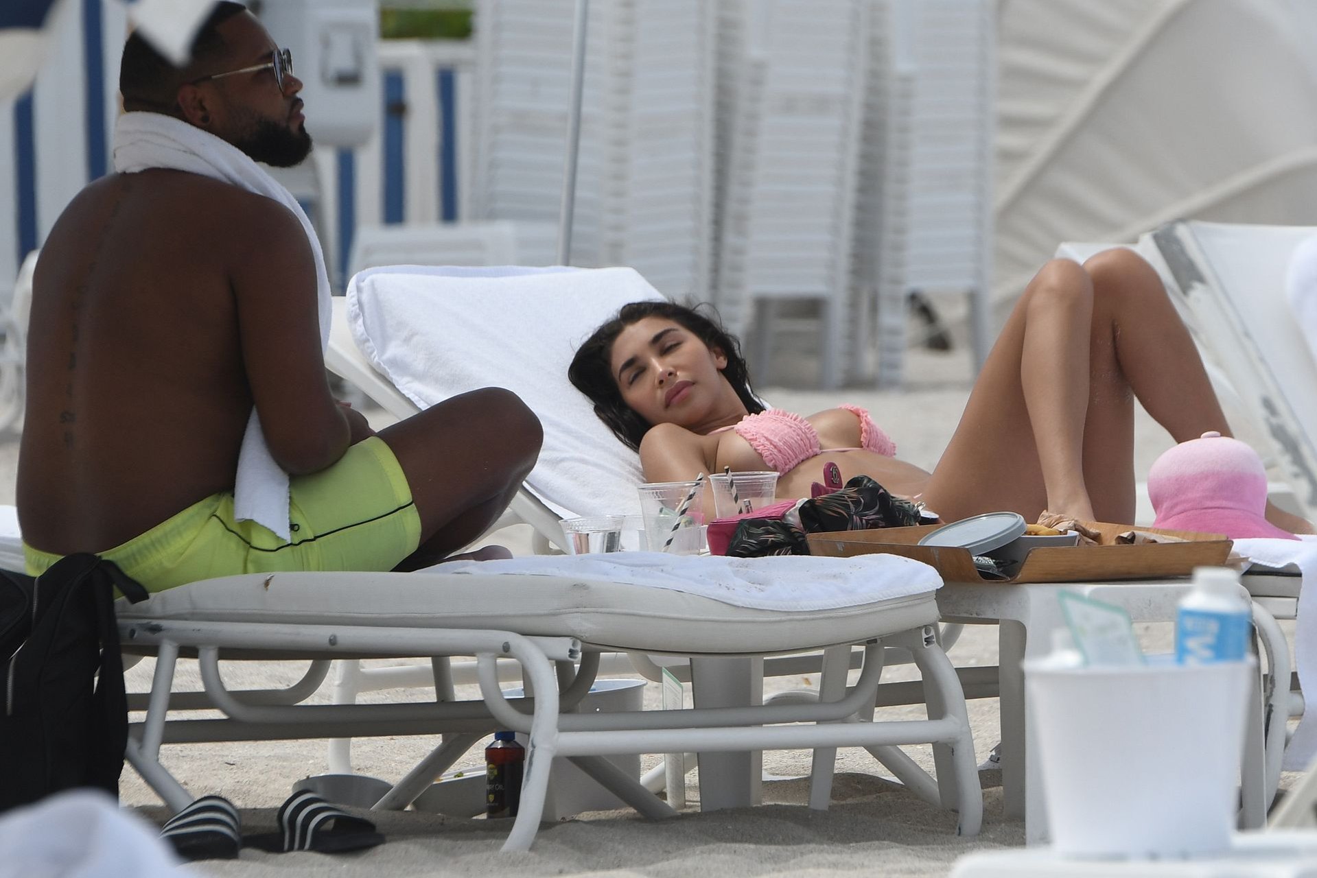L’ex di Justin Bieber, Chantel Jeffries (26), indossa un bikini rosa mentre si rilassa sulla spiaggia con un uomo misterioso a Miami, 11/07/2019.