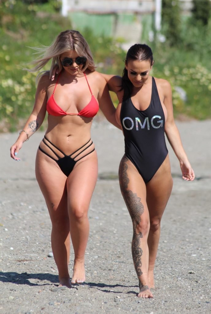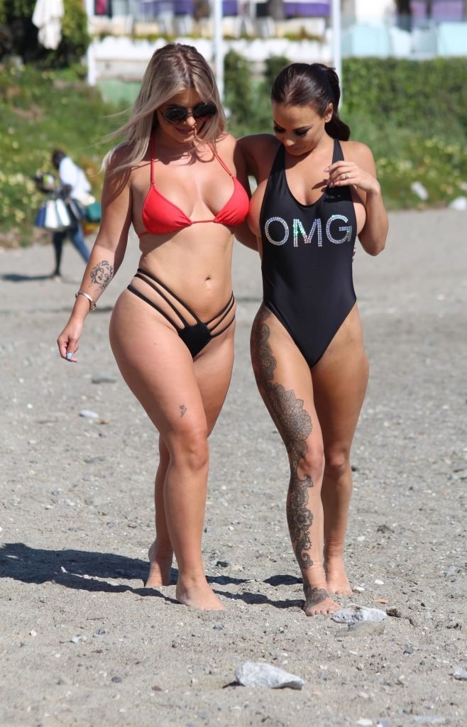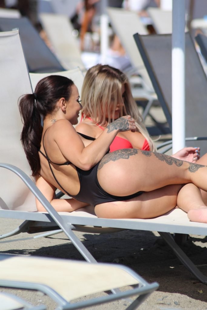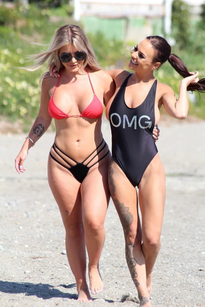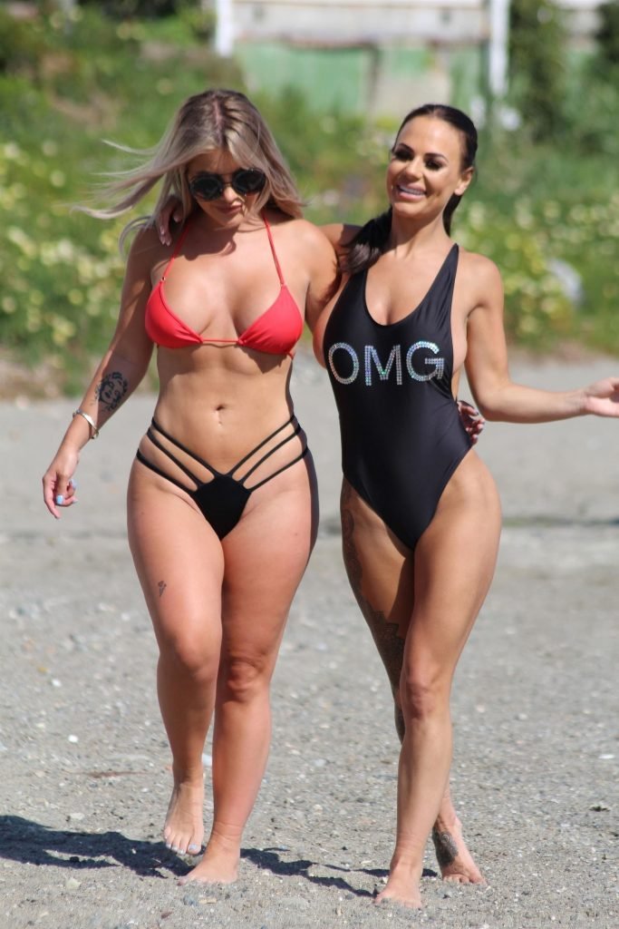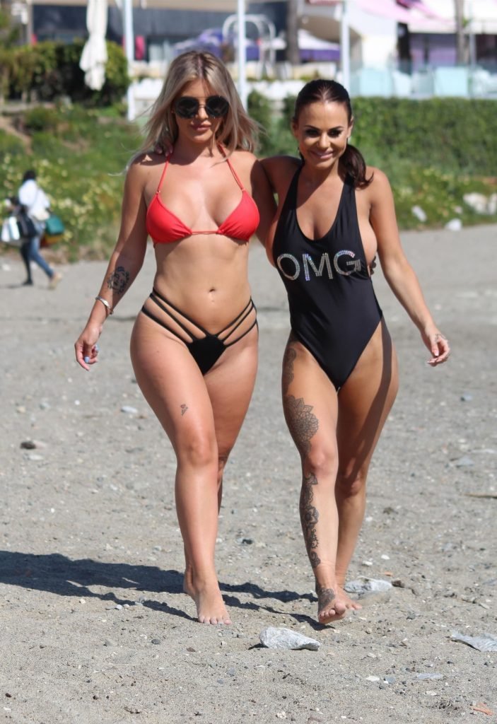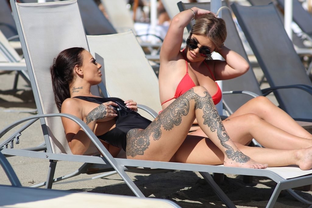 Ex Geordie Shore (TV) babe Chantelle Connelly è stata vista con Lois Molloy (Serene Cosmetic) mentre si applicavano la crema solare a vicenda sulla spiaggia di Marbella, 05/10/2018. Chantelle è volata per una consulenza in vista del suo secondo intervento con il concierge di chirurgia estetica di lusso. Lois ha sfoggiato un sexy bikini rosso mentre Chantelle ha stupito i vacanzieri con il suo costume da bagno nero OMG.