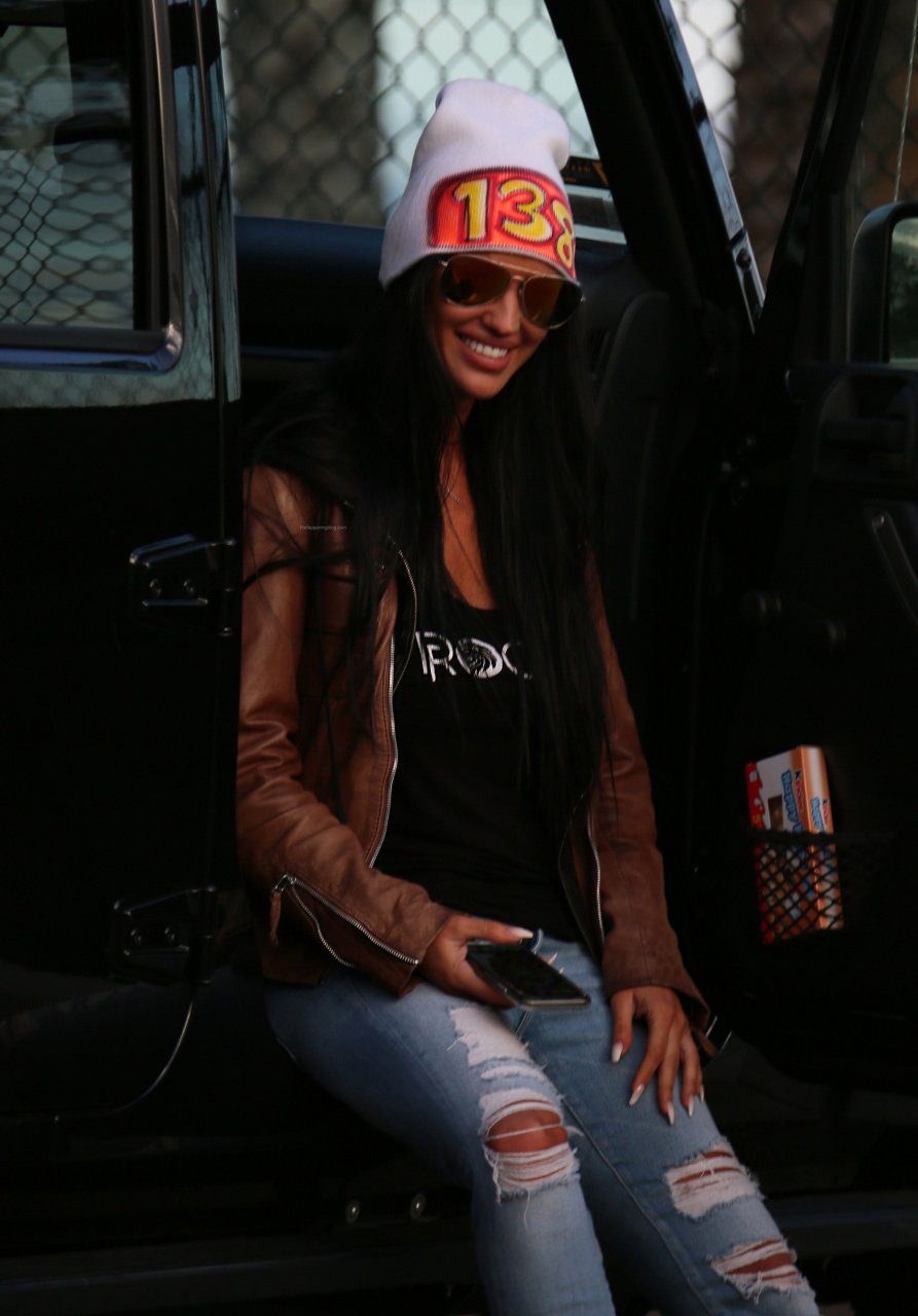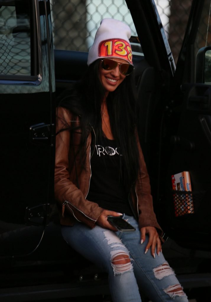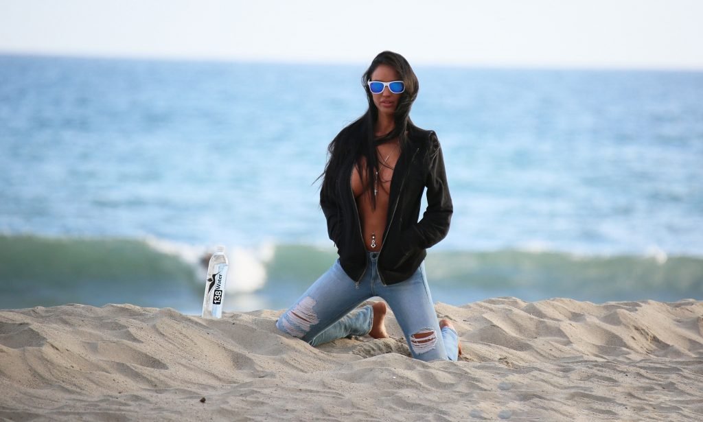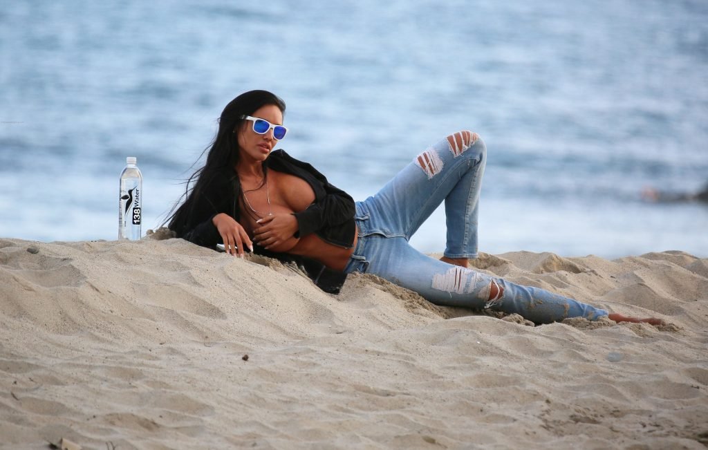 La bruna prosperosa Charlie Riina sfoggia i suoi seni abbronzati in una giacca nera, topless (coperta con del nastro adesivo) e jeans di denim strappati sul set di un servizio fotografico spontaneo per 138 Water a Malibu, 18/04/2018. Charlie Riina è una modella e Playmate di Playboy canadese. Nata: 1984, 4 gennaio. Altezza: 172 cm.