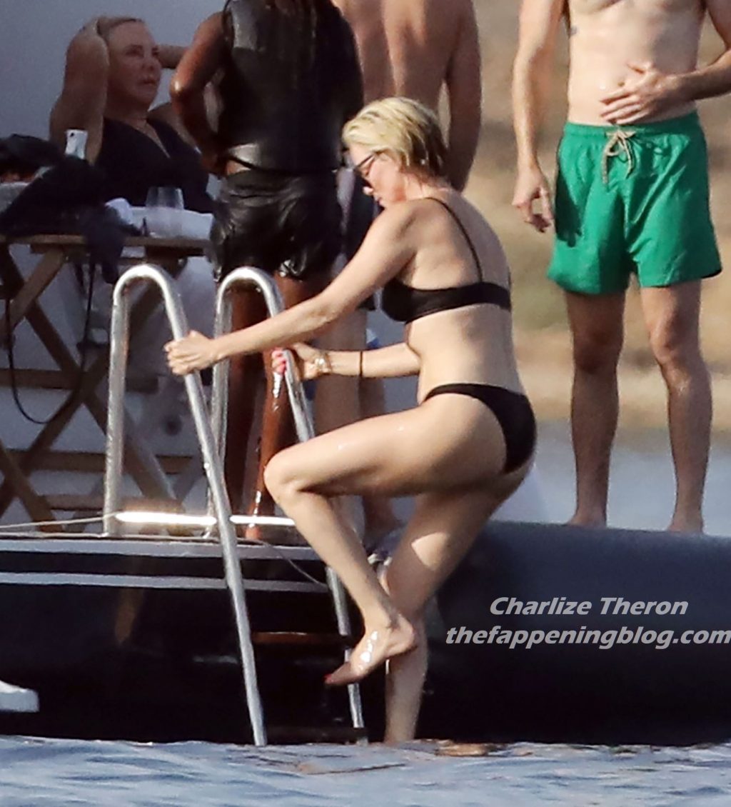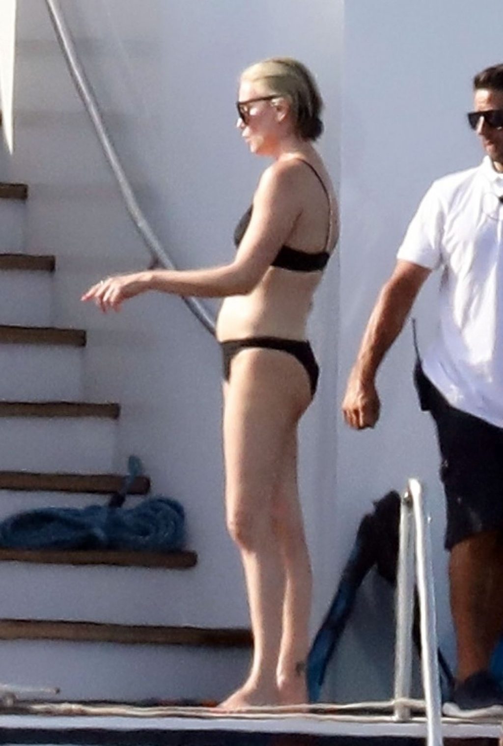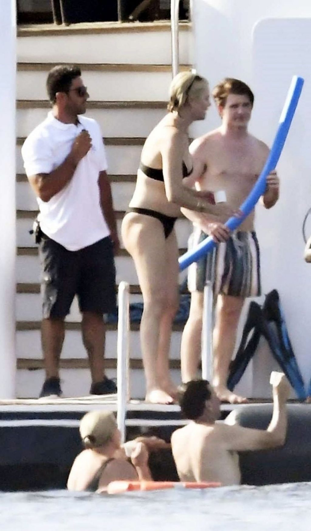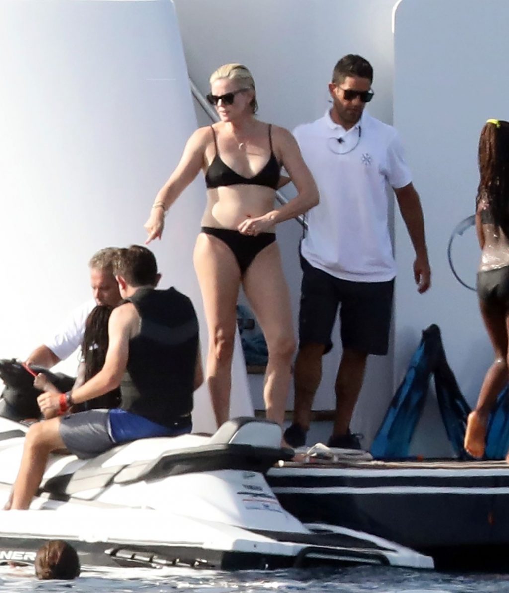 Mentre il sole splendeva sull’attrice, Charlize indossava il suo bikini nero mettendo in mostra la sua figura sexy su uno yacht, navigando nel Mar Egeo.