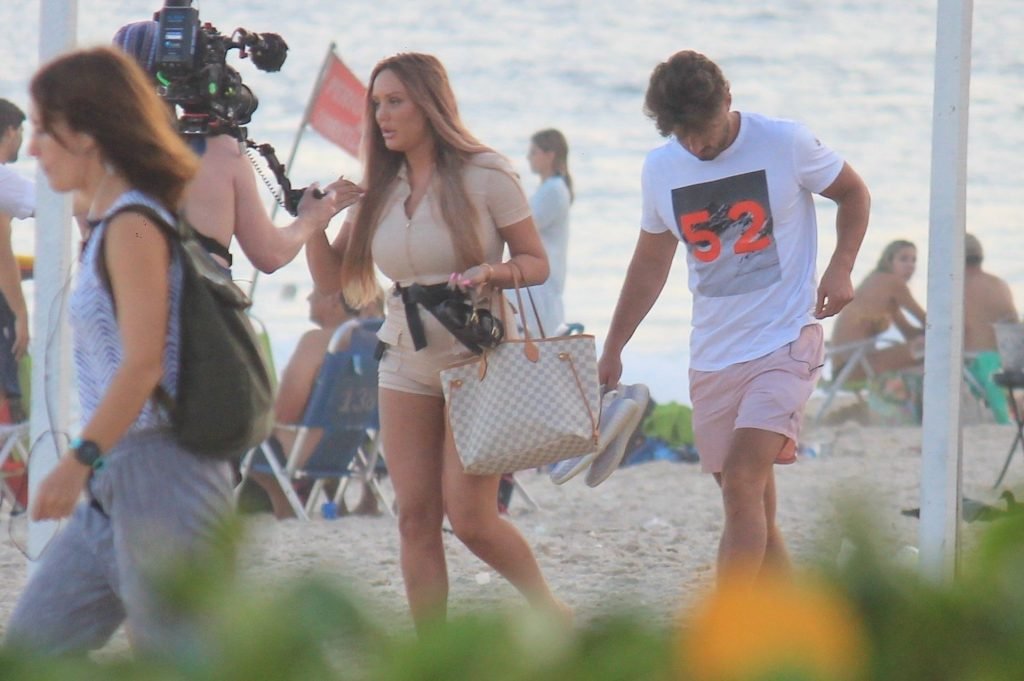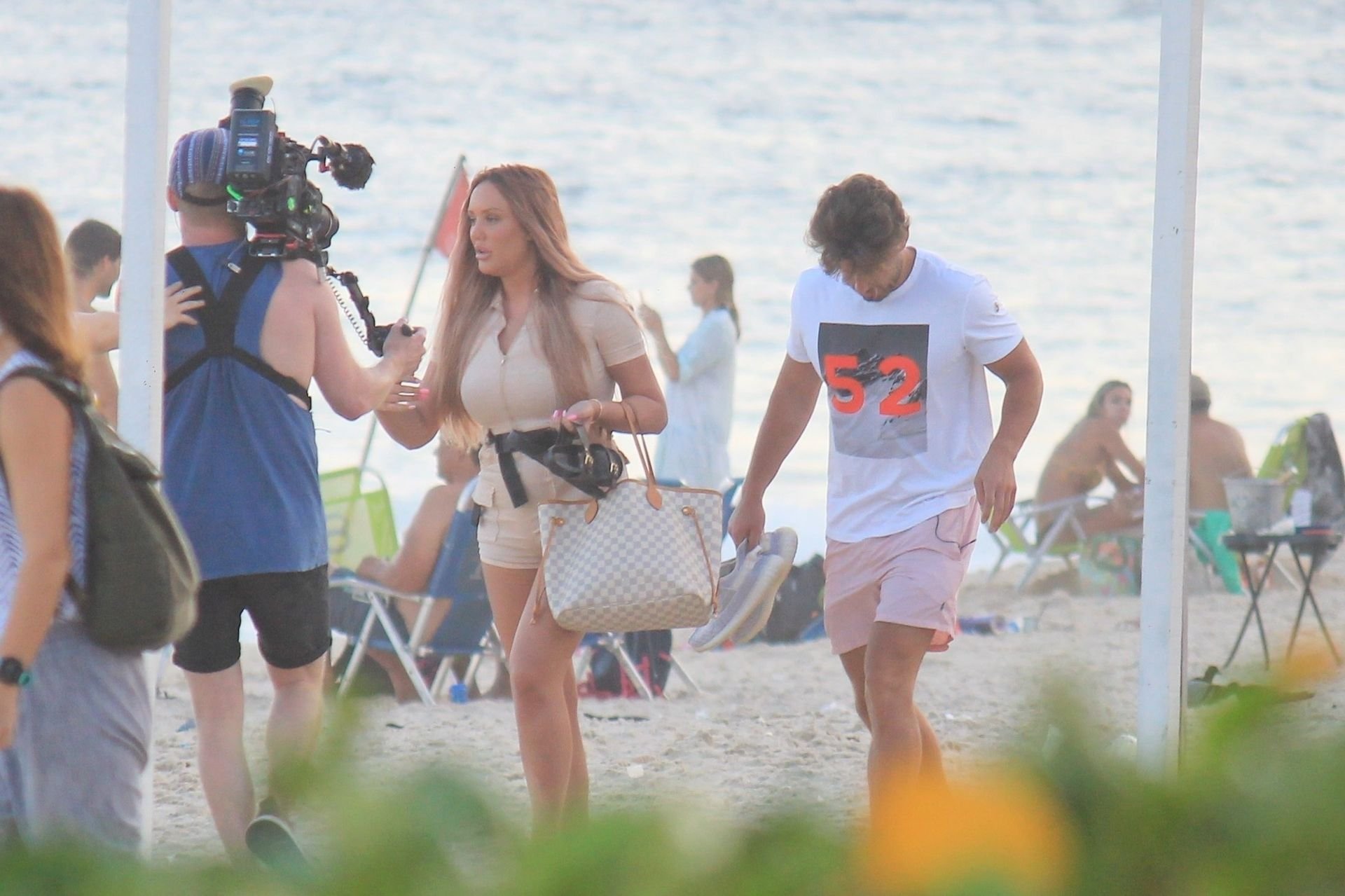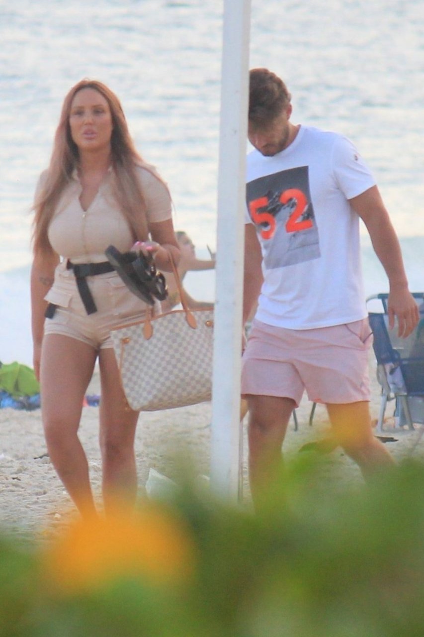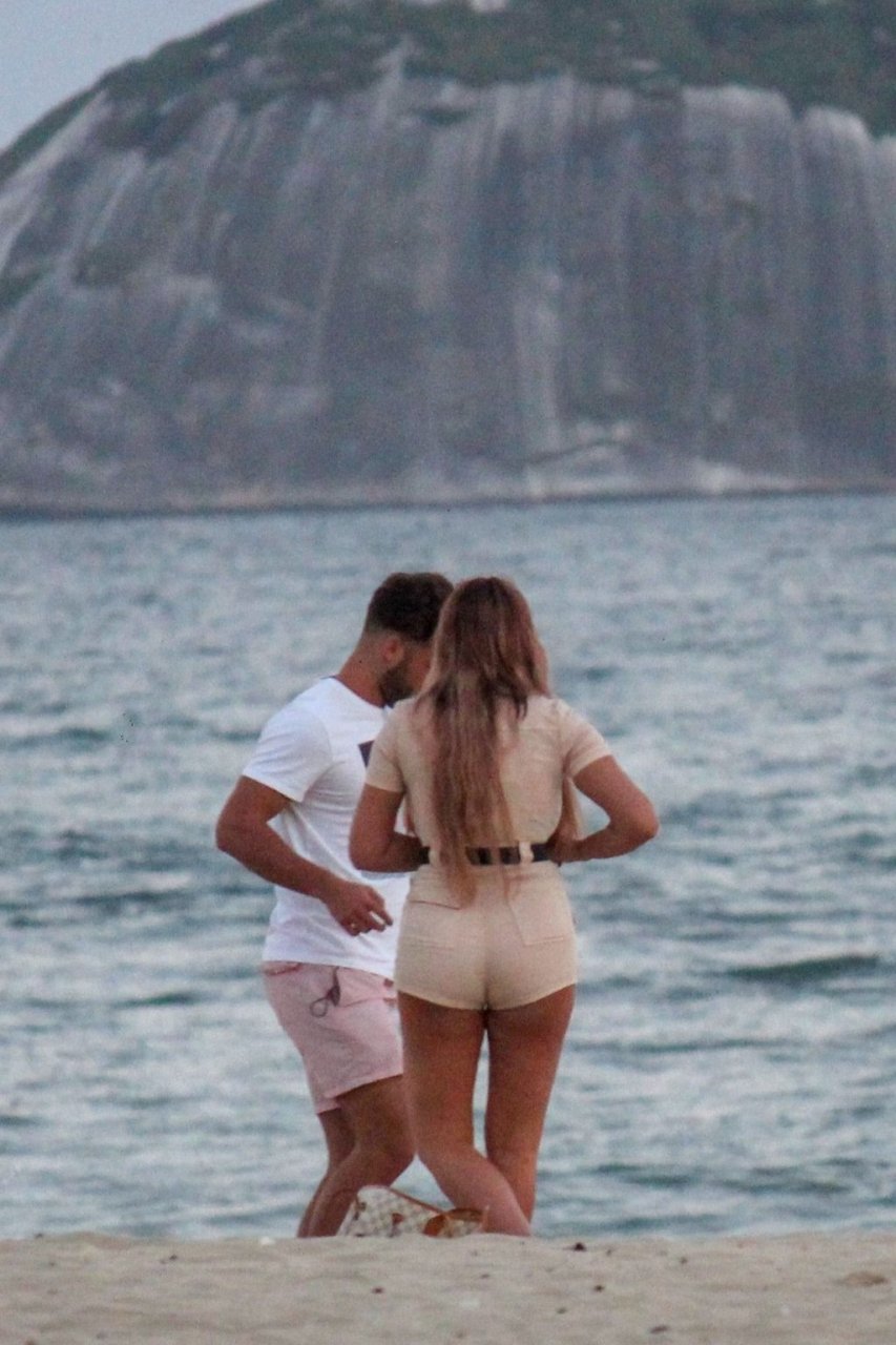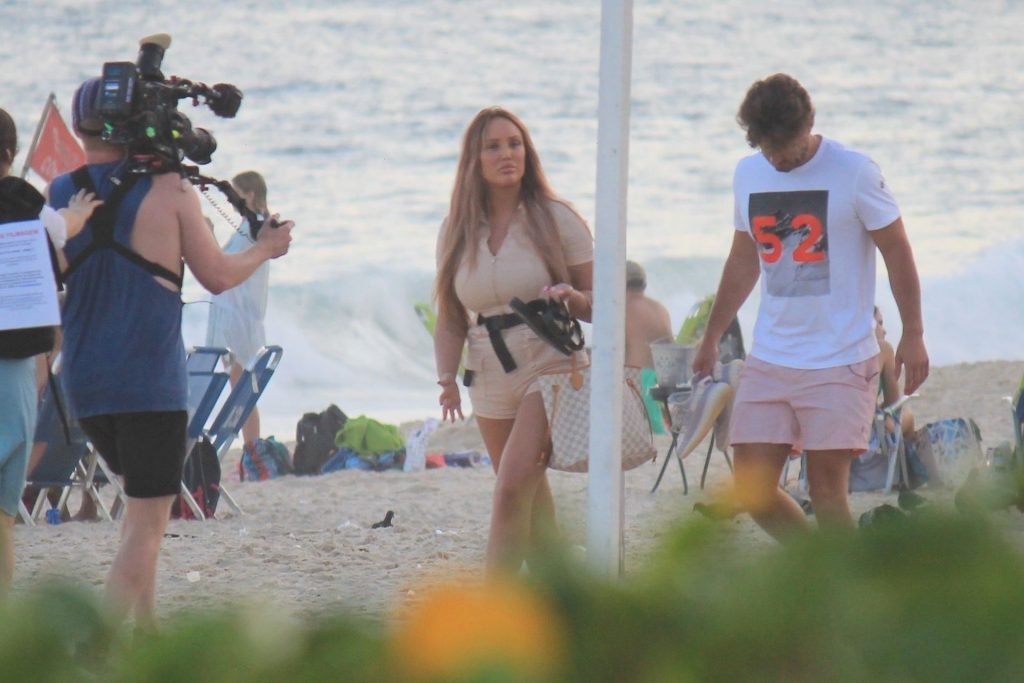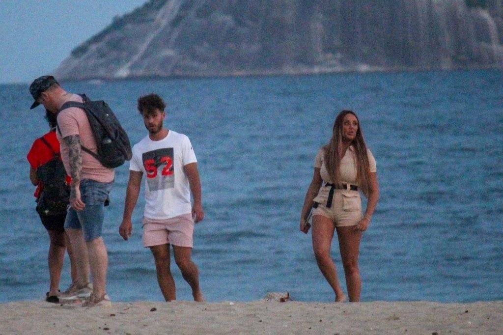 Charlotte Crosby e il suo uomo Joshua Ritchie si scaldano durante un romantico viaggio in spiaggia a Rio De Janeiro, 25/04/2019. Charlotte e Josh si scambiano effusioni mentre un fotografo cattura il momento. La figura di Charlotte appare incredibile con i pantaloncini color bronzo.