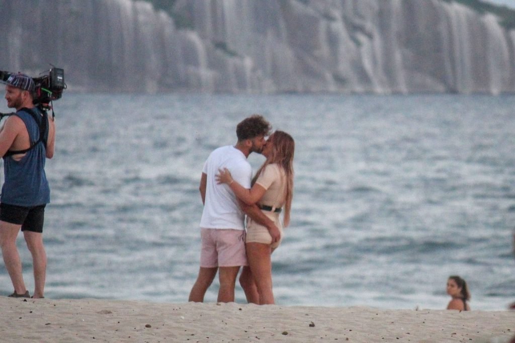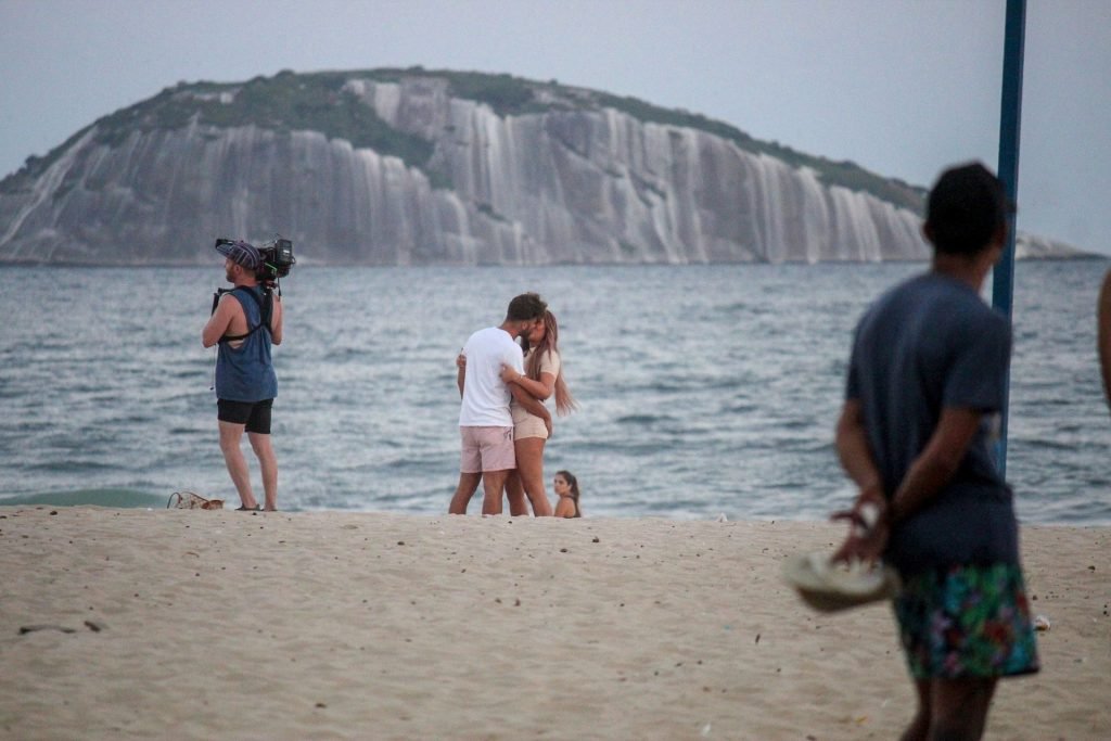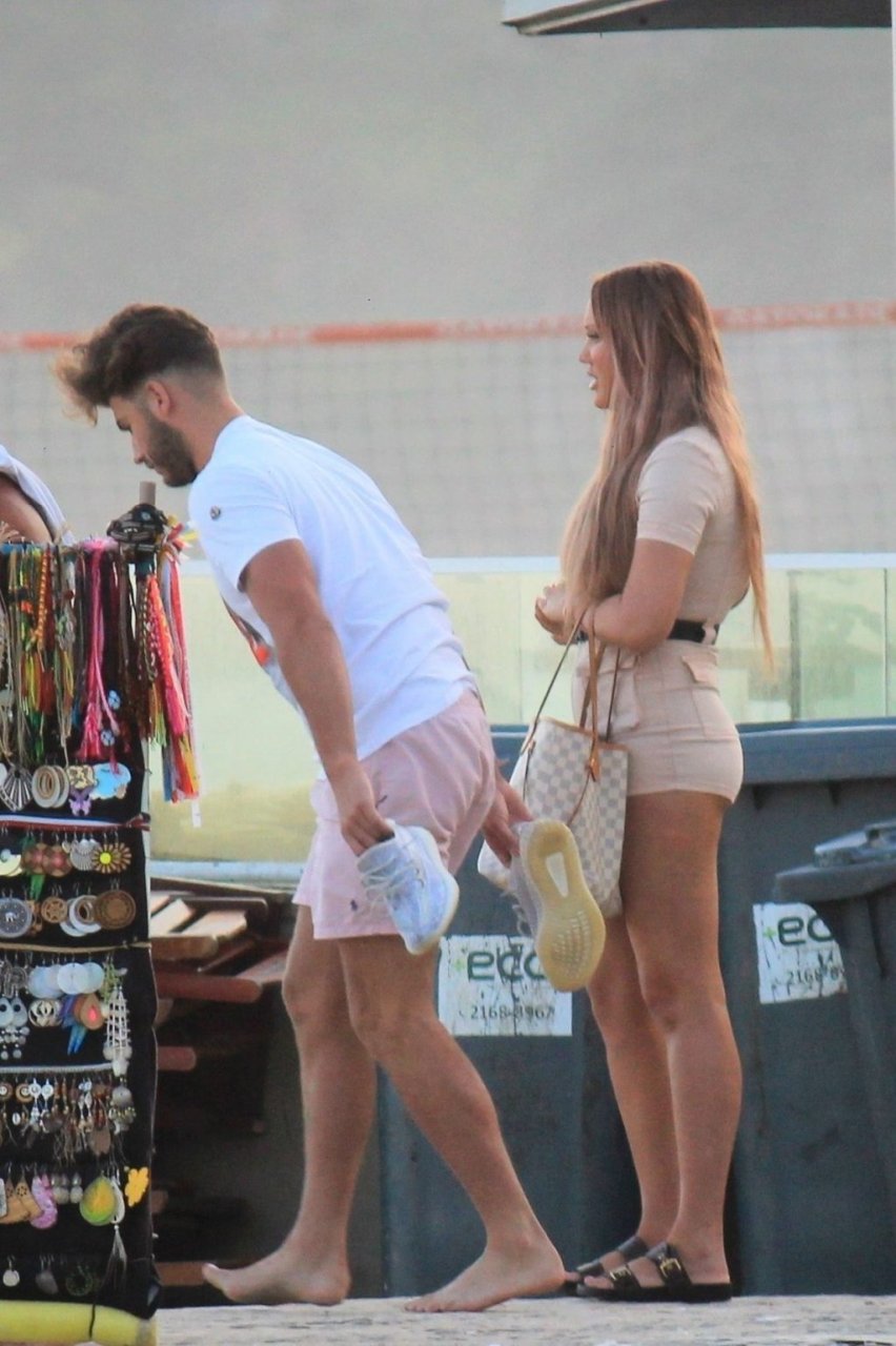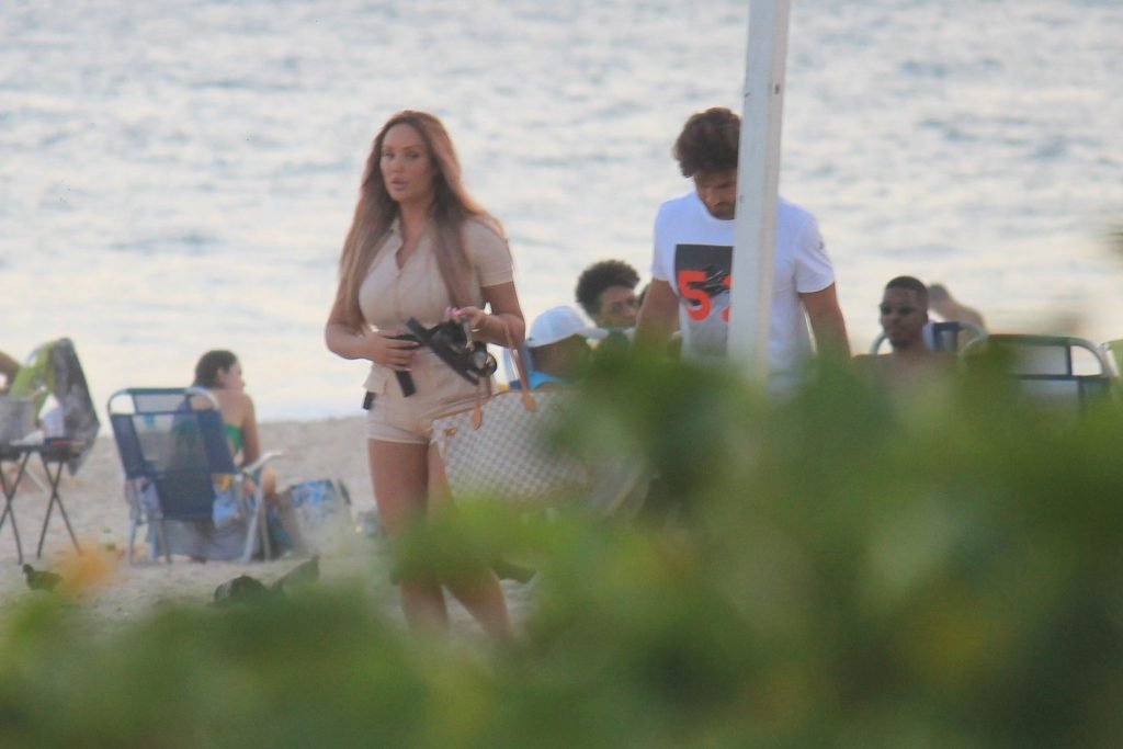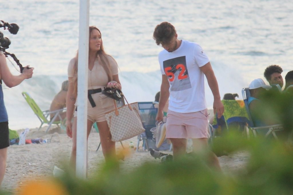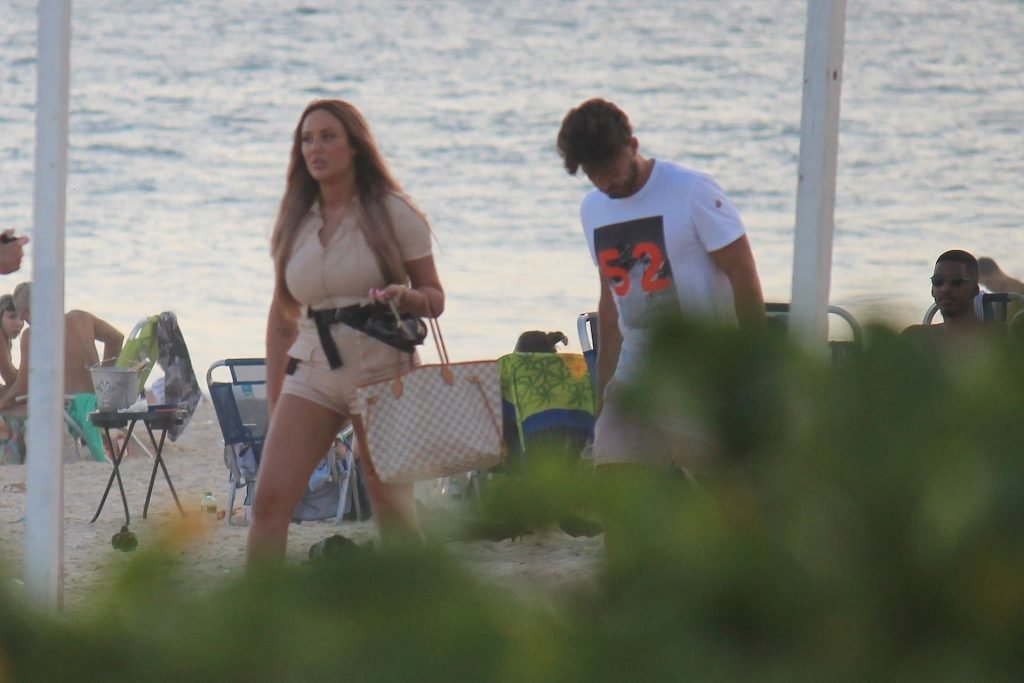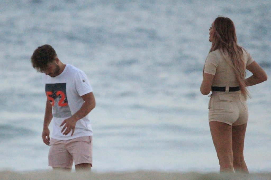 Charlotte Crosby e il suo uomo Joshua Ritchie si scaldano durante un romantico viaggio in spiaggia a Rio De Janeiro, 25/04/2019. Charlotte e Josh si scambiano effusioni mentre un fotografo cattura il momento. La figura di Charlotte appare incredibile con i pantaloncini color bronzo.