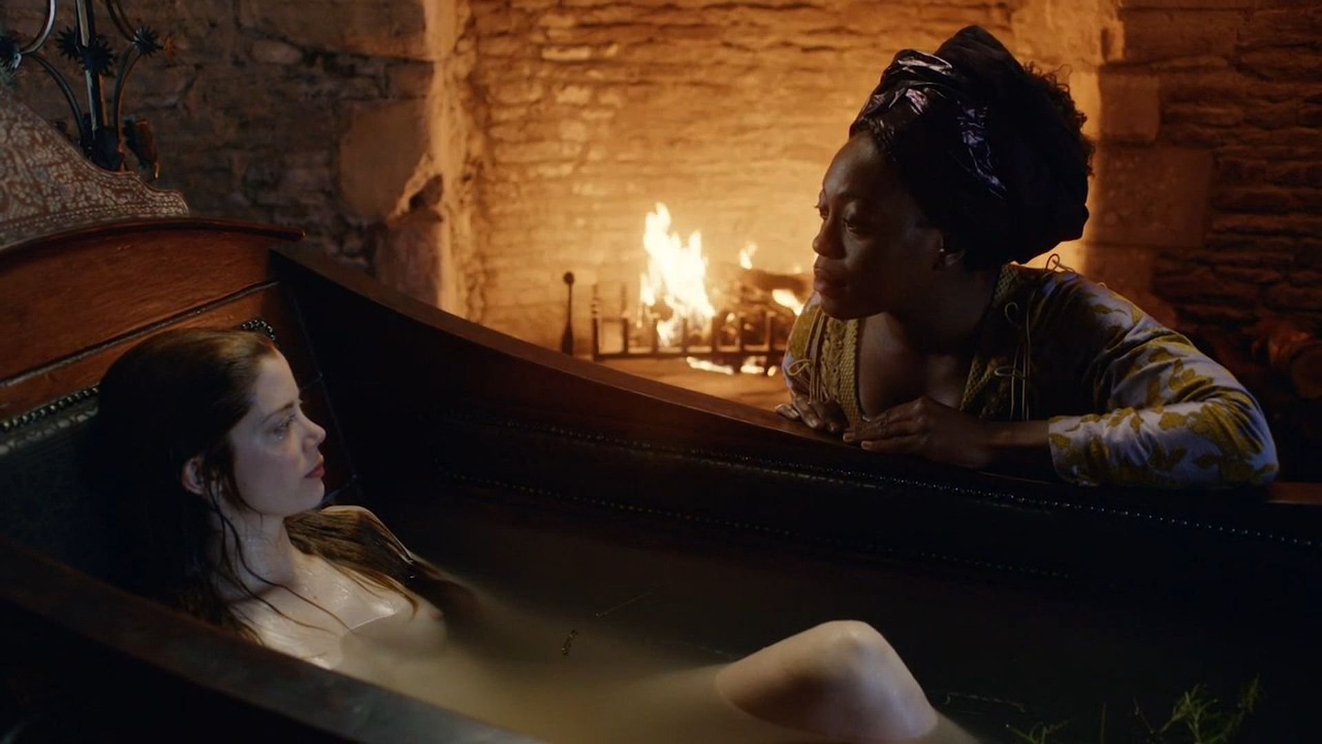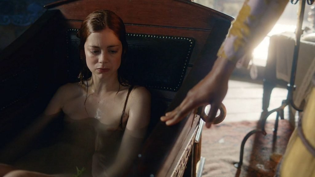 Charlotte Hope si spoglia in “The Spanish Princess” (2019) Stagione 1 Episodio 1 (s01e01). Charlotte è seduta in una vasca da bagno, quasi mostrando i suoi seni quando si immerge sott’acqua e poi si rialza. Possiamo vedere il suo sedere e i piccoli seni quando si alza in piedi.
