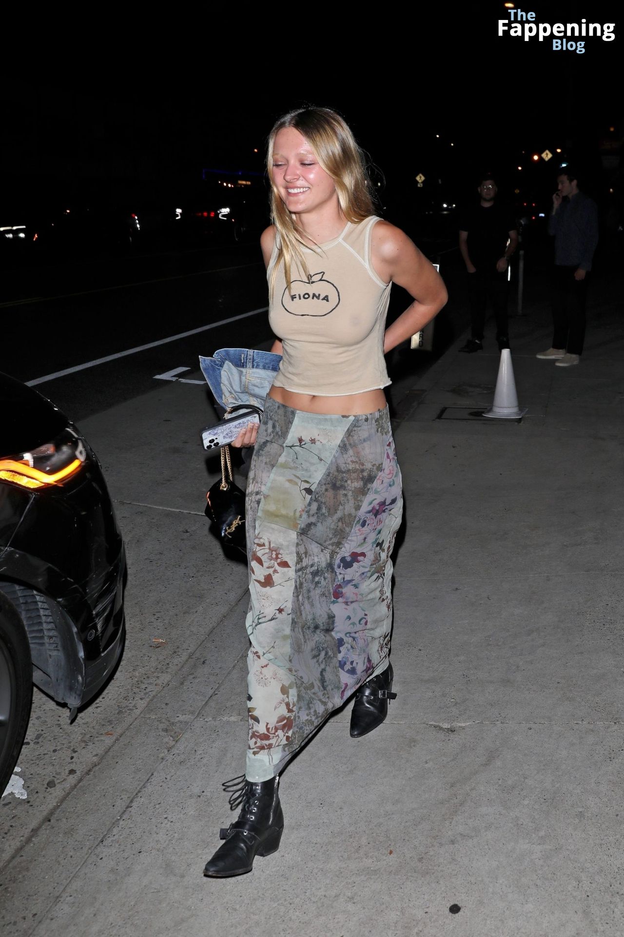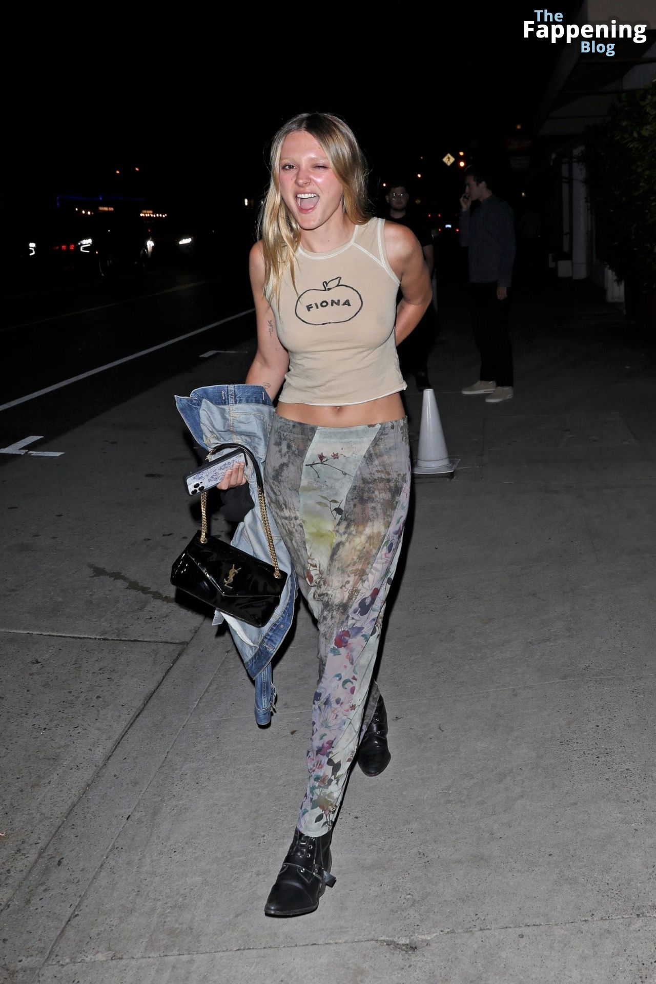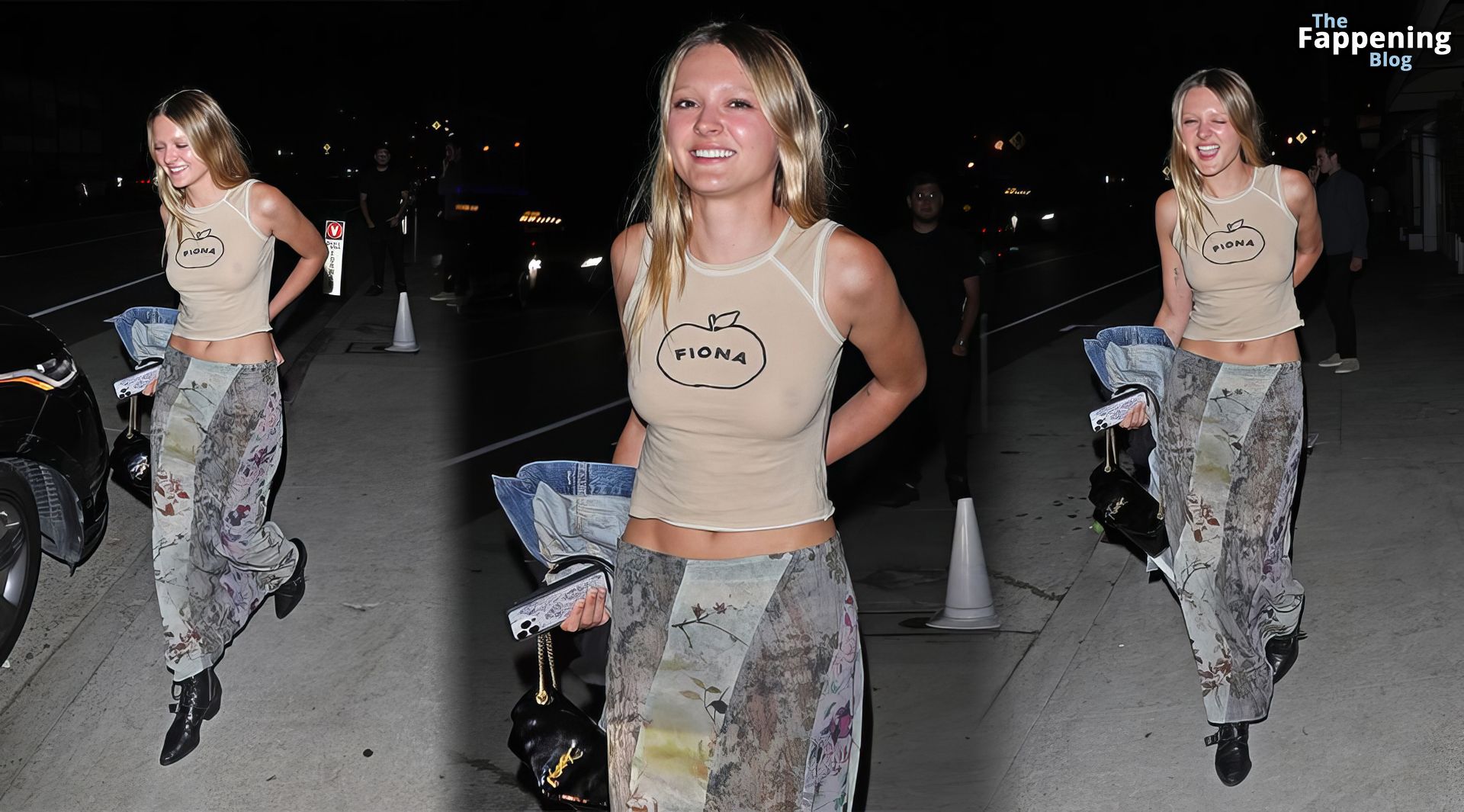 La cantante Charlotte Lawrence è tutta sorrisi mentre viene vista indossare un top trasparente, facendo un saluto alla collega cantante Fiona Apple dopo aver mangiato al ristorante italiano Giorgio Baldi a Santa Monica.