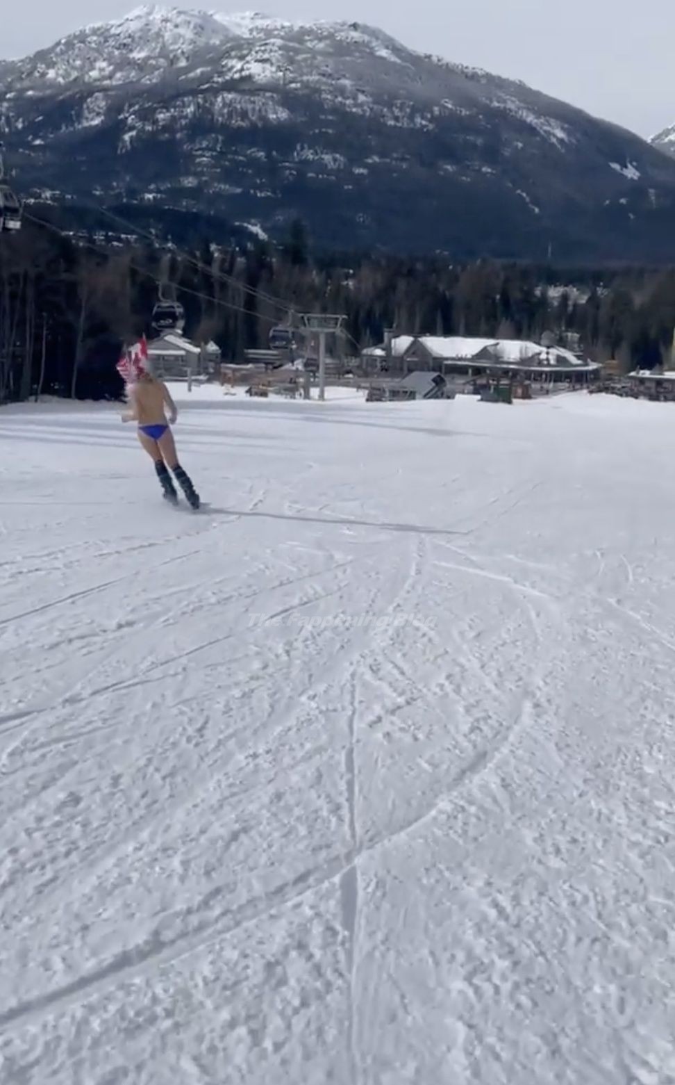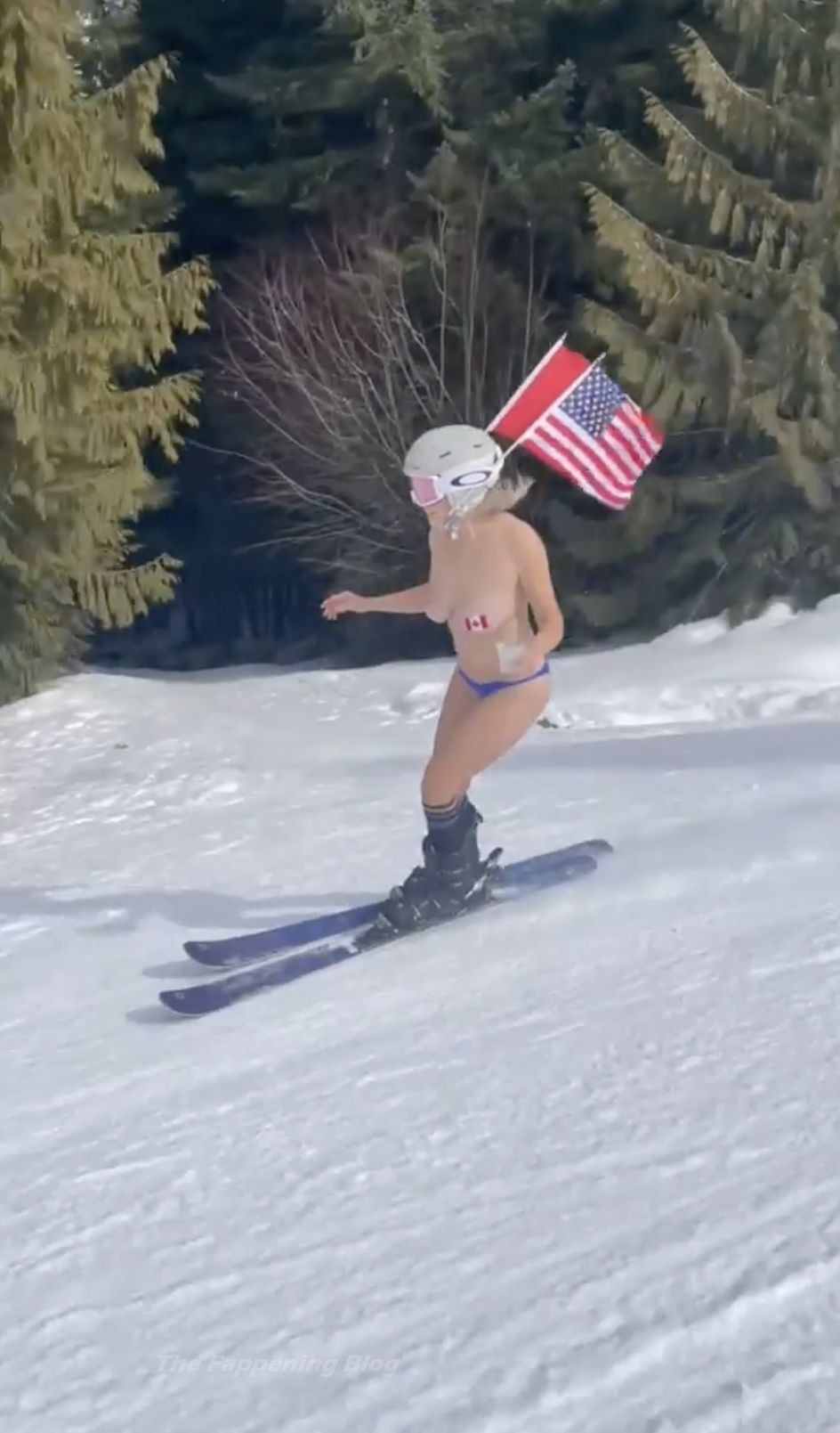 Comica Chelsea Handler si gode una giornata sugli sci quasi nuda, coprendo i suoi seni nudi con adesivi del Canada e degli Stati Uniti – Instagram, 25/02/2021.