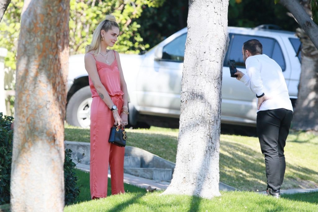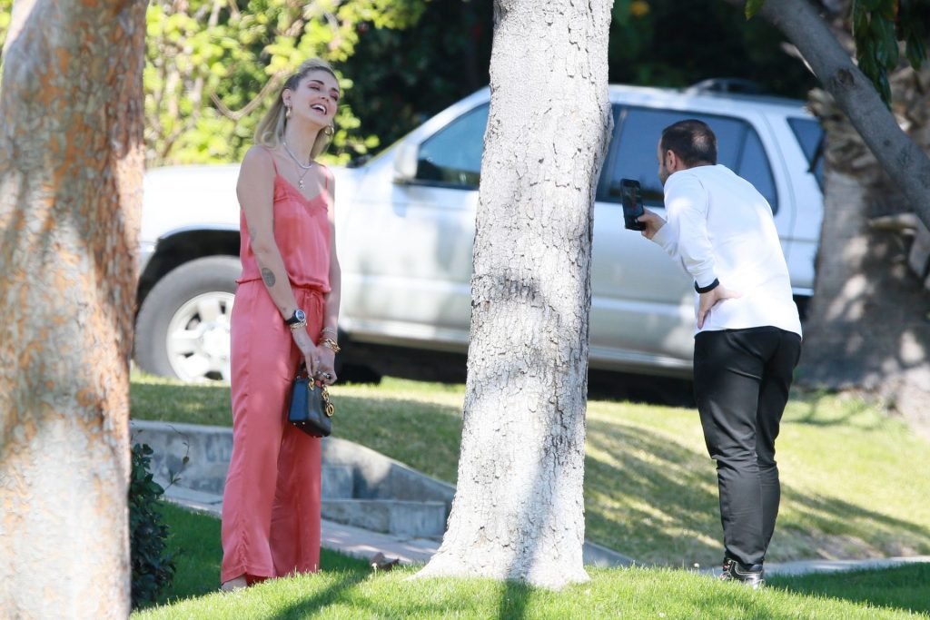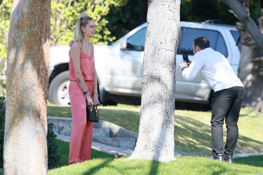 Chiara Ferragni indossa una tuta rosa Intimissimi mentre posa per alcune foto a West Hollywood, 22/02/2019.
