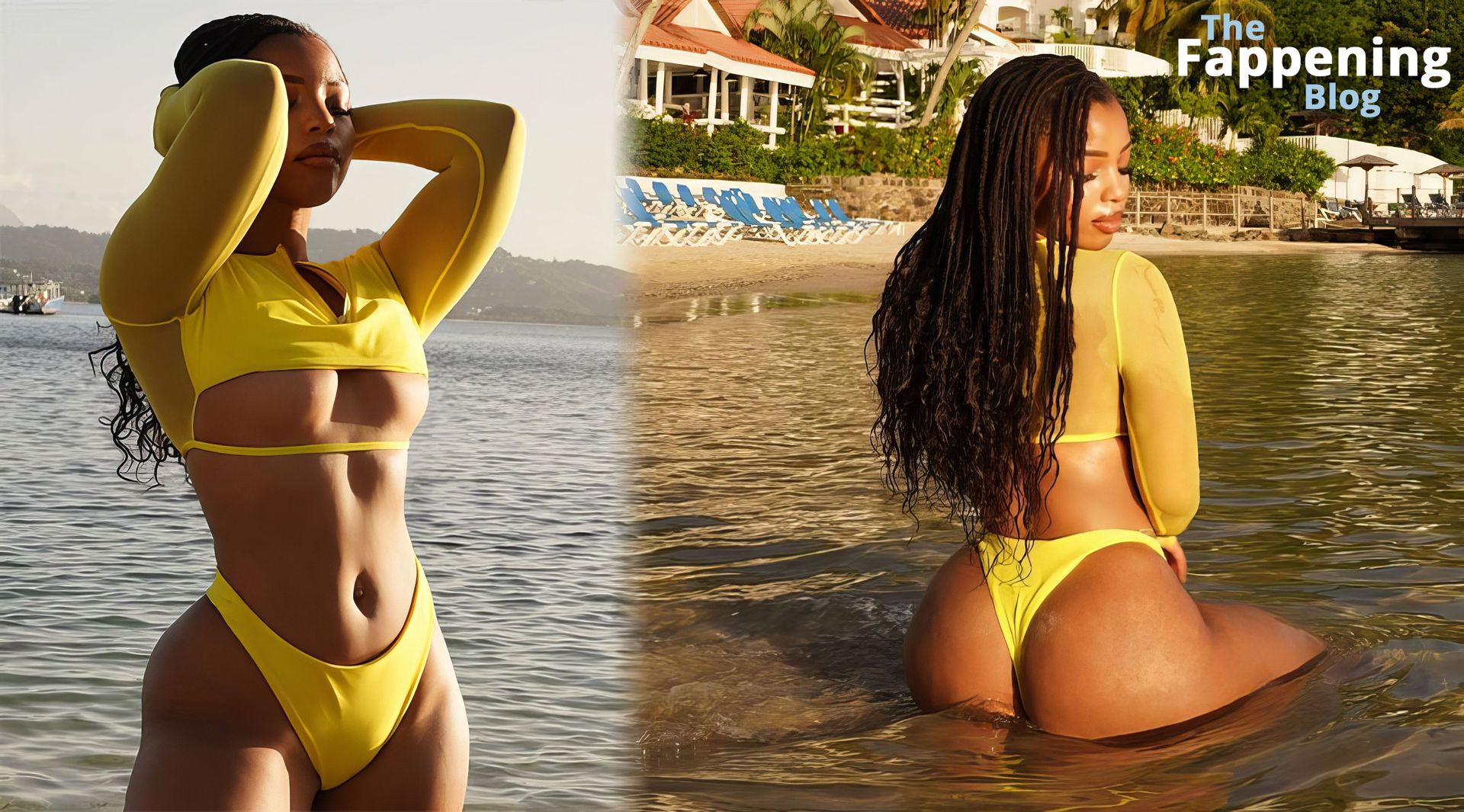 Avvicinati e scopri il suo fondoschiena impeccabile, messo in mostra in un sexy due pezzi giallo che è in una lega a sé stante.