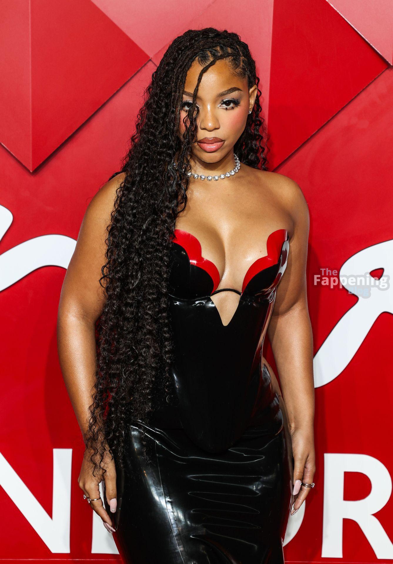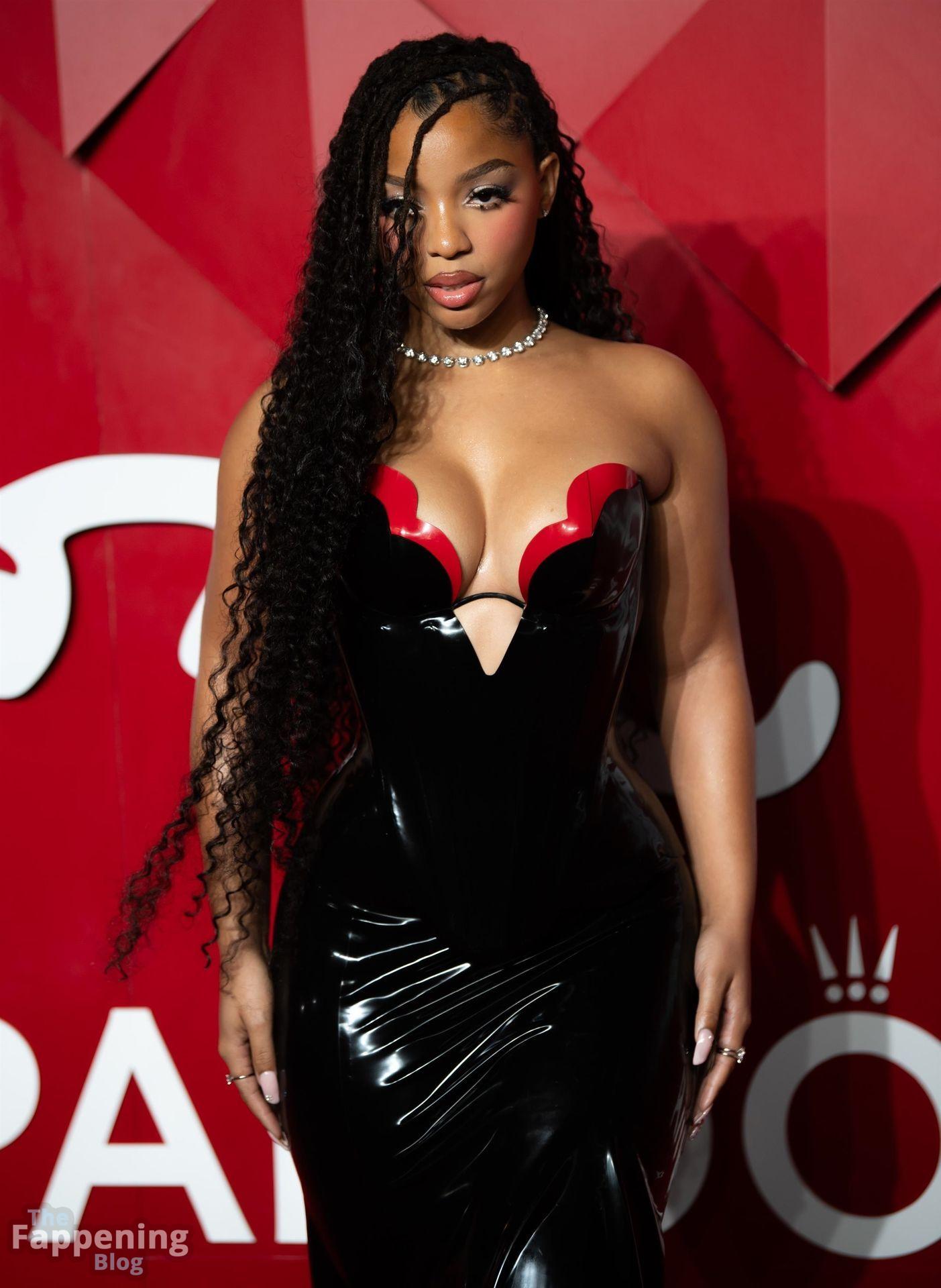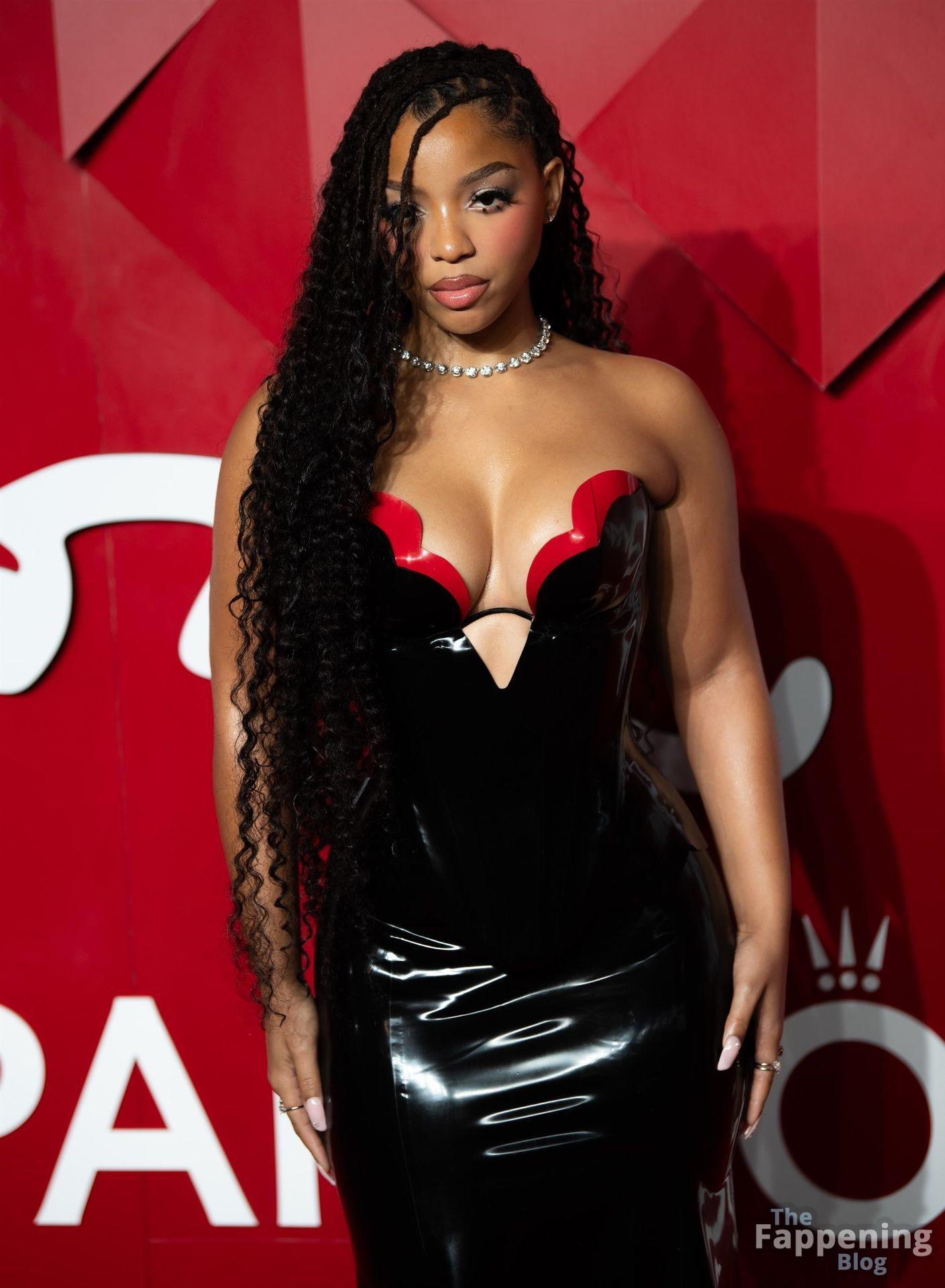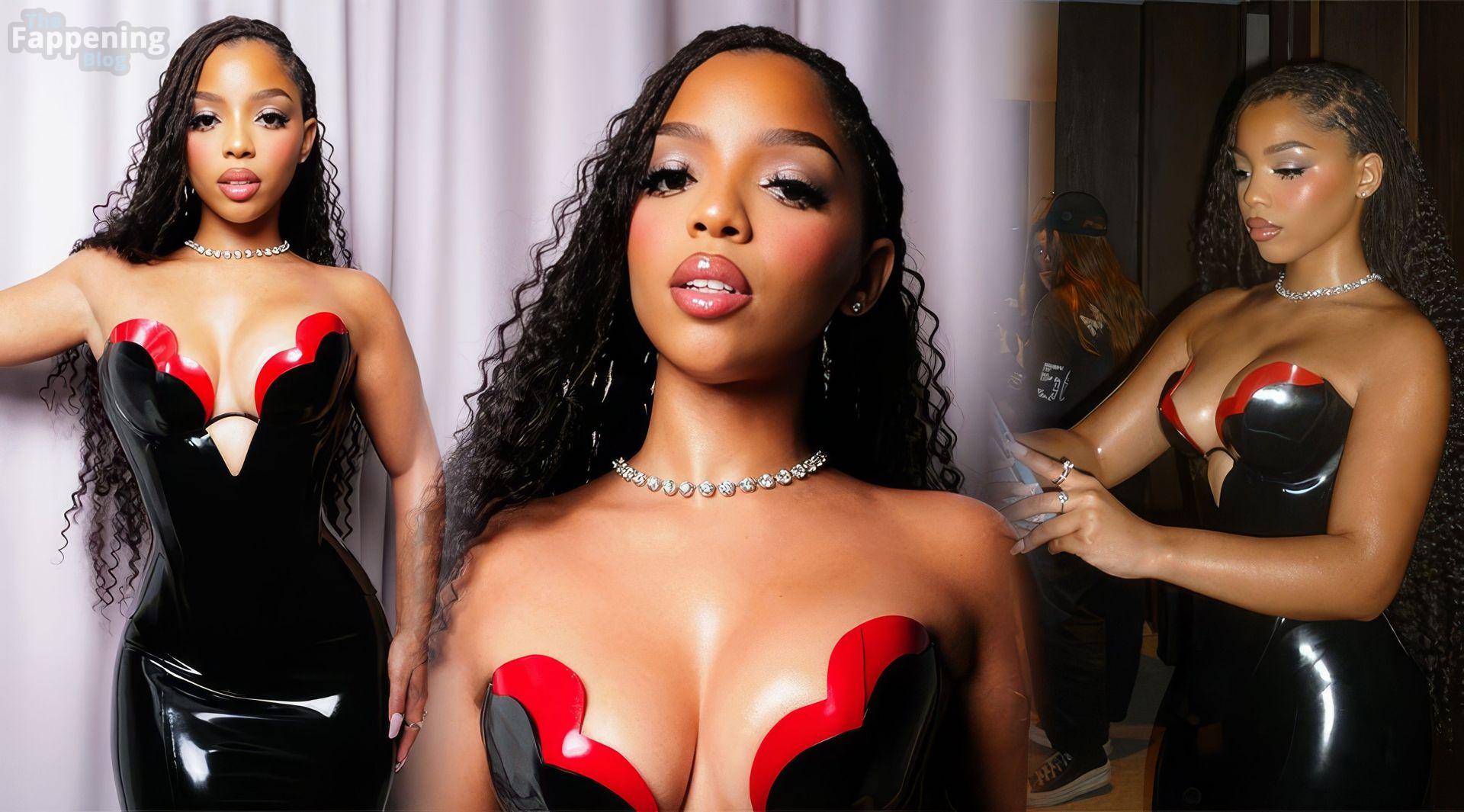 Chloe Bailey è stata fotografata con un audace abito in pelle nero e rosso che mette in risalto tutte le sue curve e il décolleté.