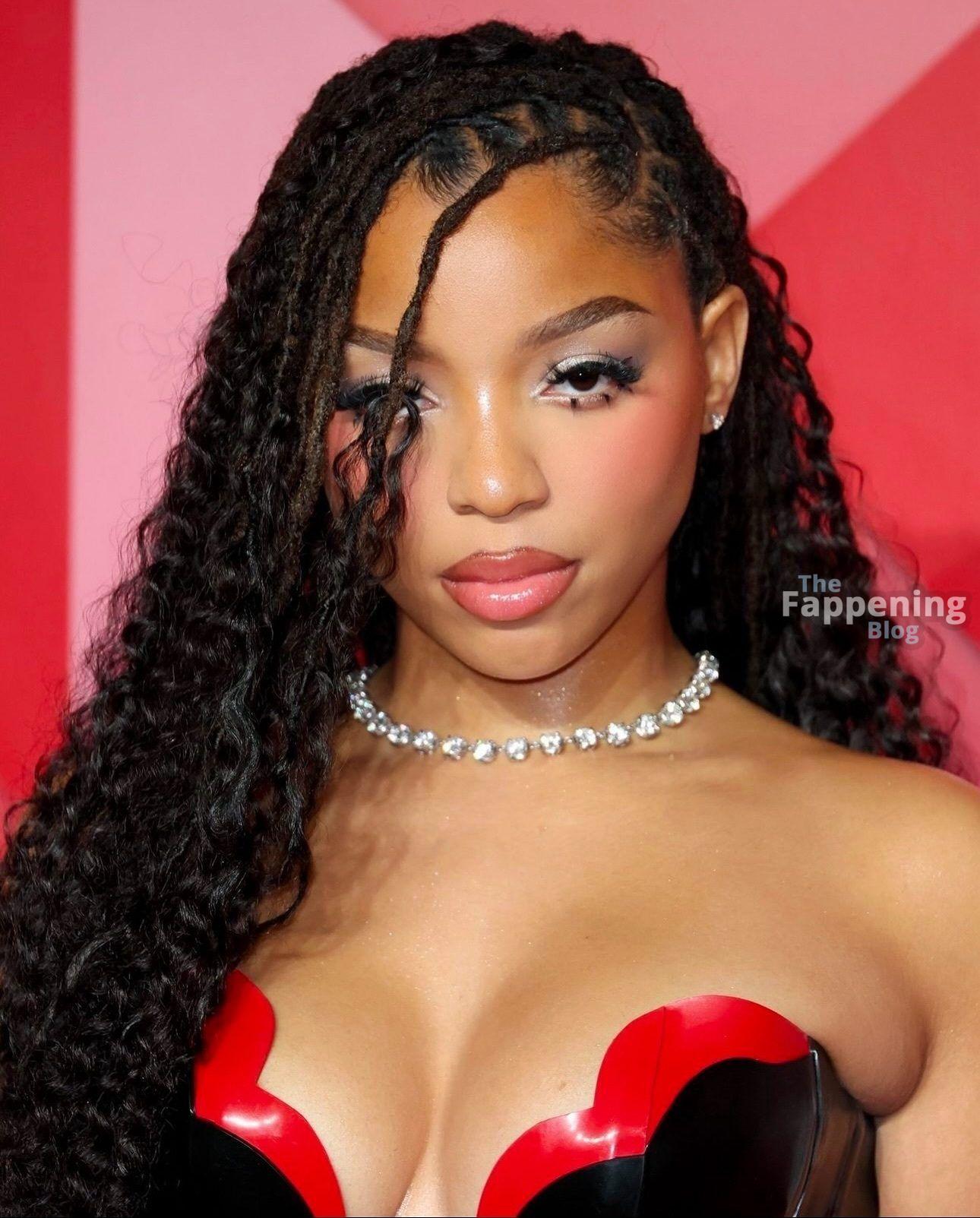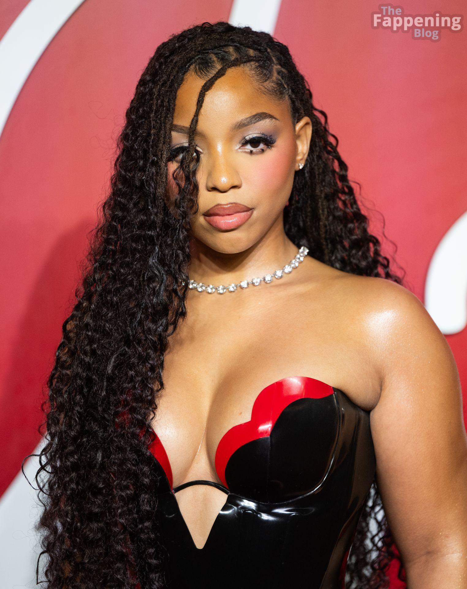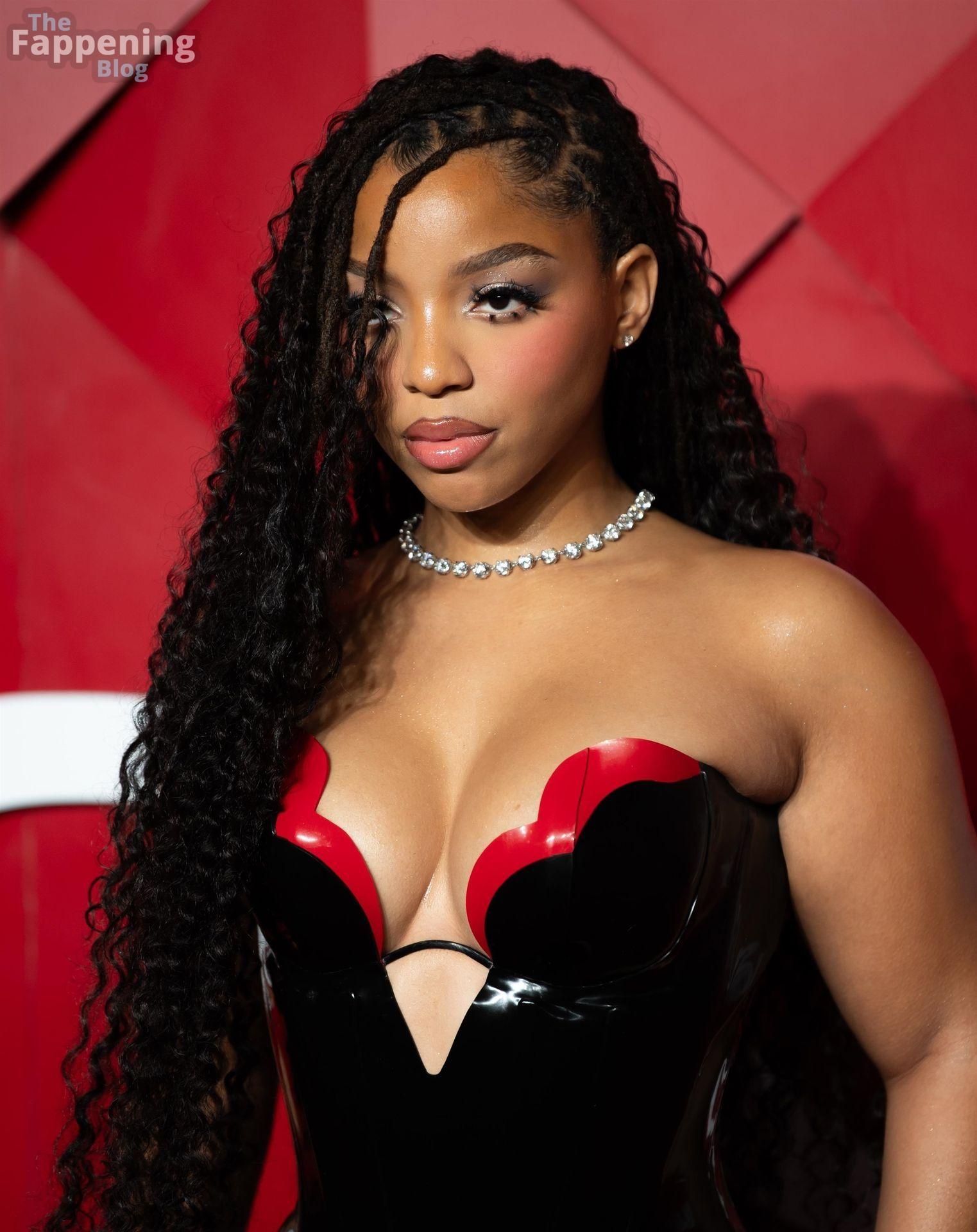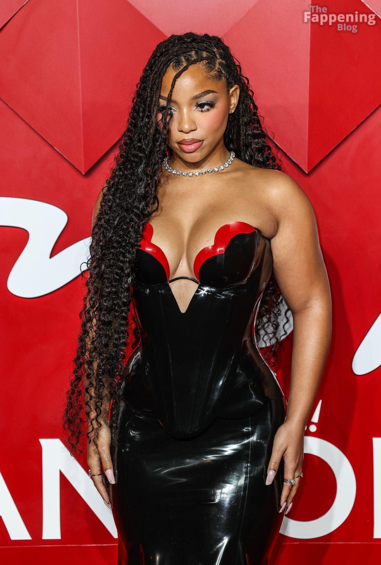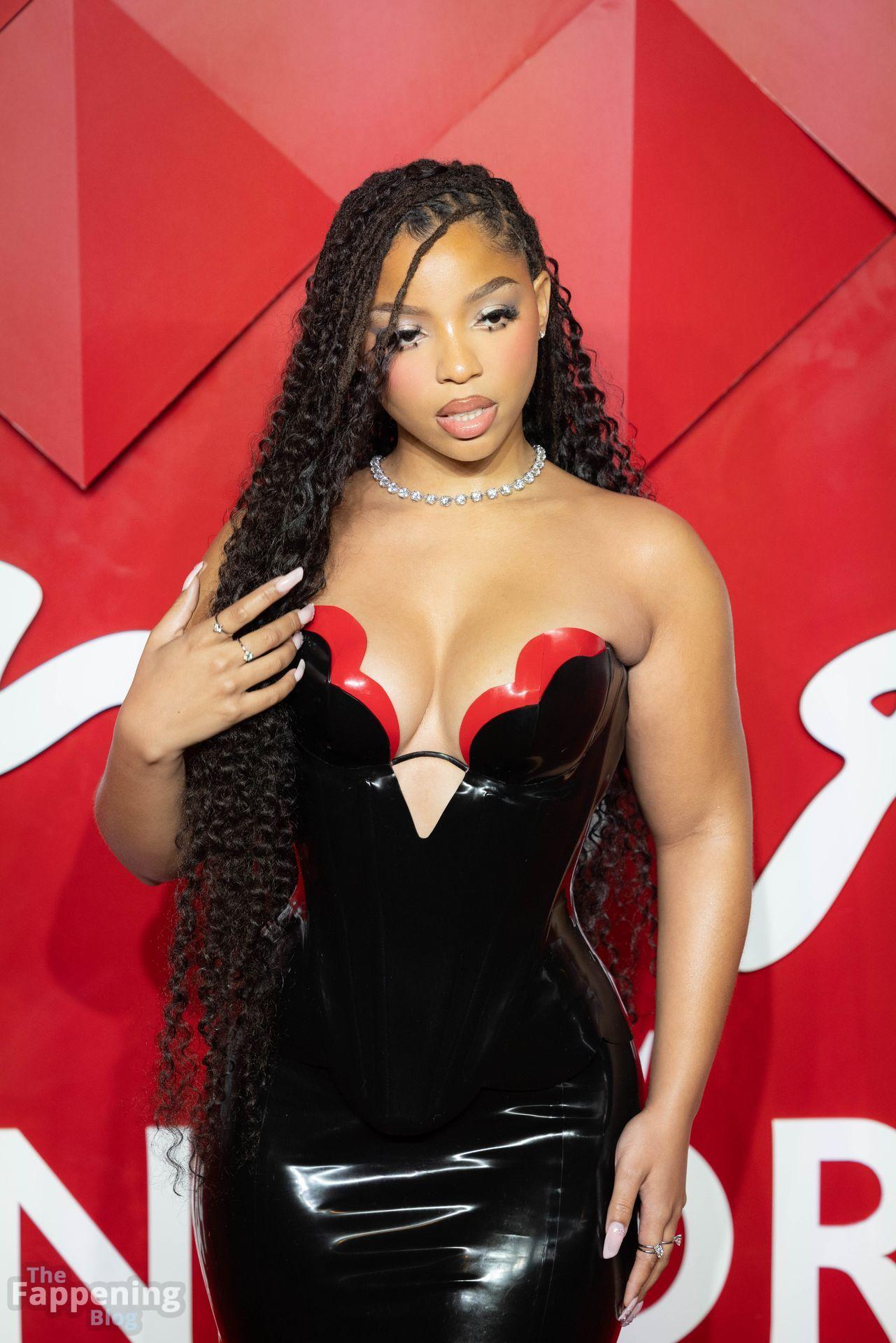 Chloe Bailey è stata fotografata con un audace abito in pelle nero e rosso che mette in risalto tutte le sue curve e il décolleté.