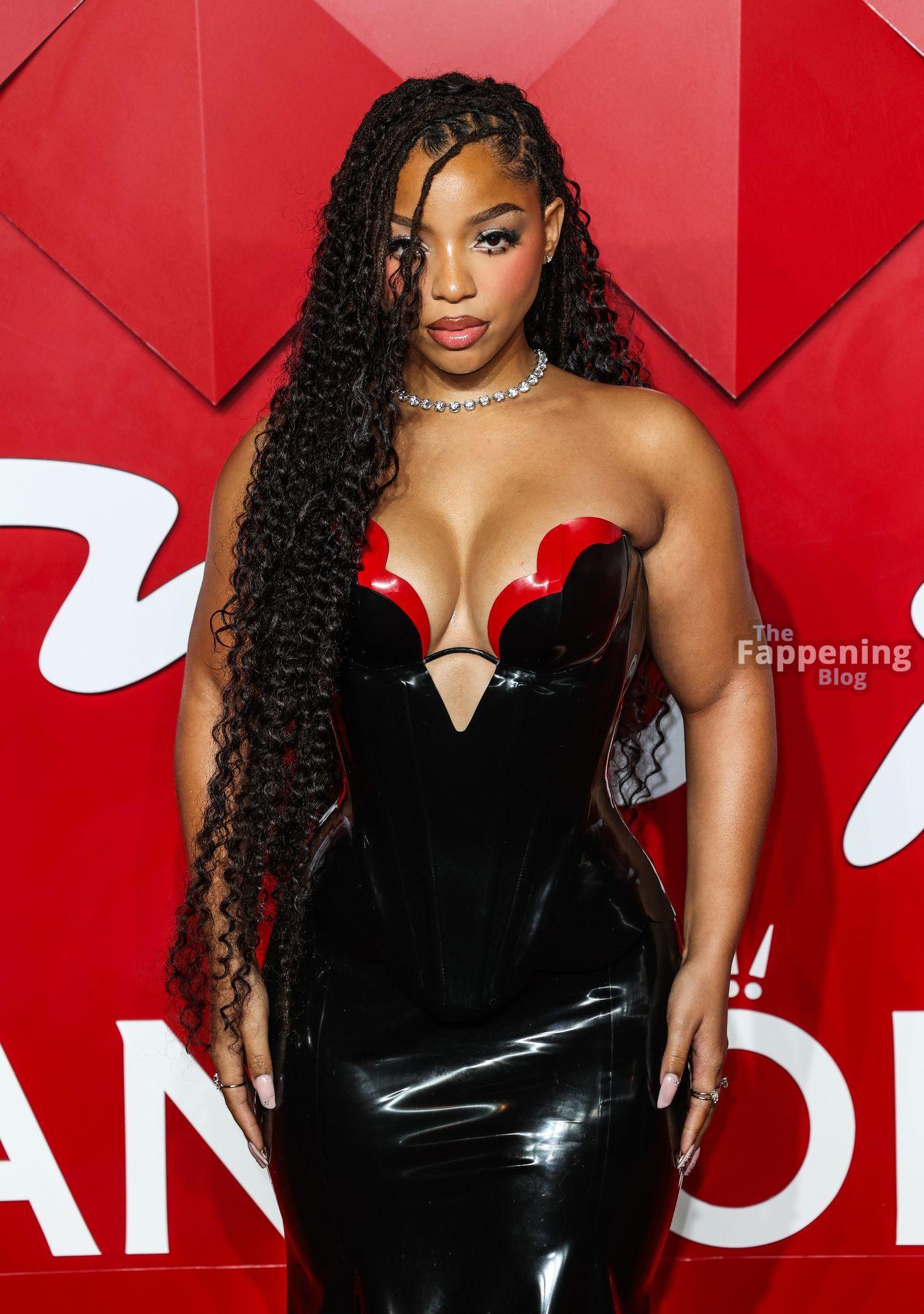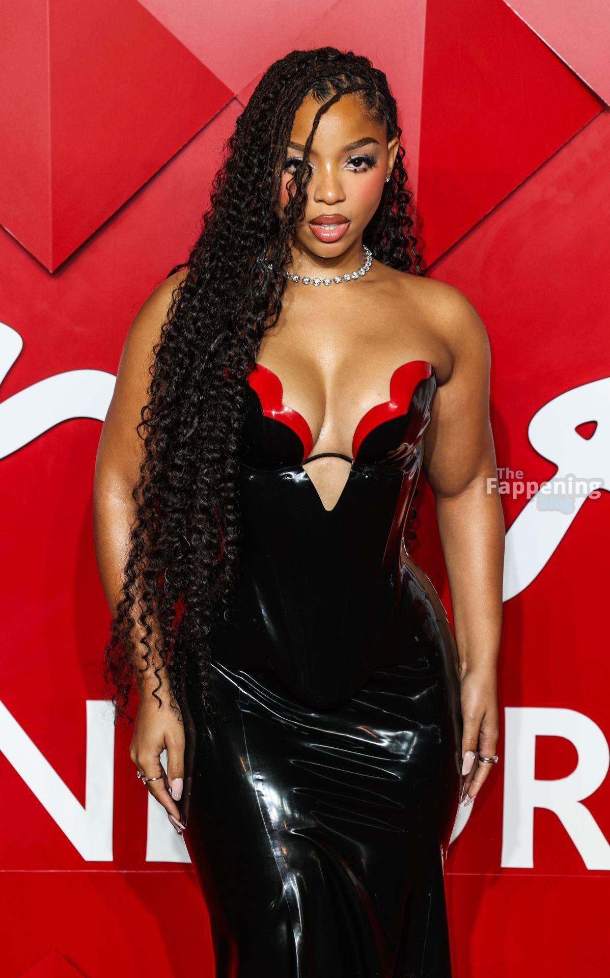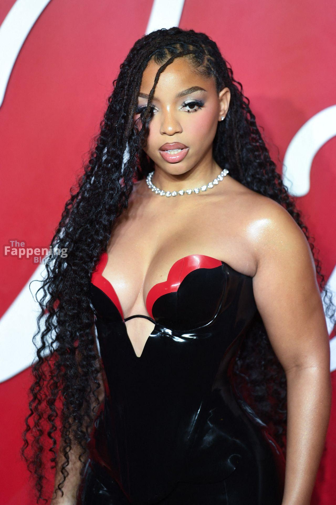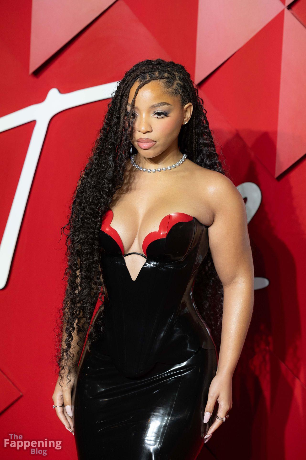 Chloe Bailey è stata fotografata con un audace abito in pelle nero e rosso che mette in risalto tutte le sue curve e il décolleté.
