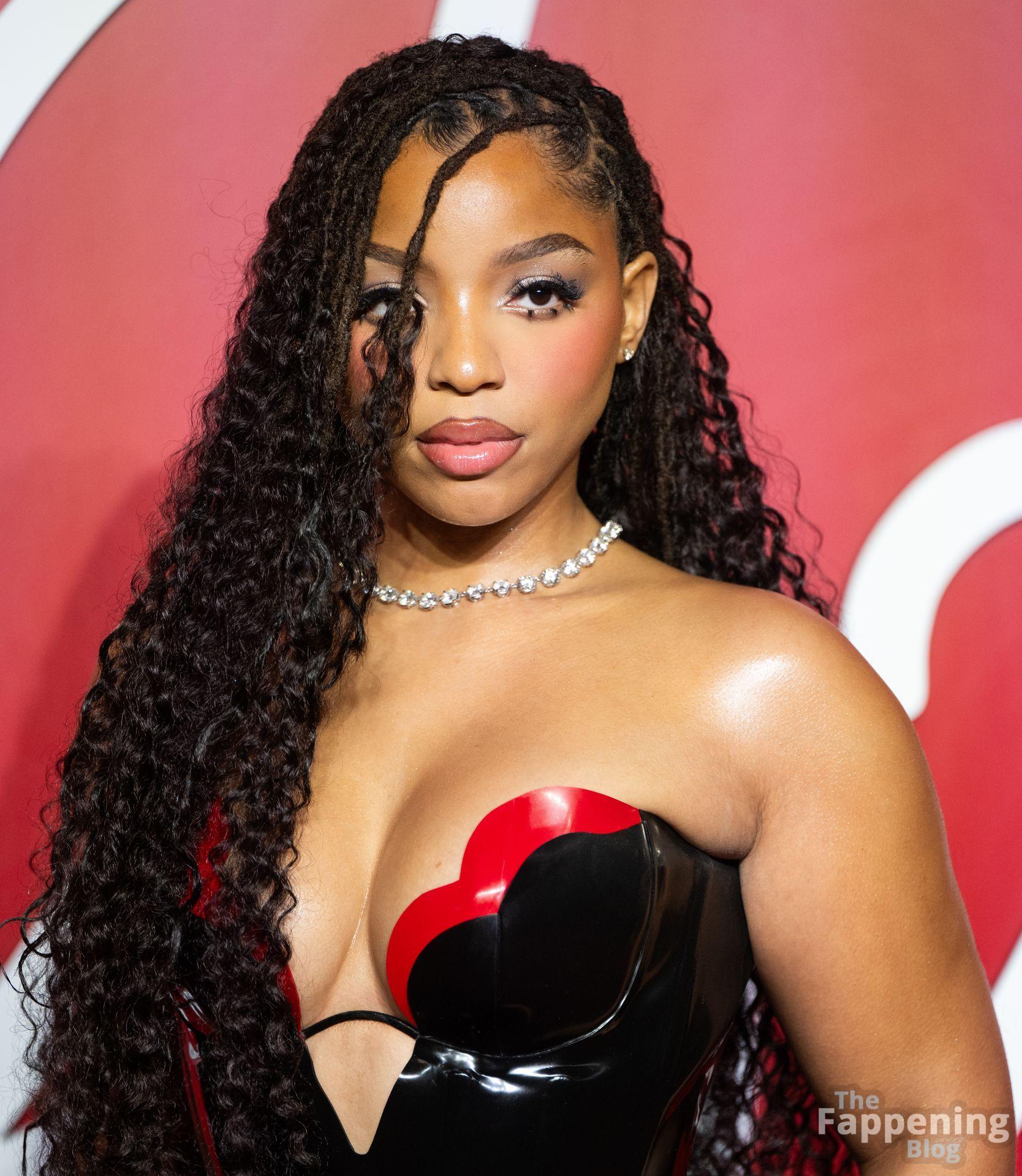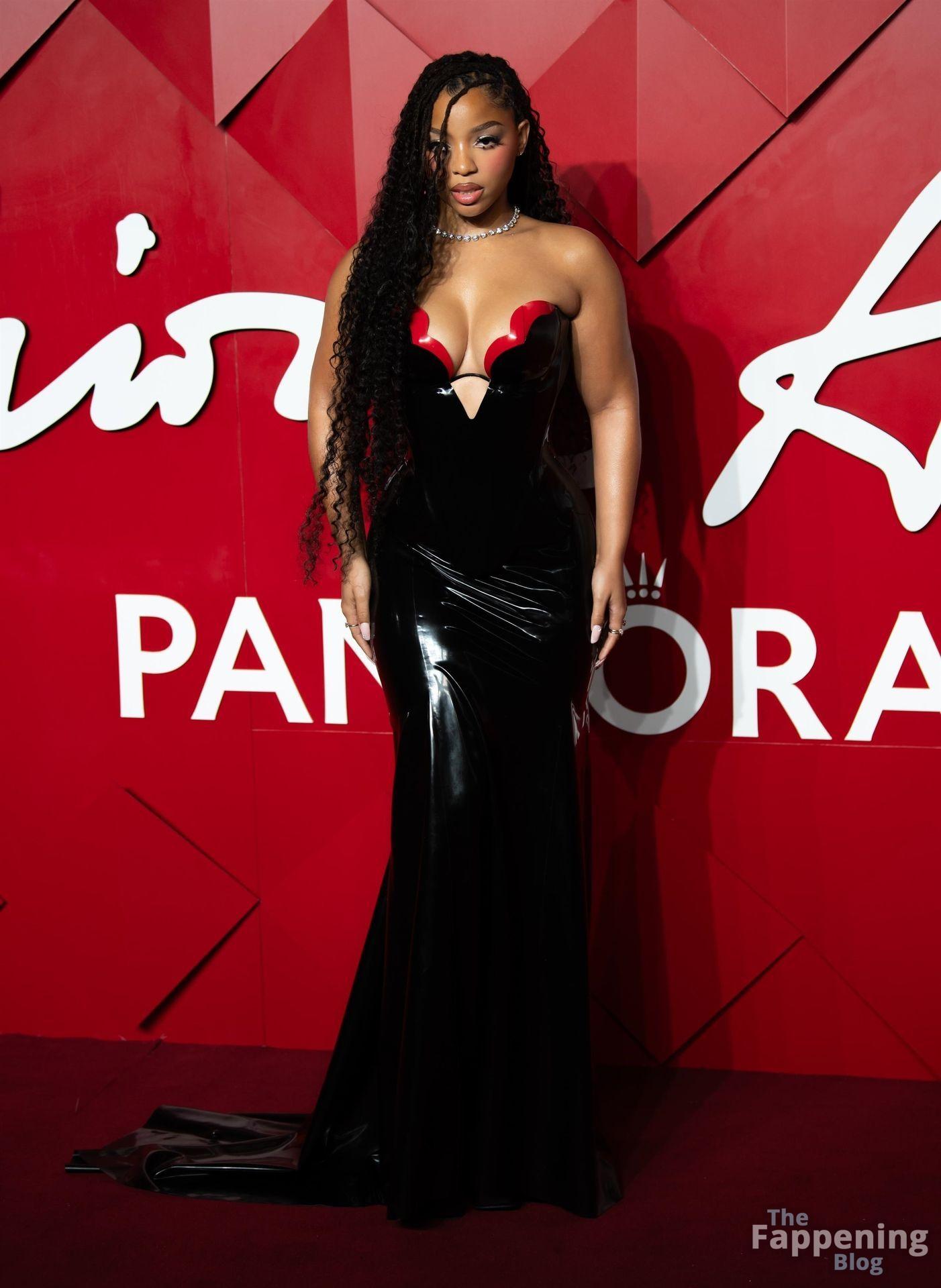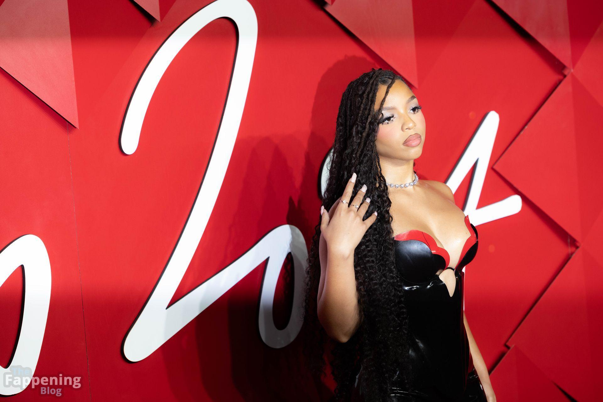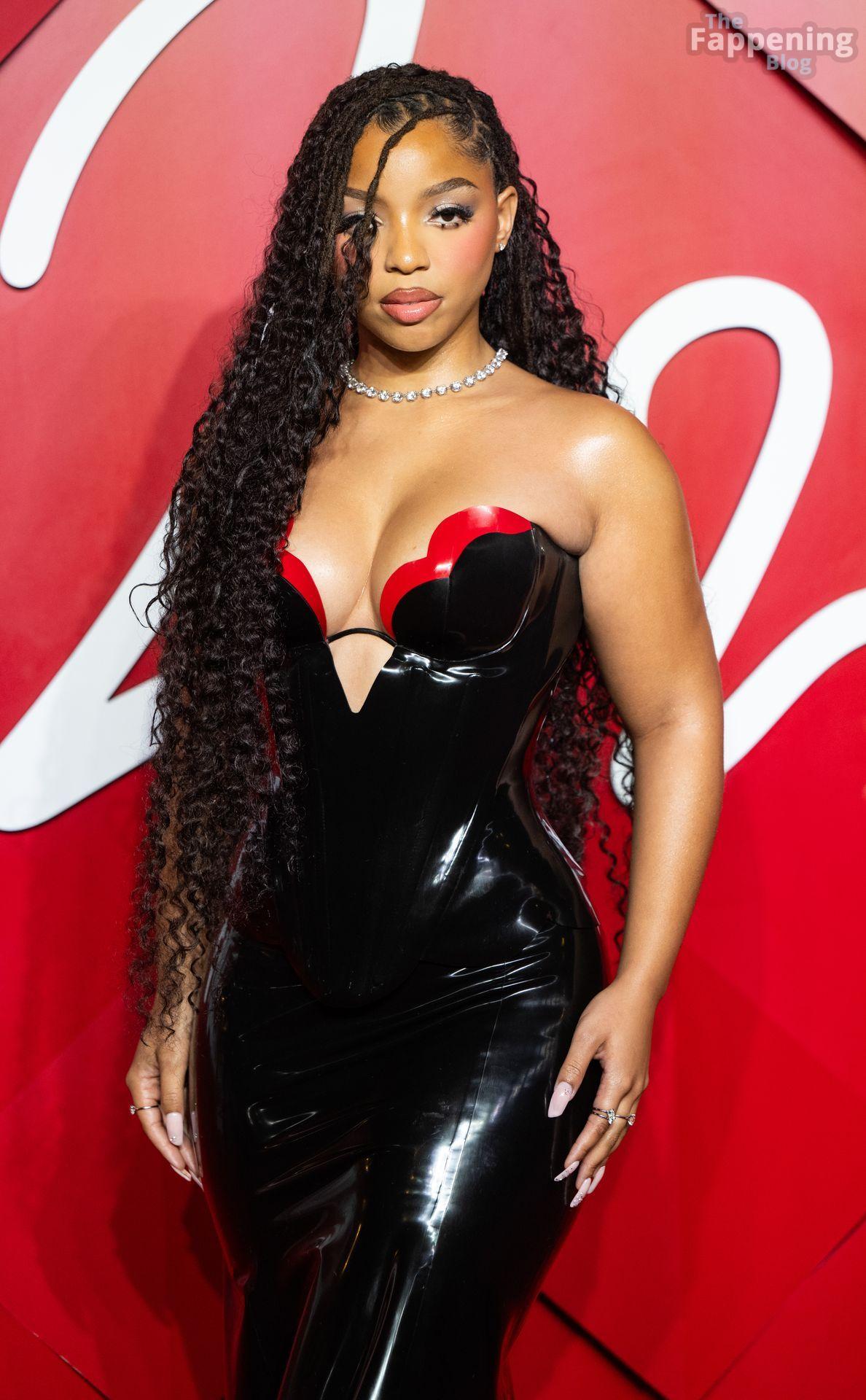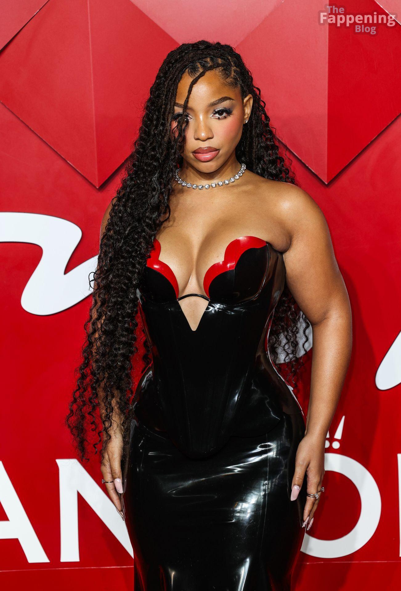 Chloe Bailey è stata fotografata con un audace abito in pelle nero e rosso che mette in risalto tutte le sue curve e il décolleté.