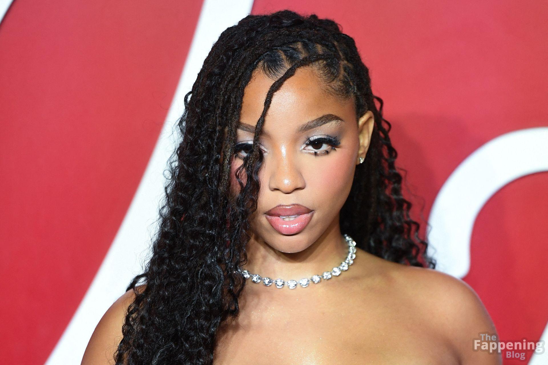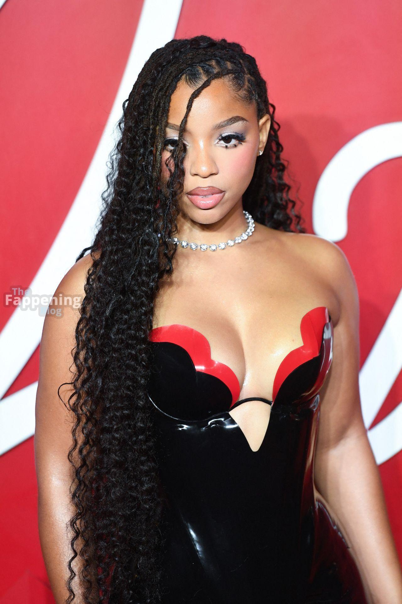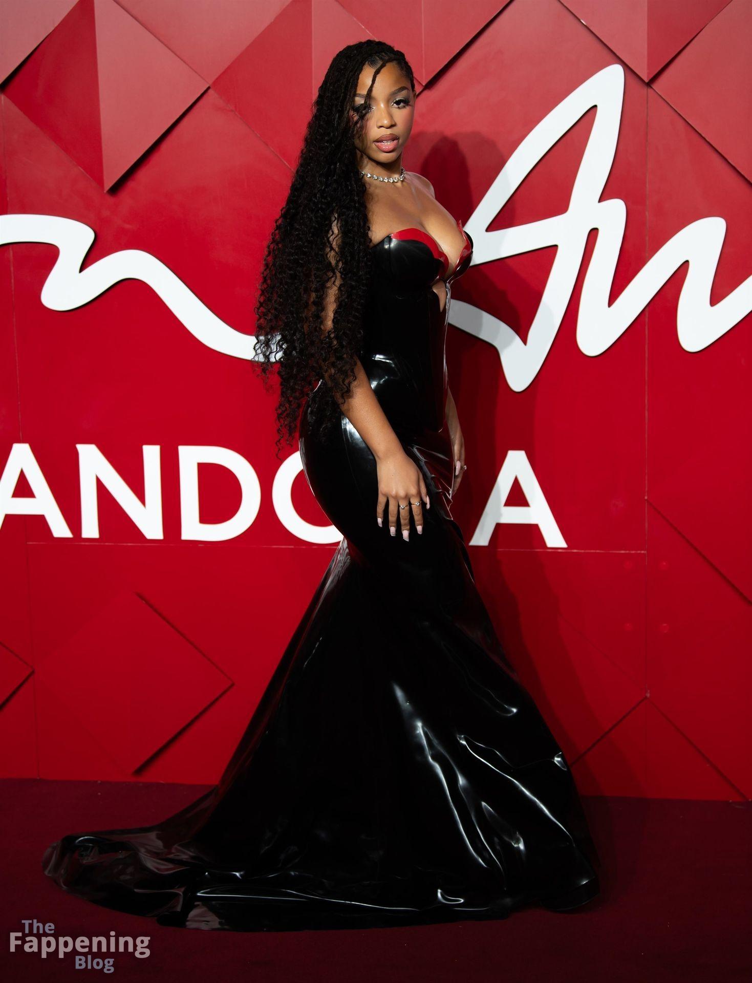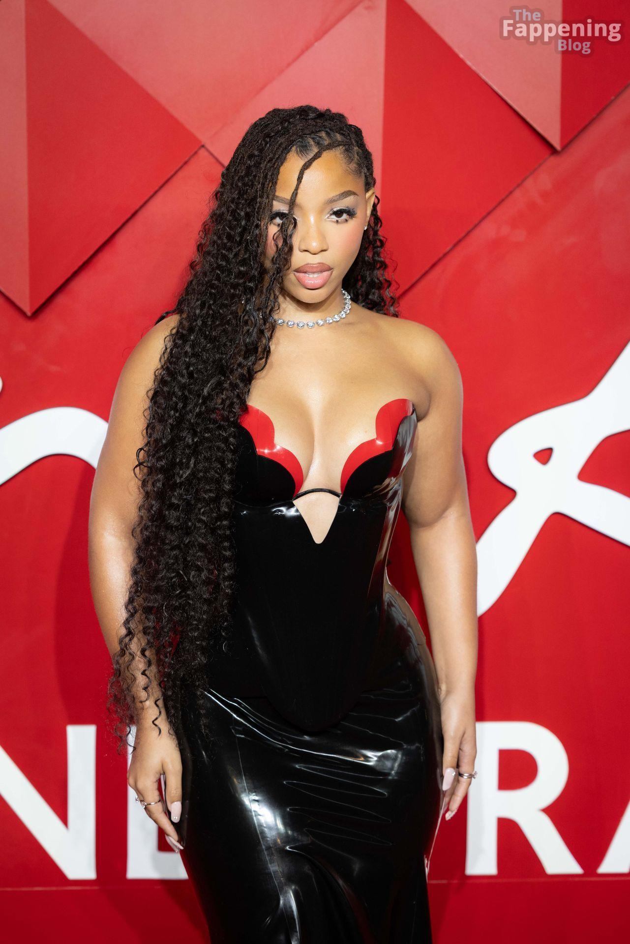 Chloe Bailey è stata fotografata con un audace abito in pelle nero e rosso che mette in risalto tutte le sue curve e il décolleté.