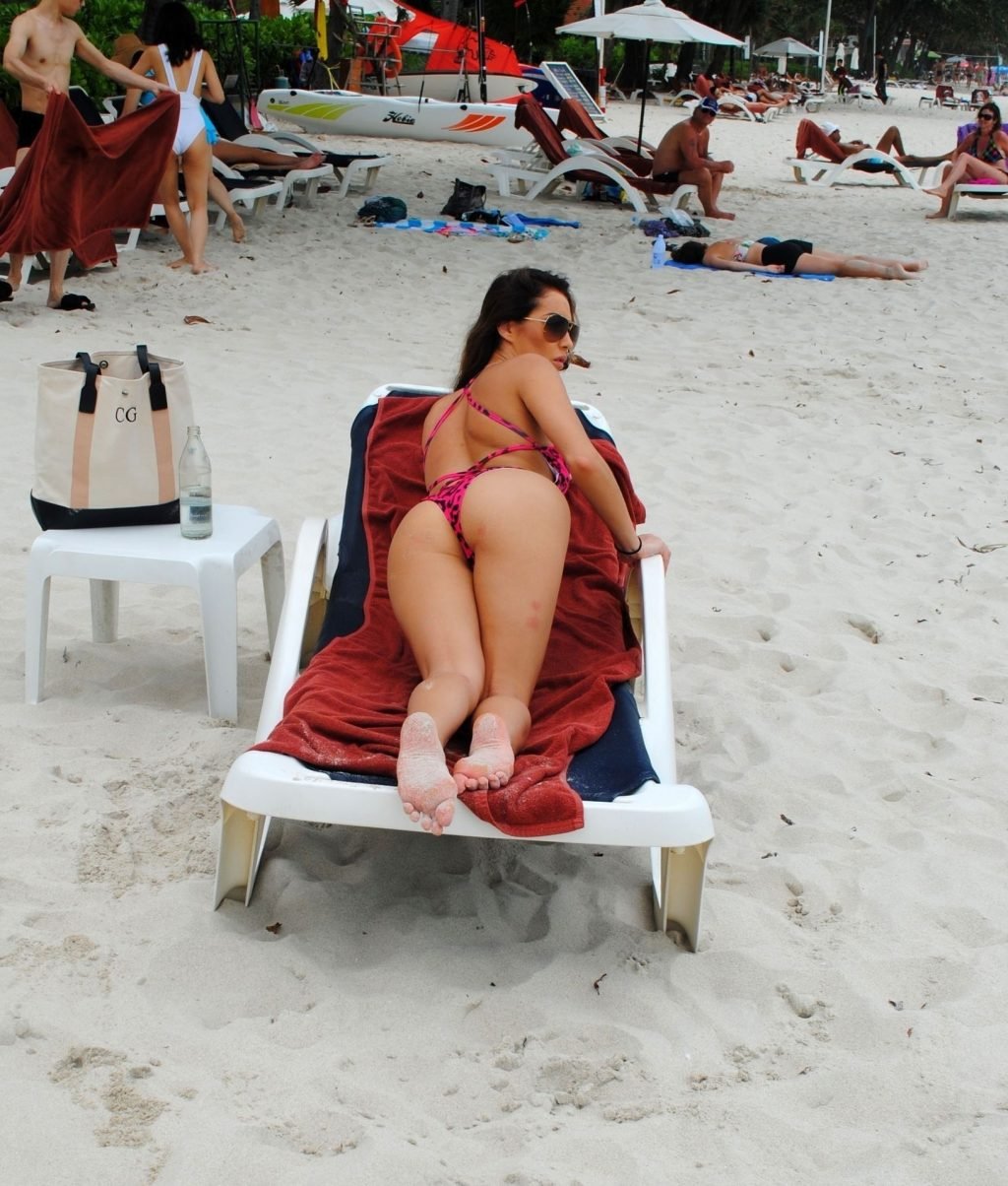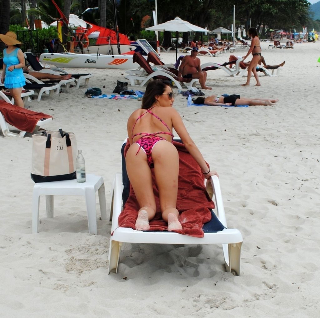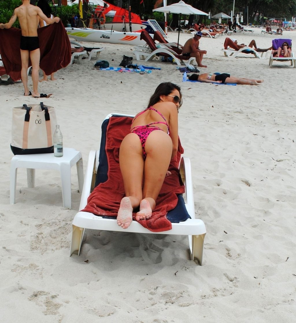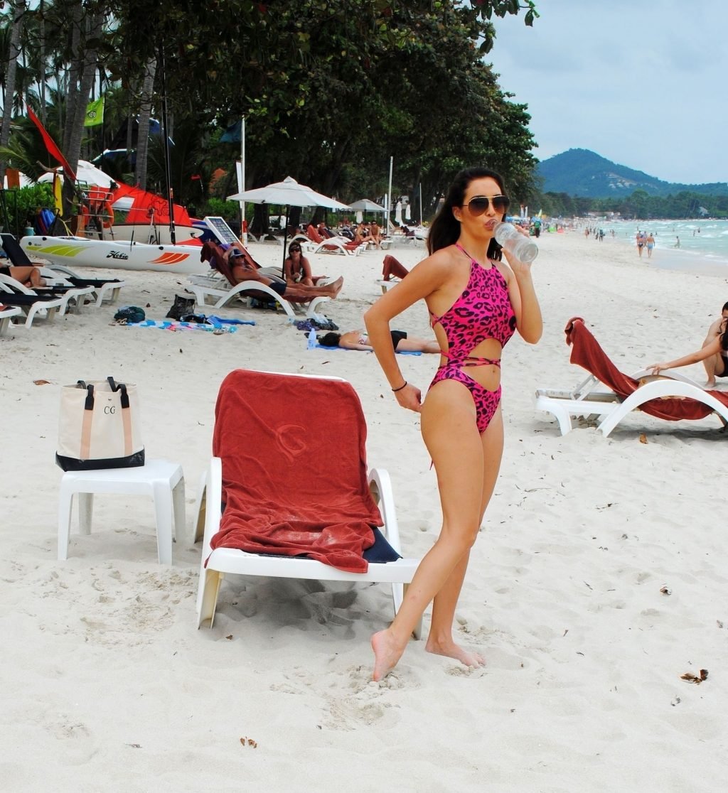 La star inglese della TV reality, la bruna formosa Chloe Goodman, sfoggia la sua figura mentre si gode una giornata sulla spiaggia a Barbados (2018).