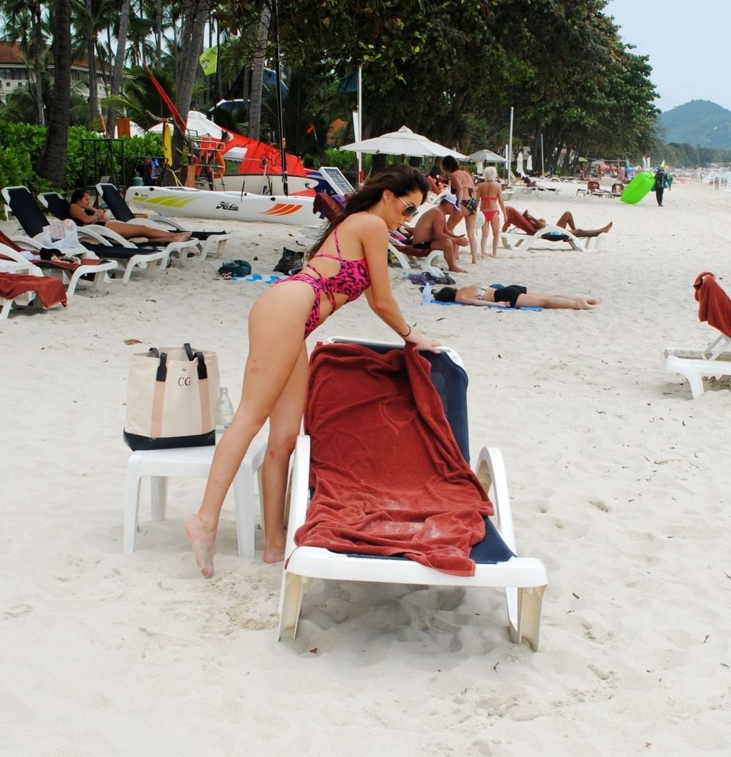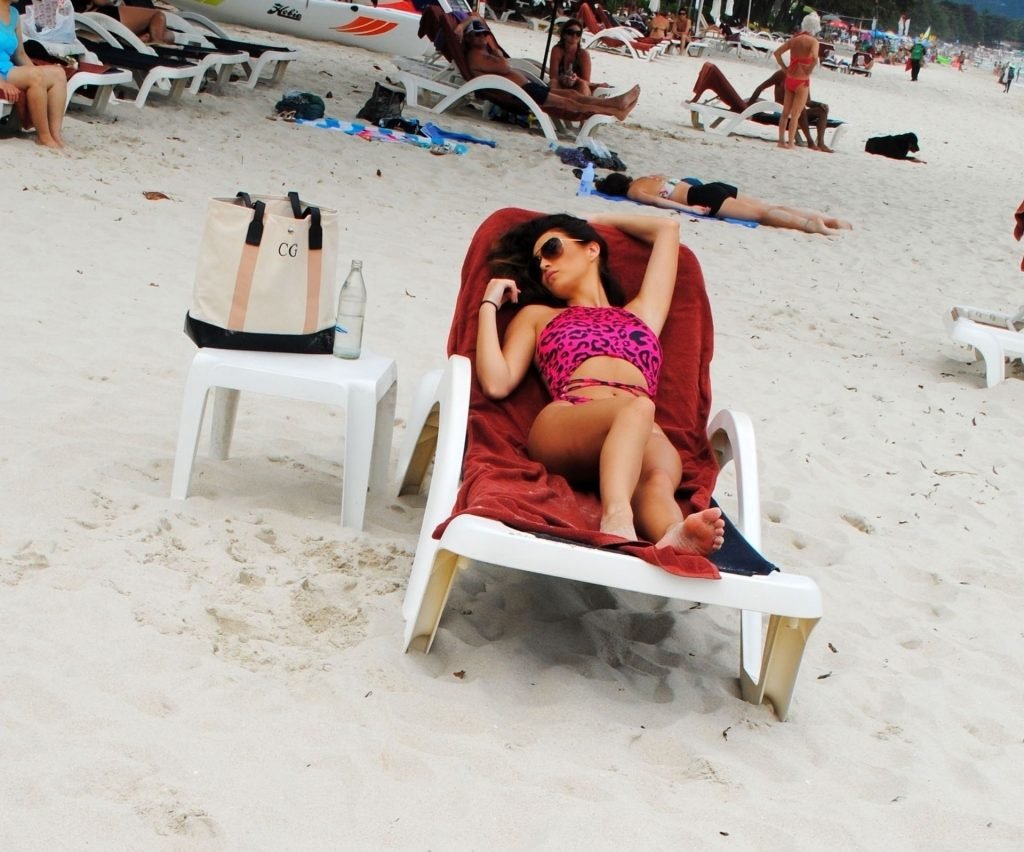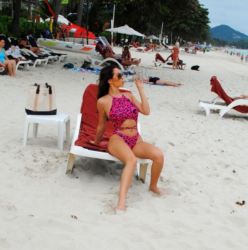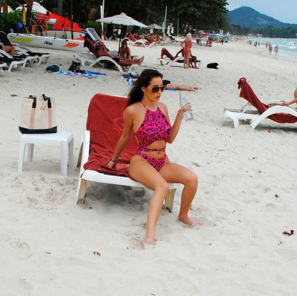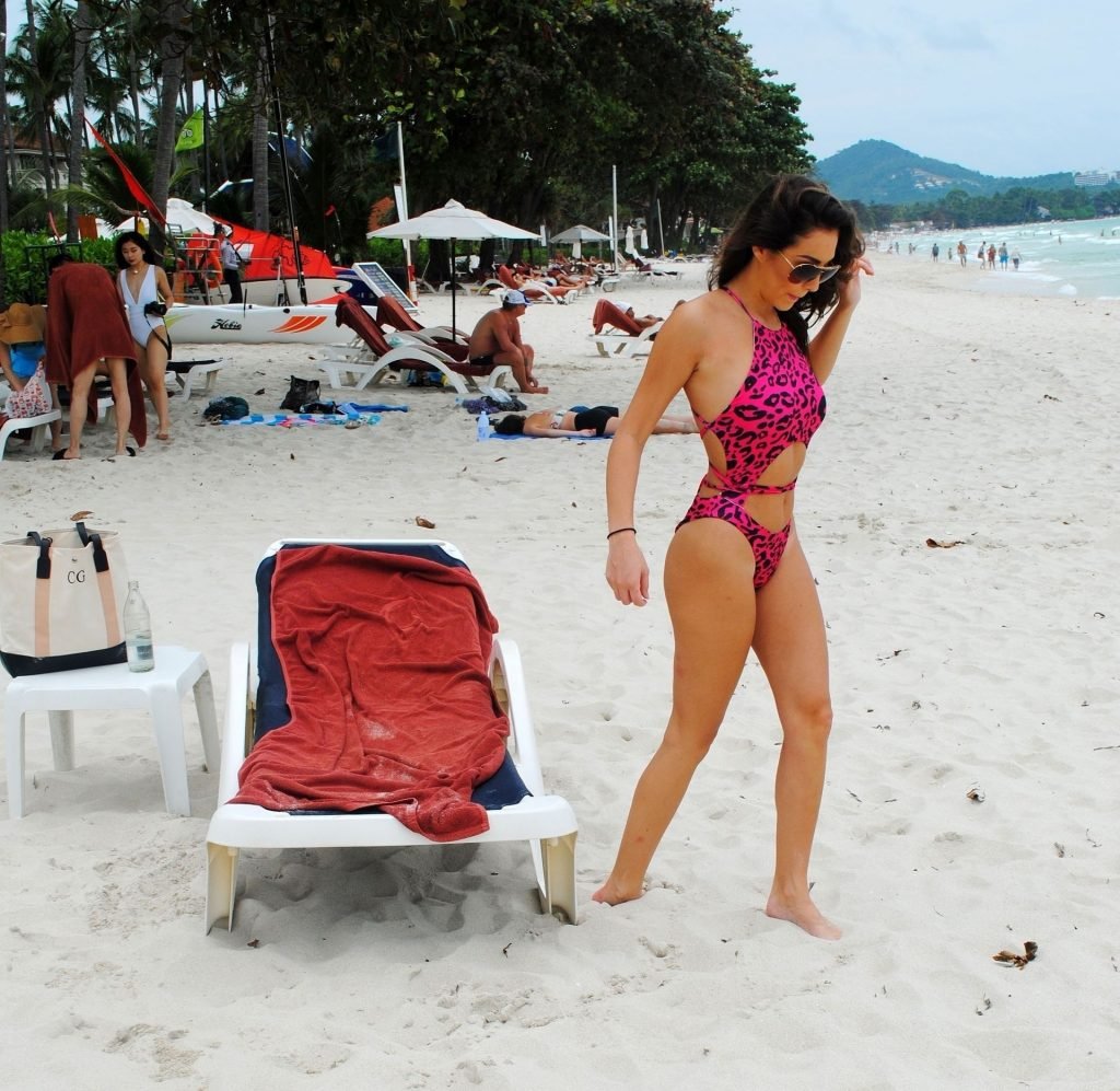 La star inglese della TV reality, la bruna formosa Chloe Goodman, sfoggia la sua figura mentre si gode una giornata sulla spiaggia a Barbados (2018).