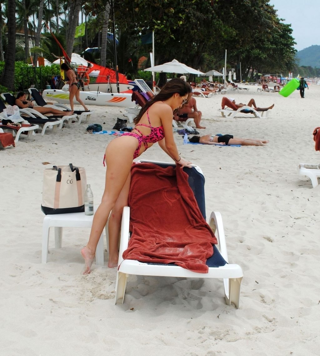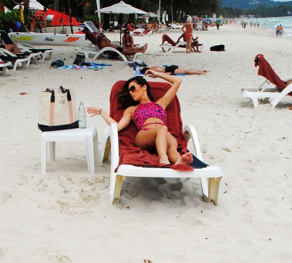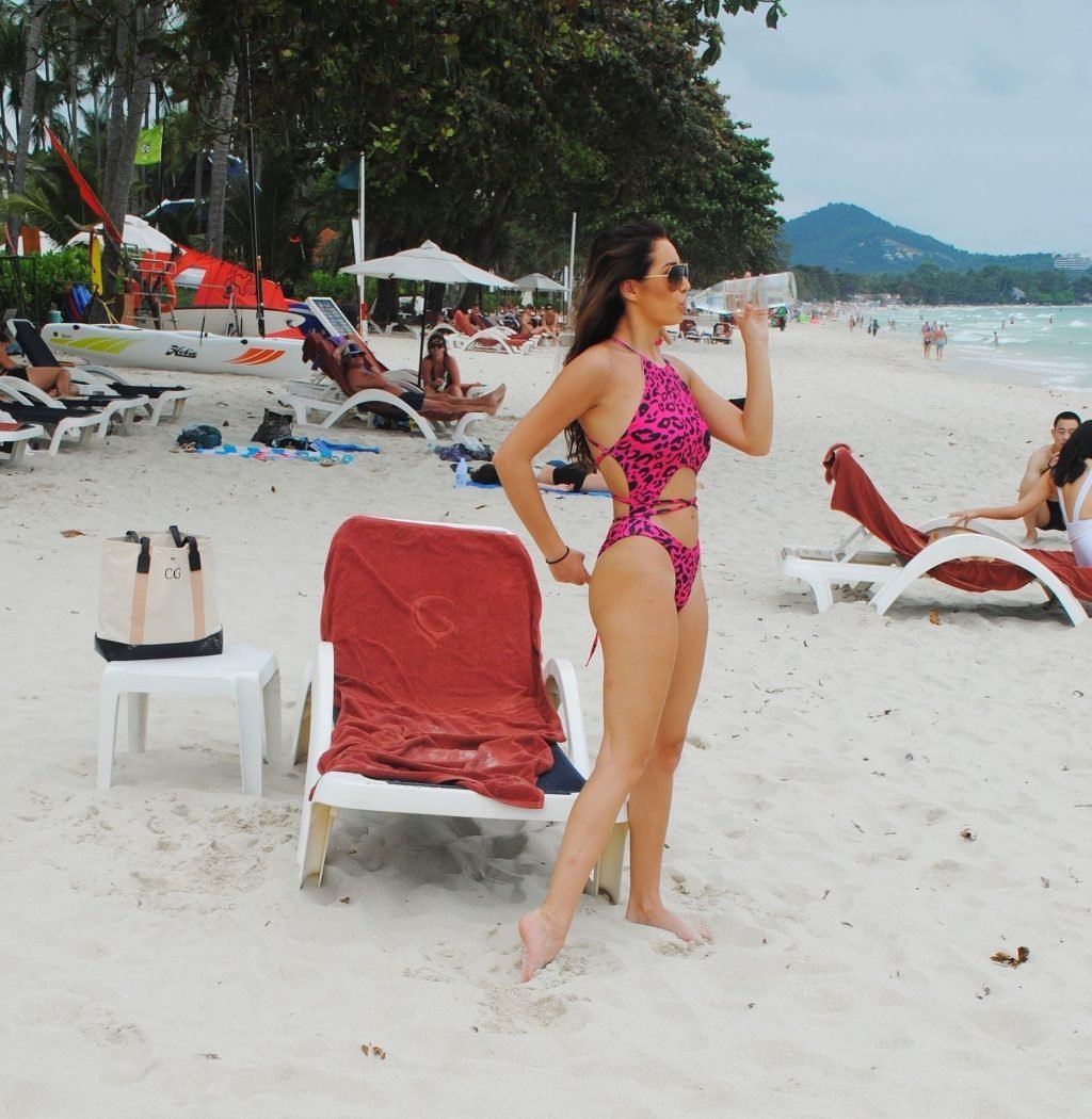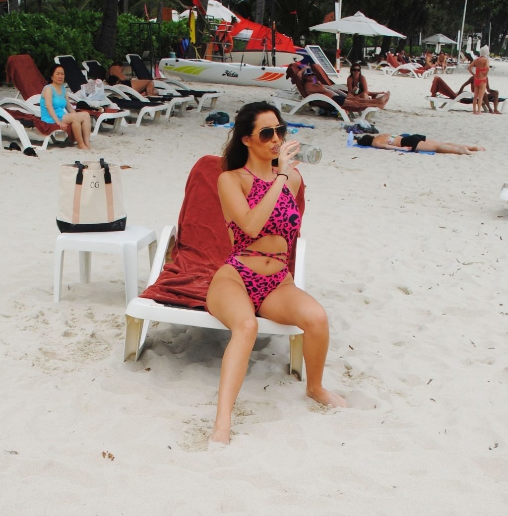 La star inglese della TV reality, la bruna formosa Chloe Goodman, sfoggia la sua figura mentre si gode una giornata sulla spiaggia a Barbados (2018).