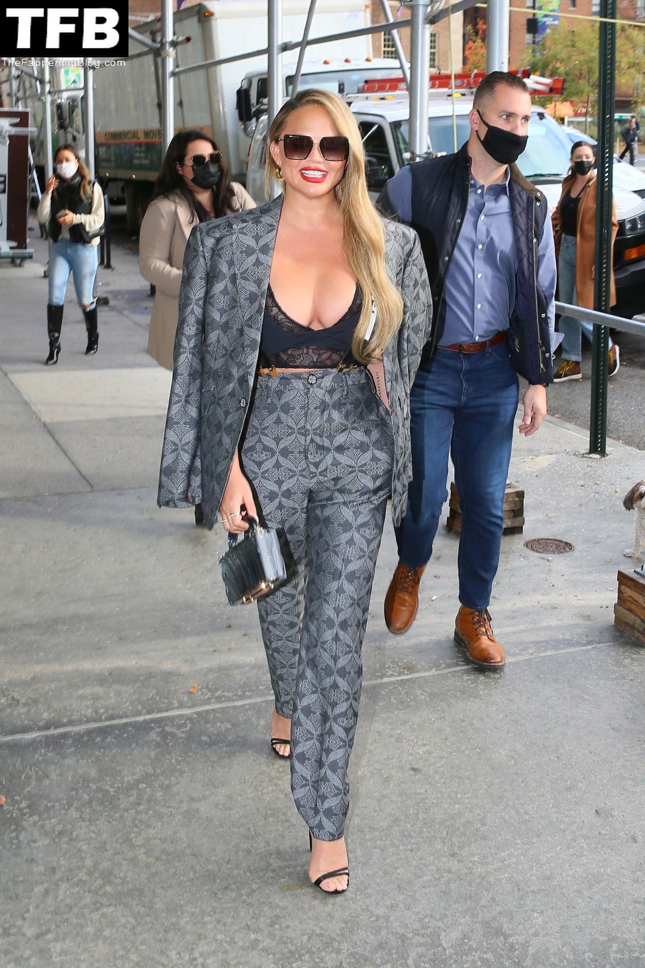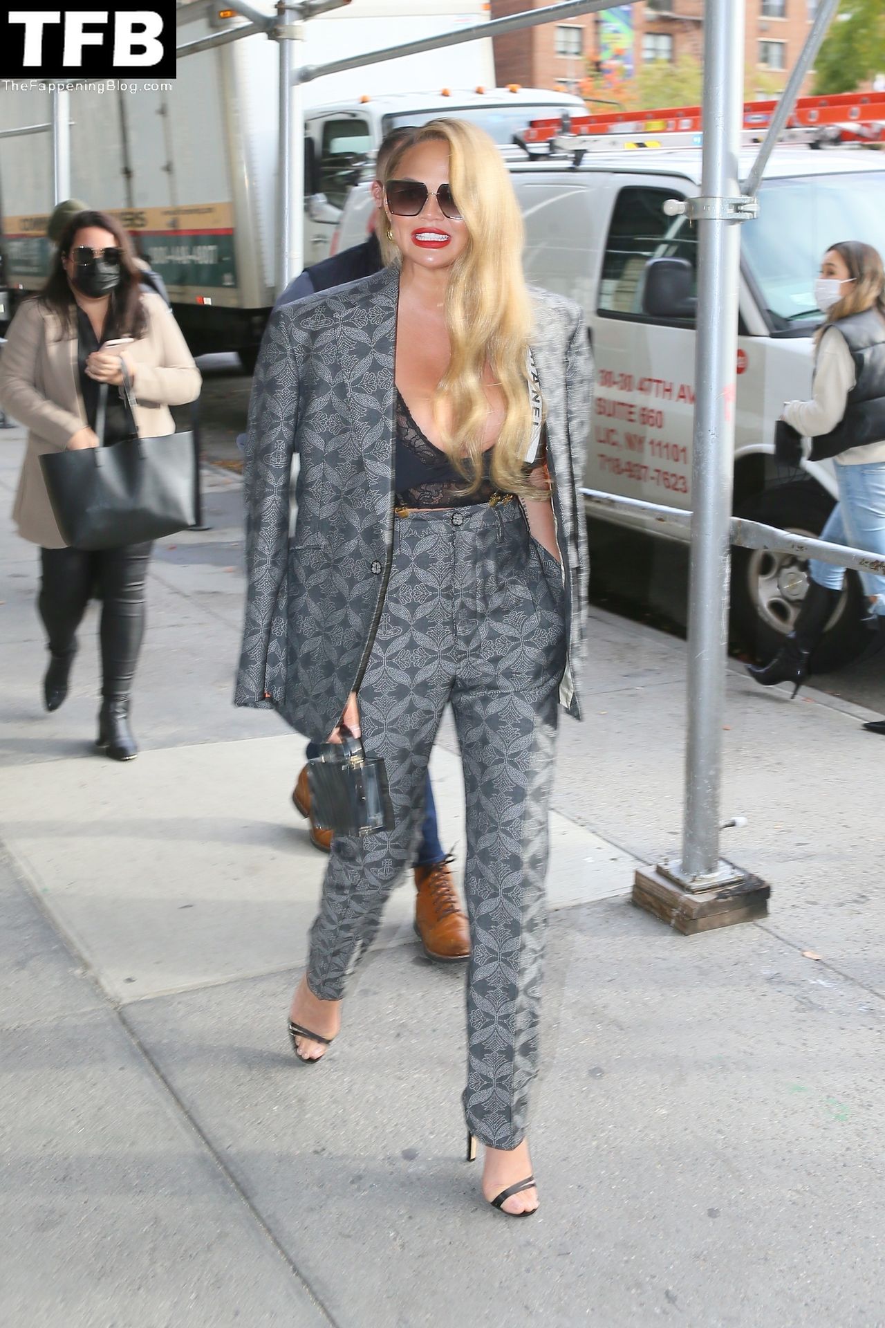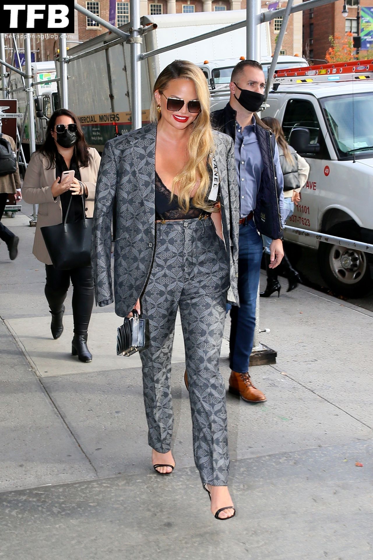 Modella Chrissy Teigen si reca da Barnes & Nobles a NYC indossando un audace scollo profondo abbinato a un completo grigio, 27/10/2021.