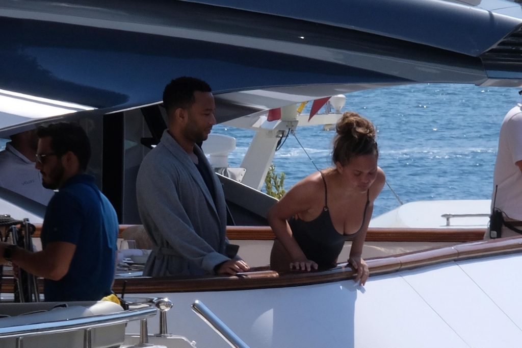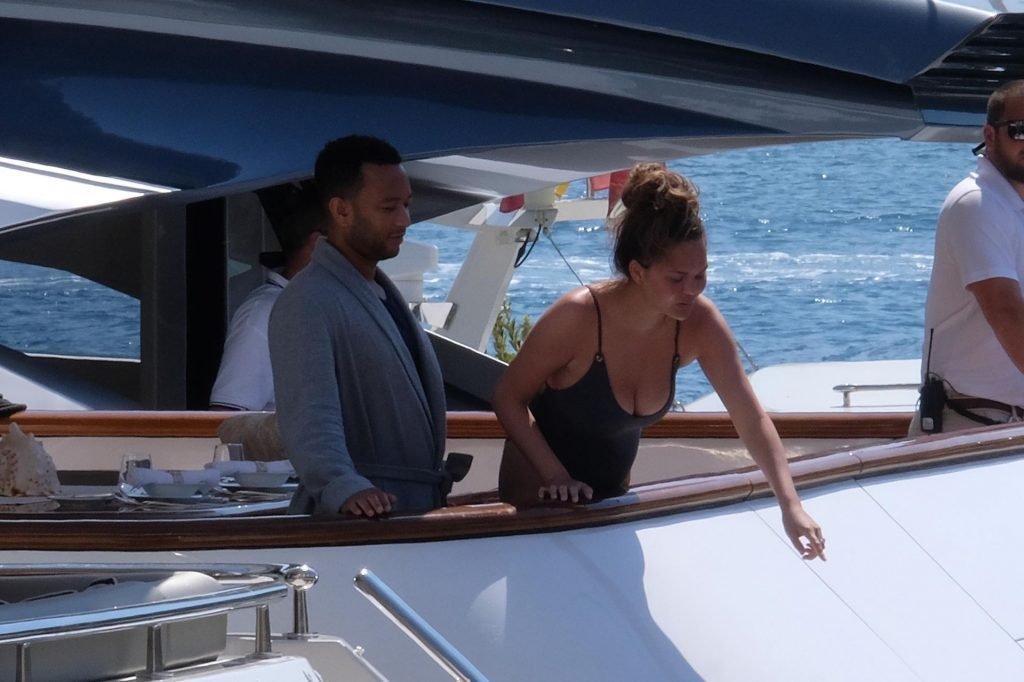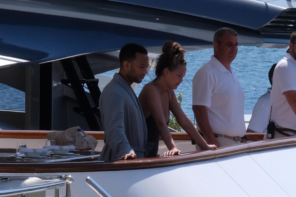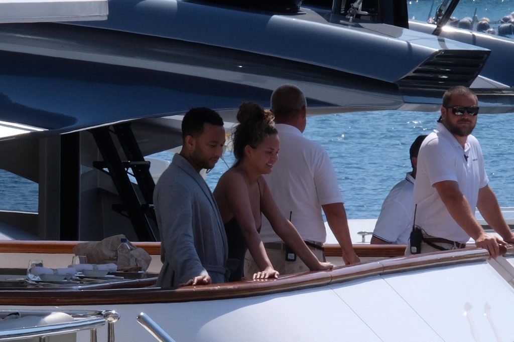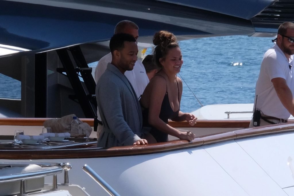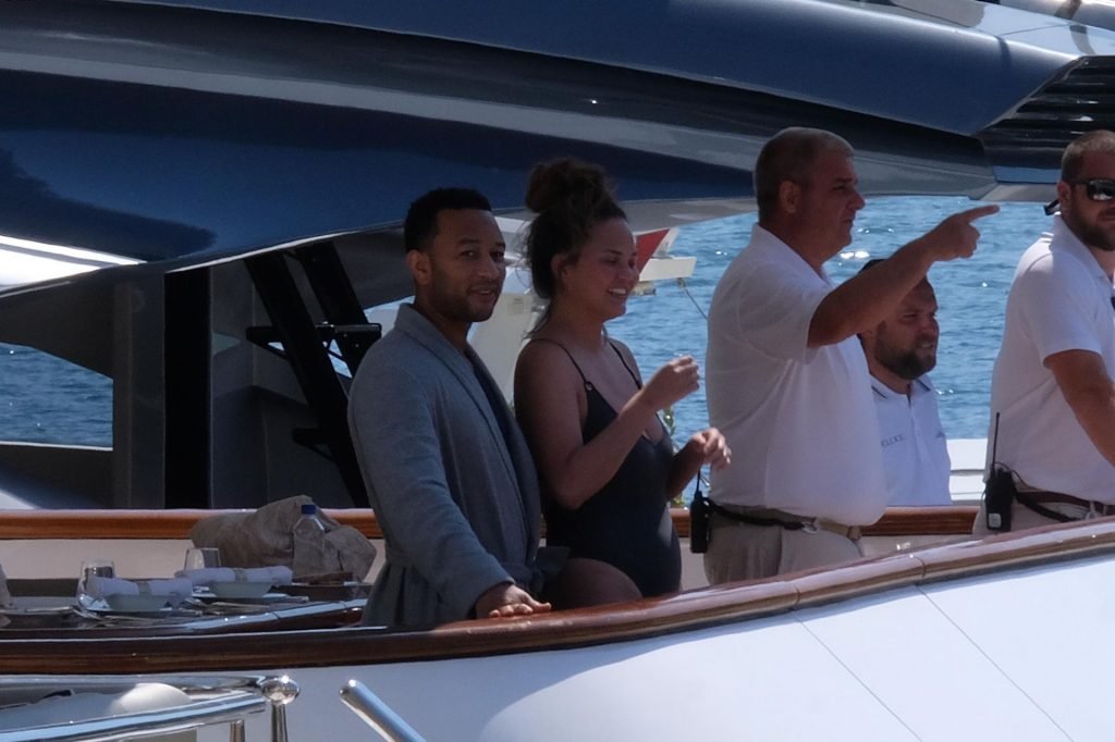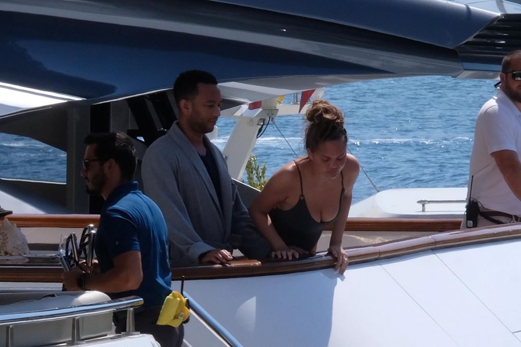 Il cantante soul americano John Legend e la moglie Chrissy Teigen si rilassano sul loro yacht durante la loro vacanza baciata dal sole a Portovenere, Italia, 07/04/2019.
