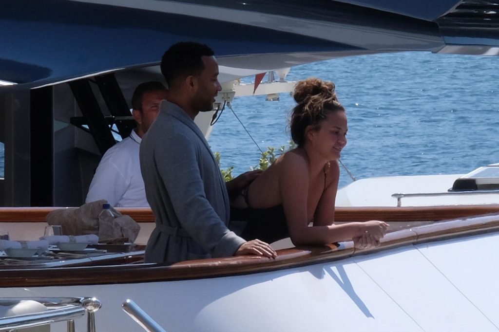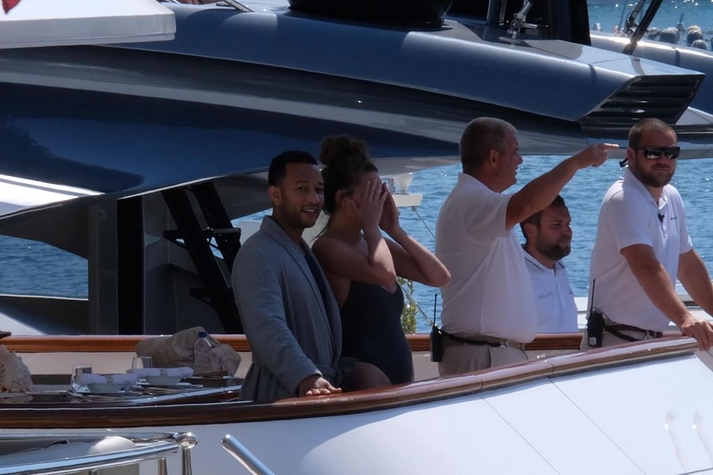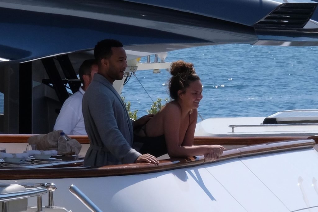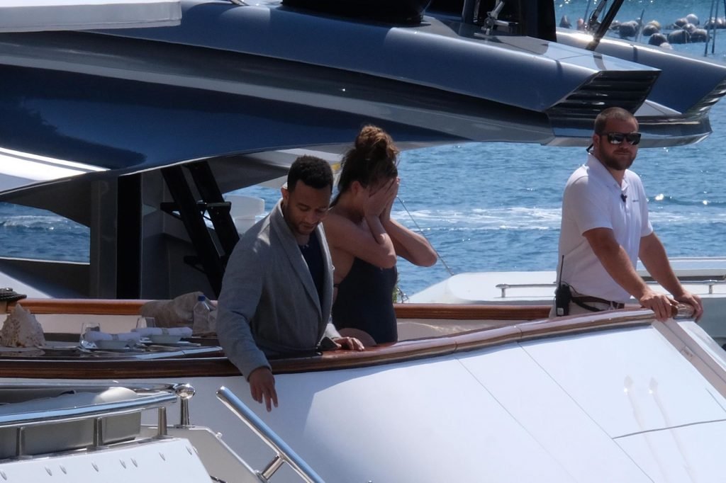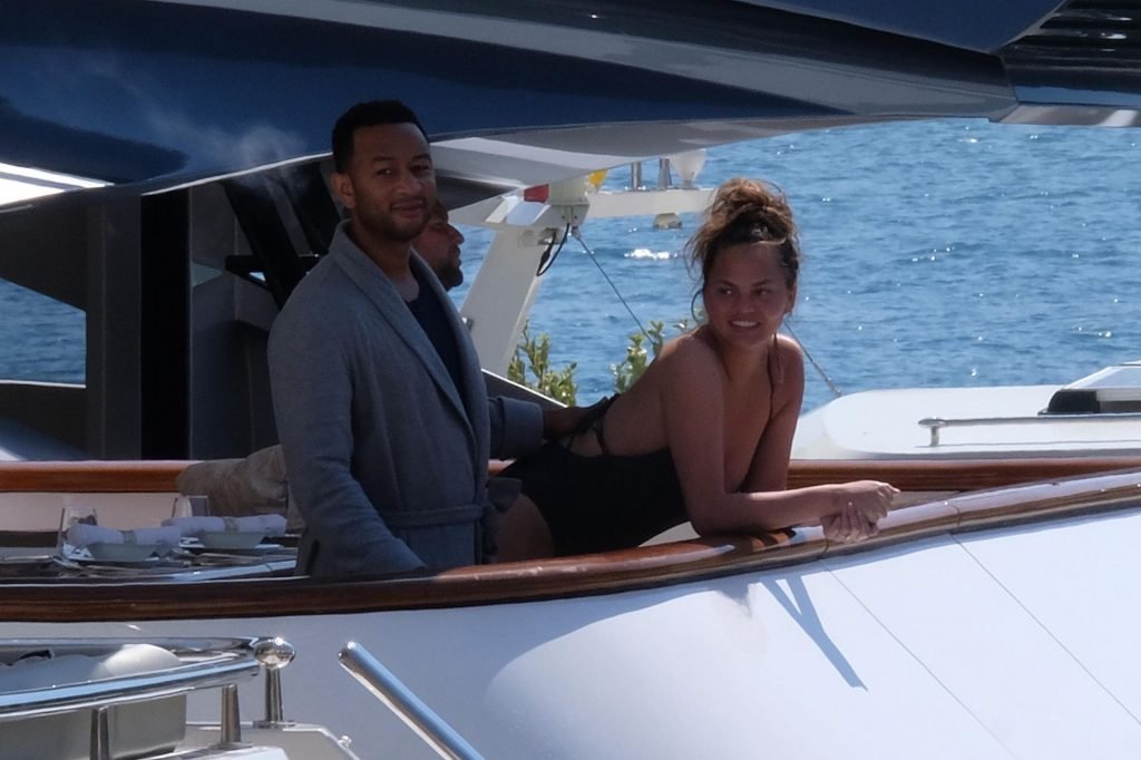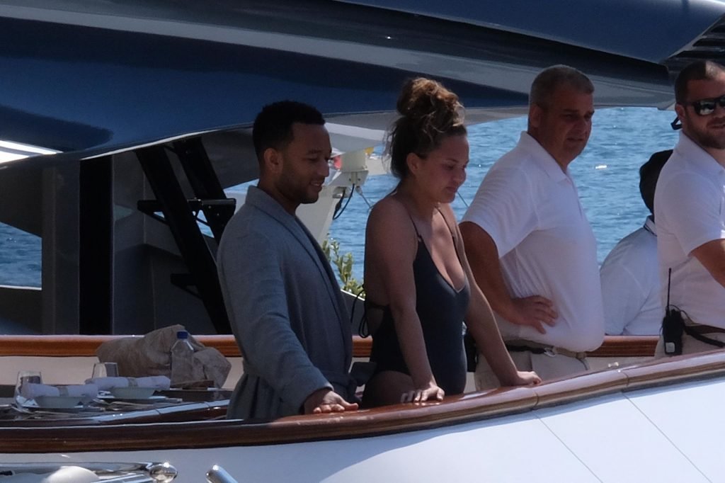 Il cantante soul americano John Legend e la moglie Chrissy Teigen si rilassano sul loro yacht durante la loro vacanza baciata dal sole a Portovenere, Italia, 07/04/2019.