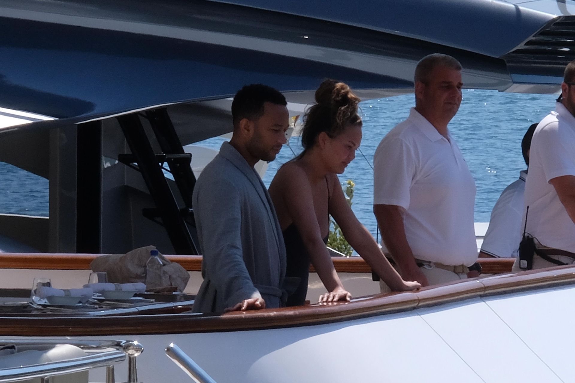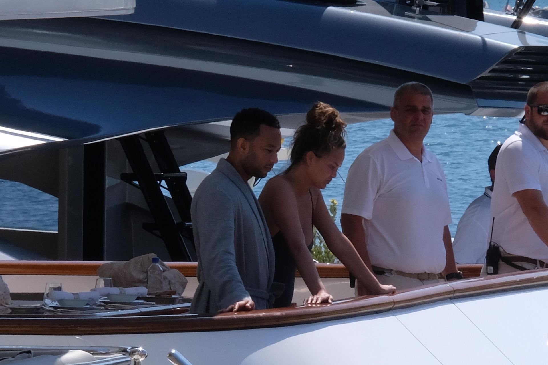 Il cantante soul americano John Legend e la moglie Chrissy Teigen si rilassano sul loro yacht durante la loro vacanza baciata dal sole a Portovenere, Italia, 07/04/2019.