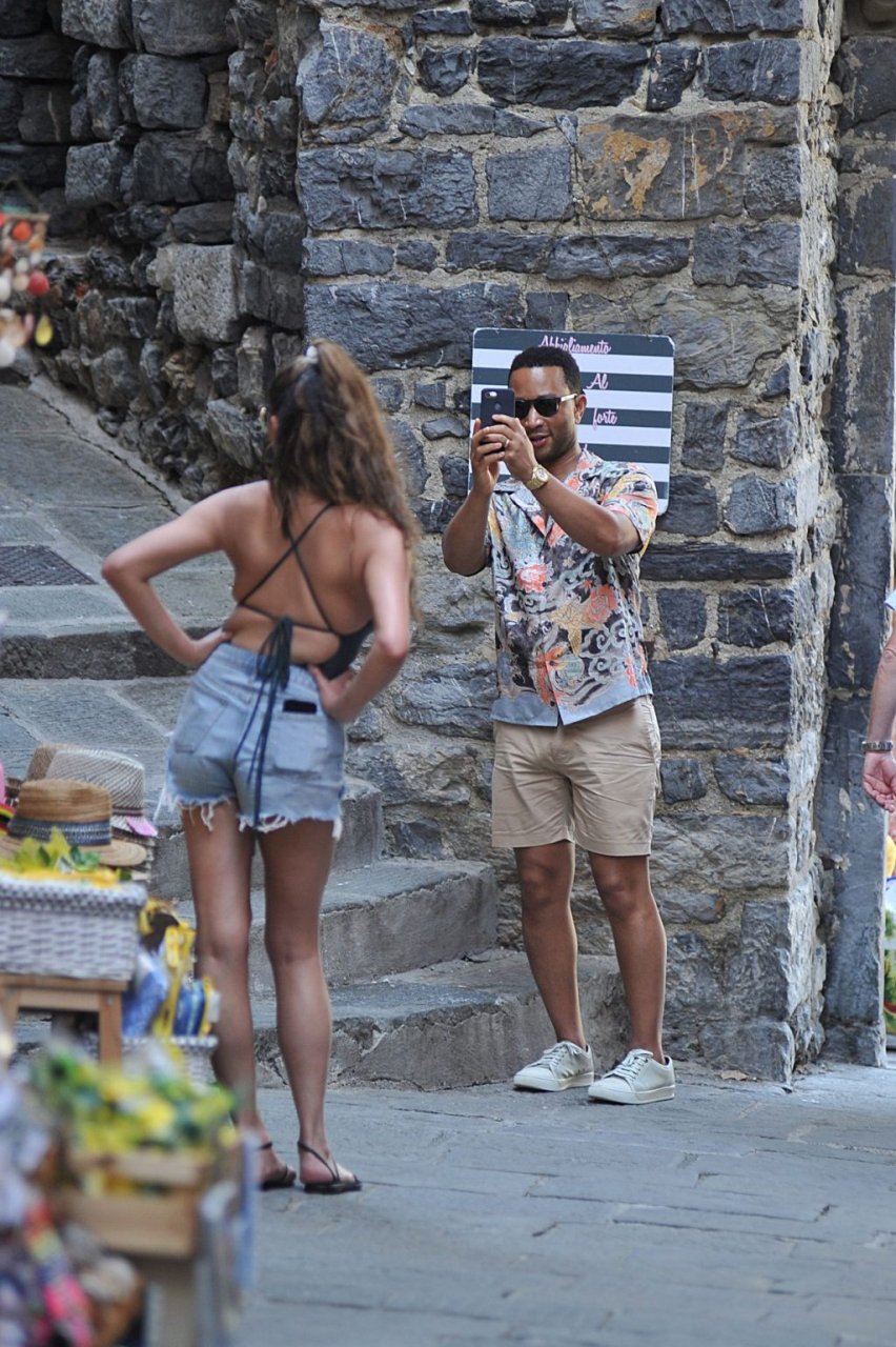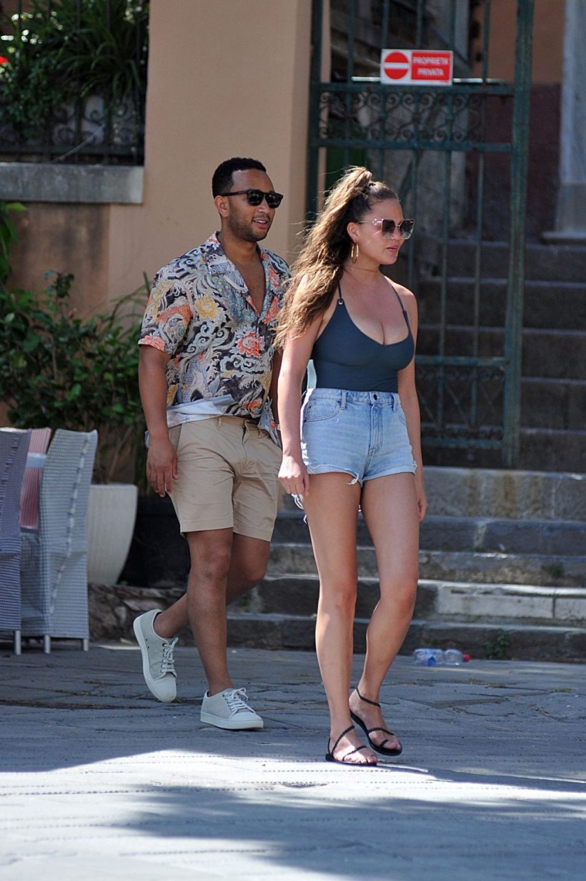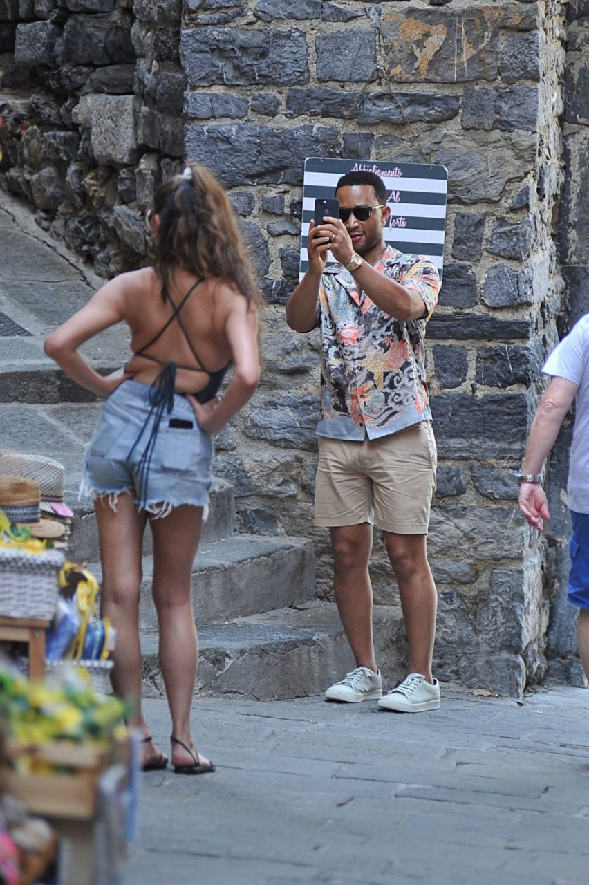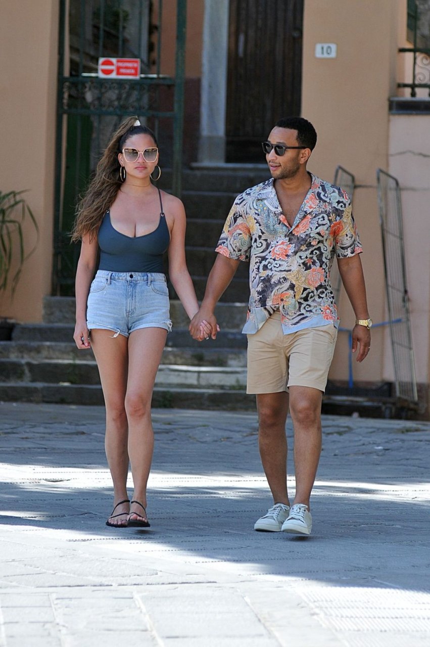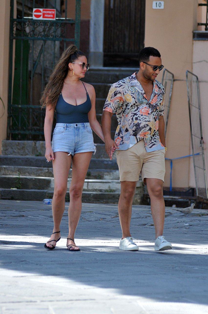 John Legend e Chrissy Teigen sono stati visti mentre si scambiavano effusioni a Porto Venere, 07/04/2019. Chrissy è stata fotografata con pantaloncini di jeans e un body verde scuro con una scollatura profonda.