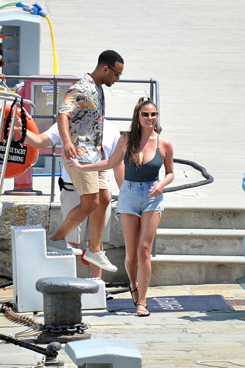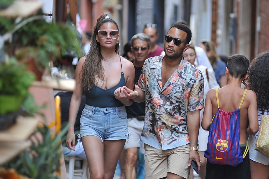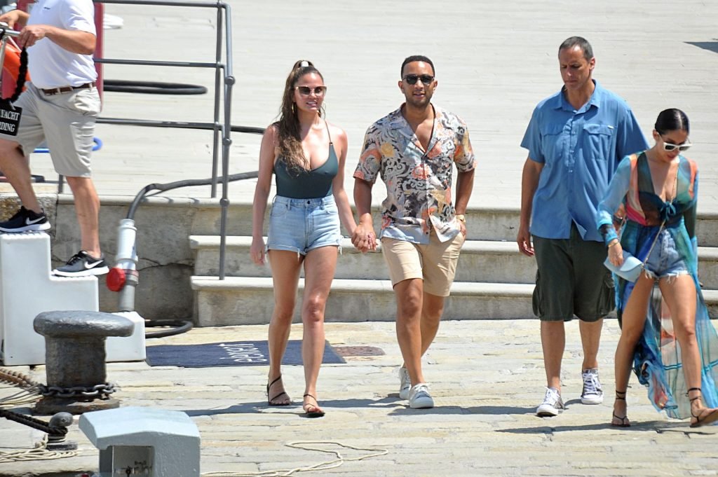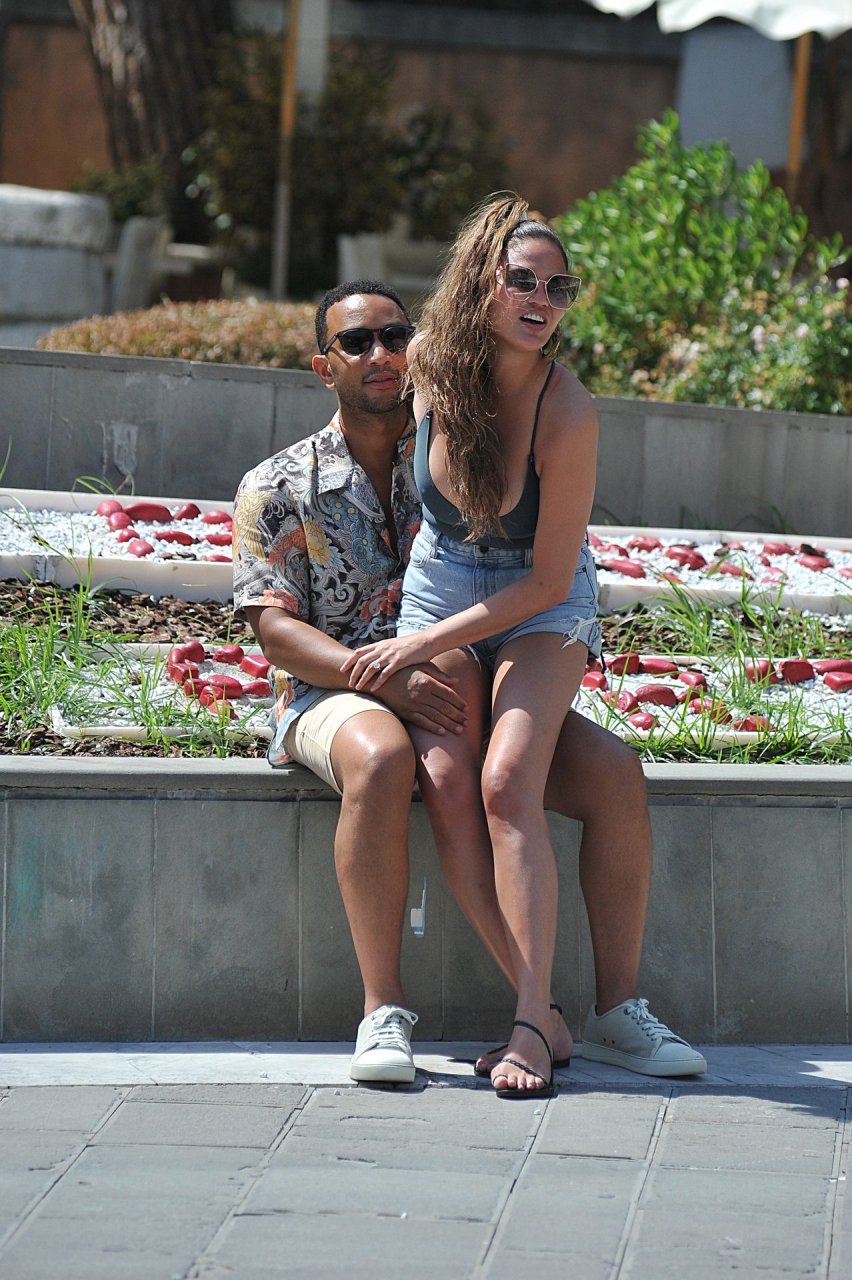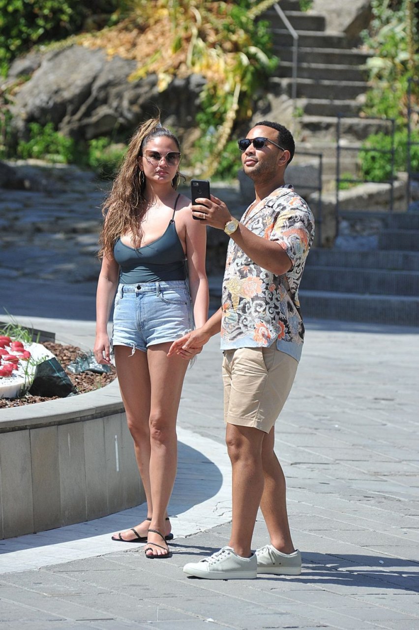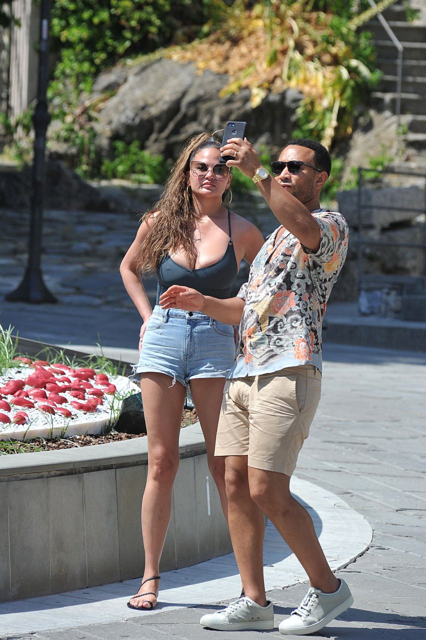 John Legend e Chrissy Teigen sono stati visti mentre si scambiavano effusioni a Porto Venere, 07/04/2019. Chrissy è stata fotografata con pantaloncini di jeans e un body verde scuro con una scollatura profonda.