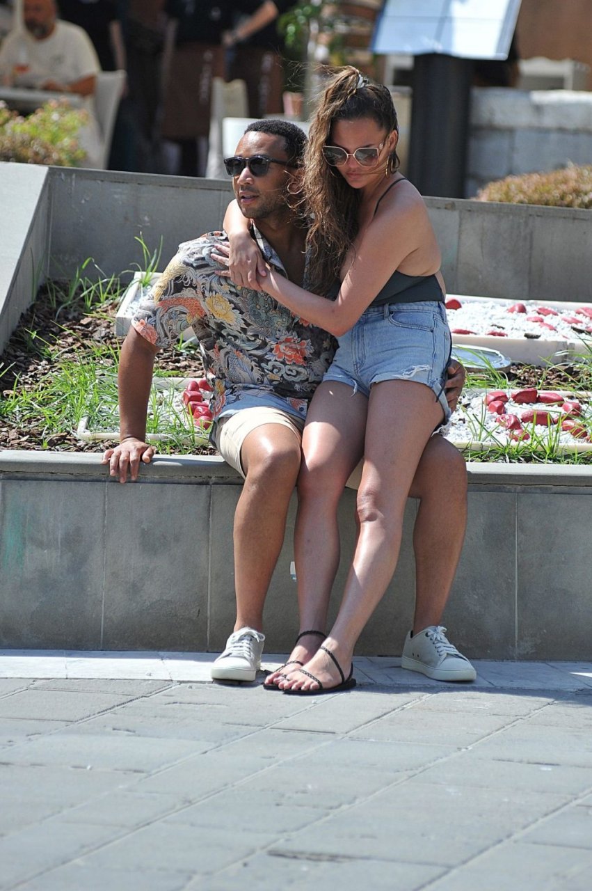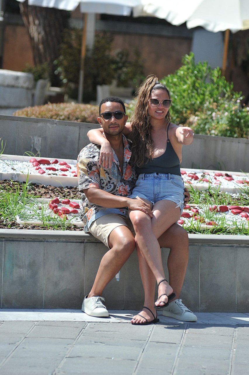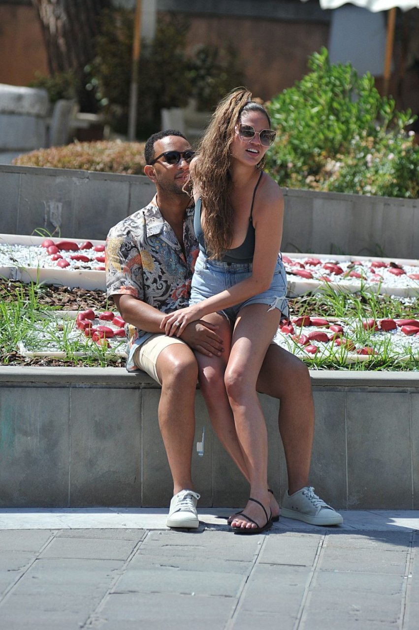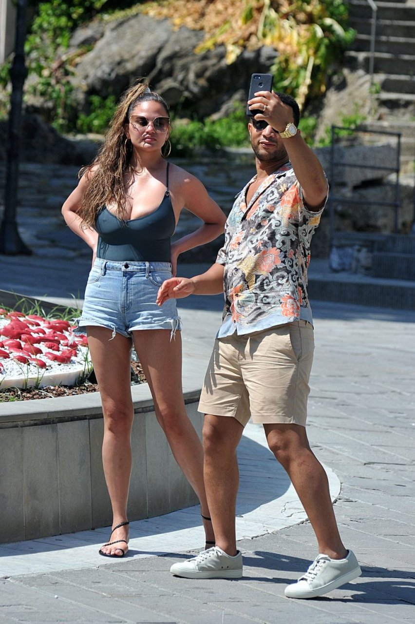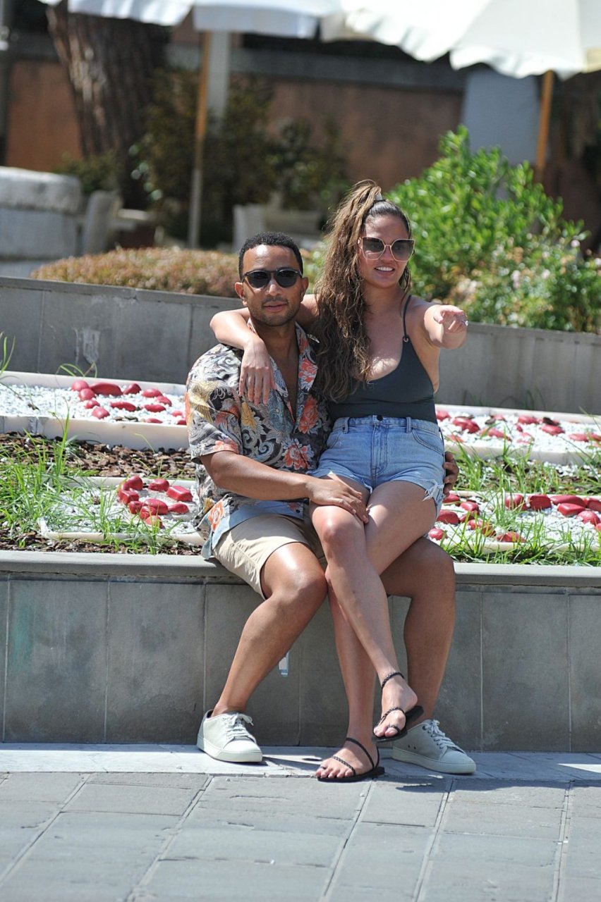 John Legend e Chrissy Teigen sono stati visti mentre si scambiavano effusioni a Porto Venere, 07/04/2019. Chrissy è stata fotografata con pantaloncini di jeans e un body verde scuro con una scollatura profonda.