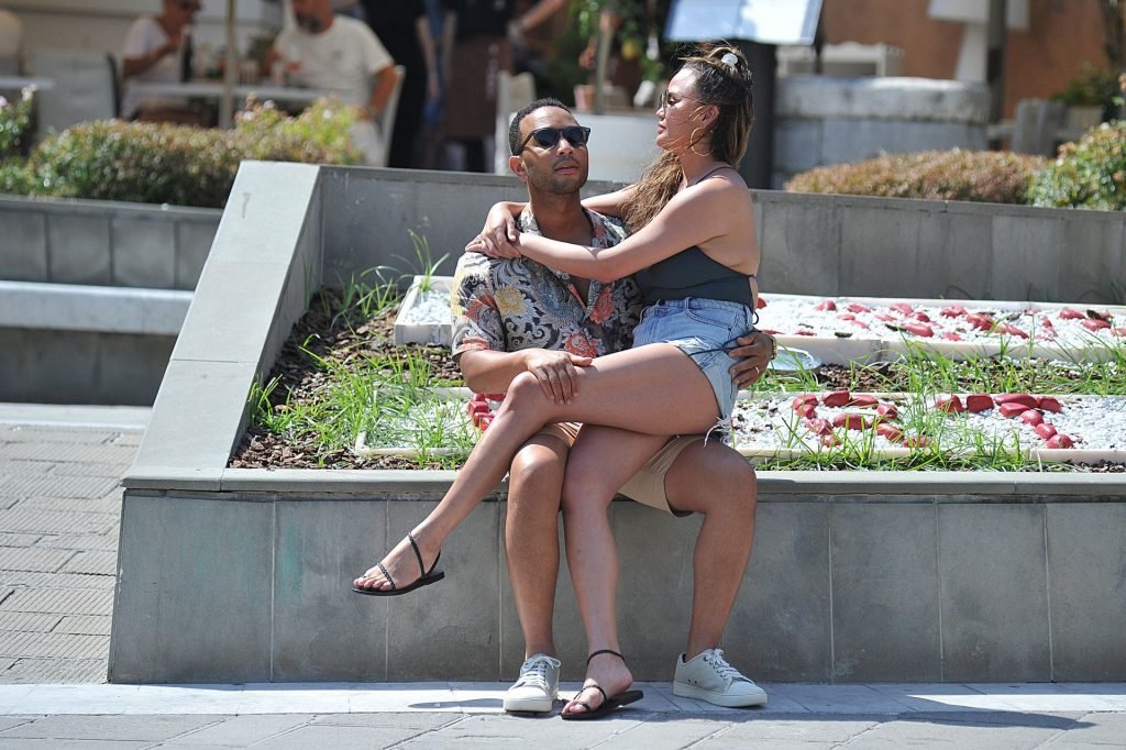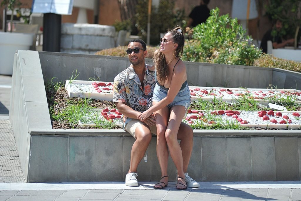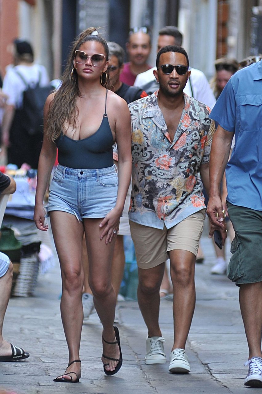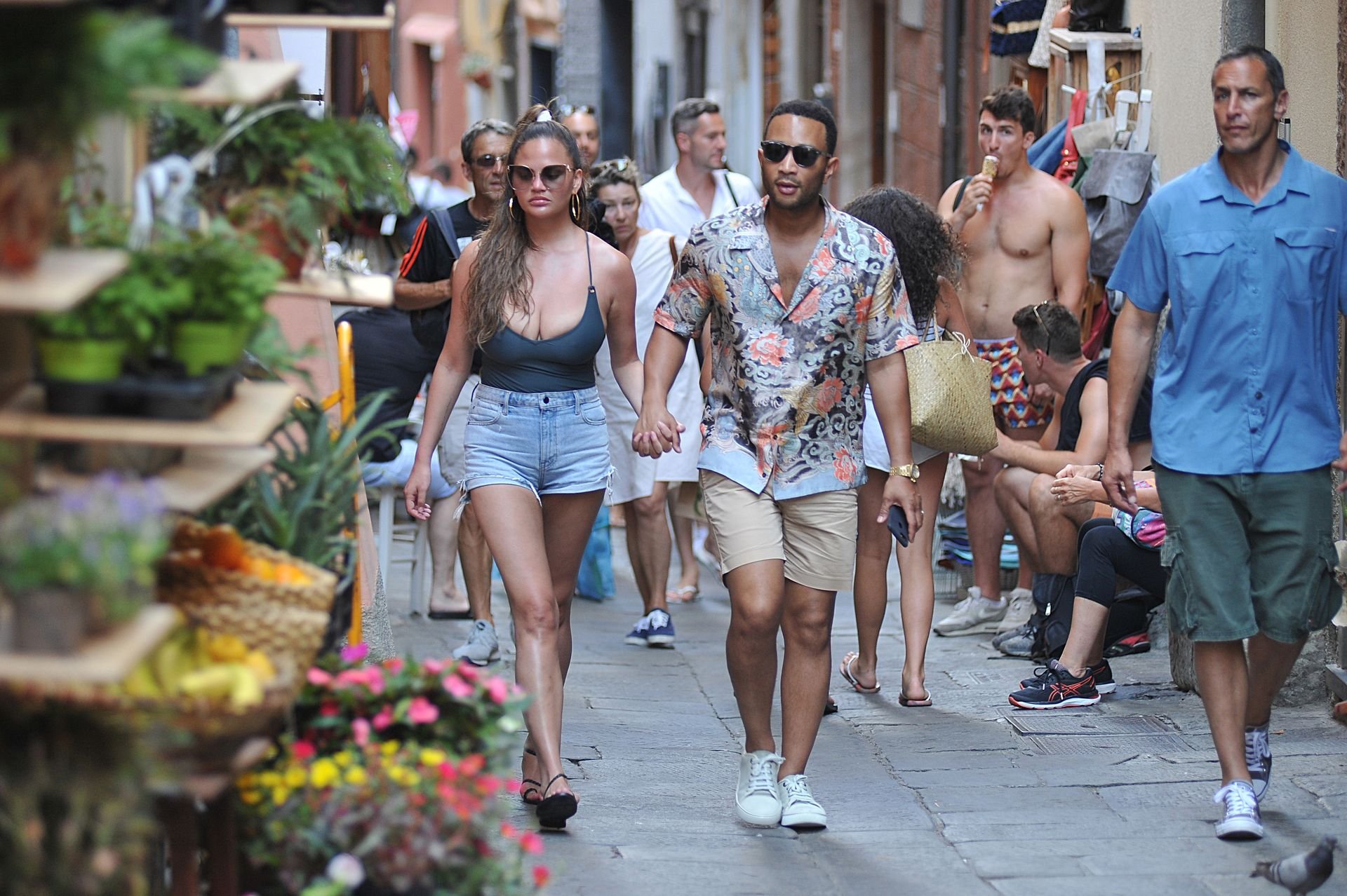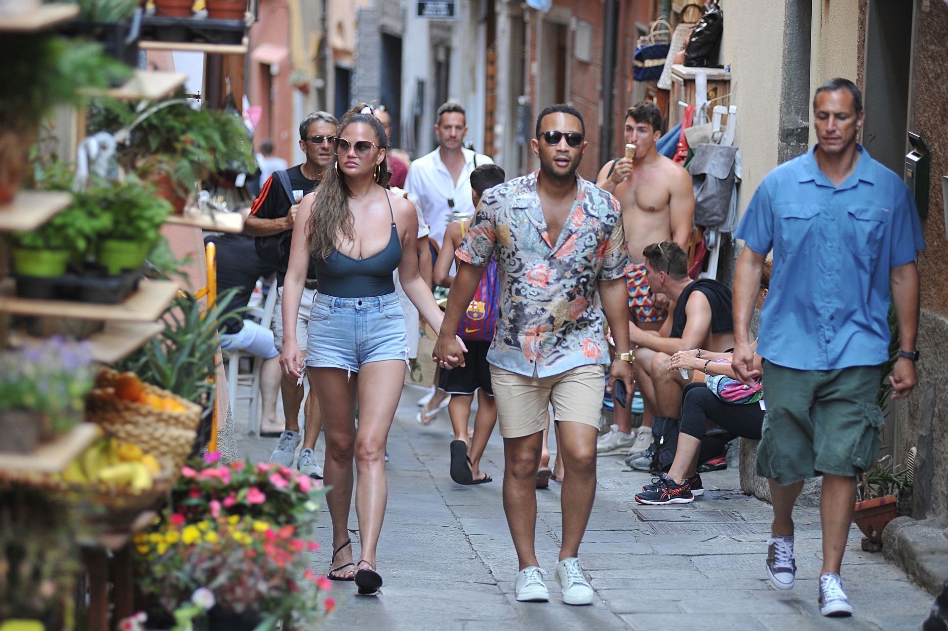 John Legend e Chrissy Teigen sono stati visti mentre si scambiavano effusioni a Porto Venere, 07/04/2019. Chrissy è stata fotografata con pantaloncini di jeans e un body verde scuro con una scollatura profonda.