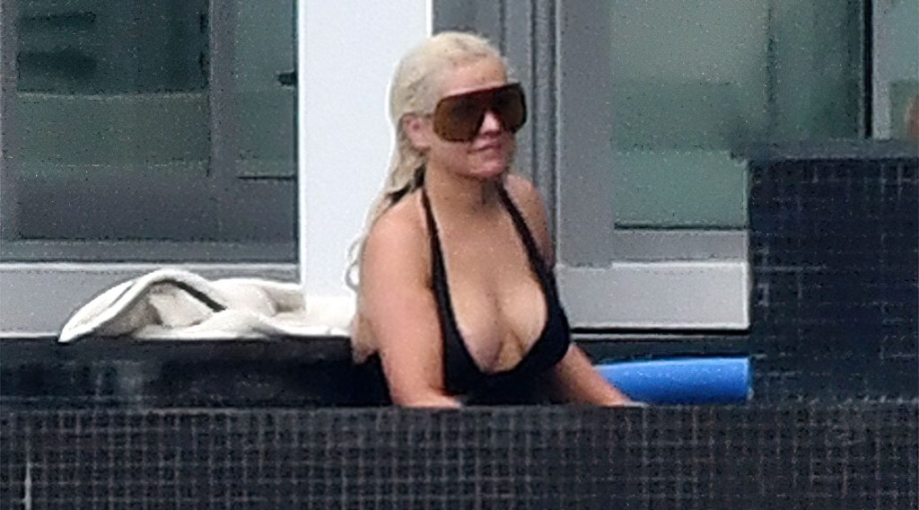 La veterana cantante Christina Aguilera mostra il suo seno MILF mentre si gode una giornata in piscina a Miami.