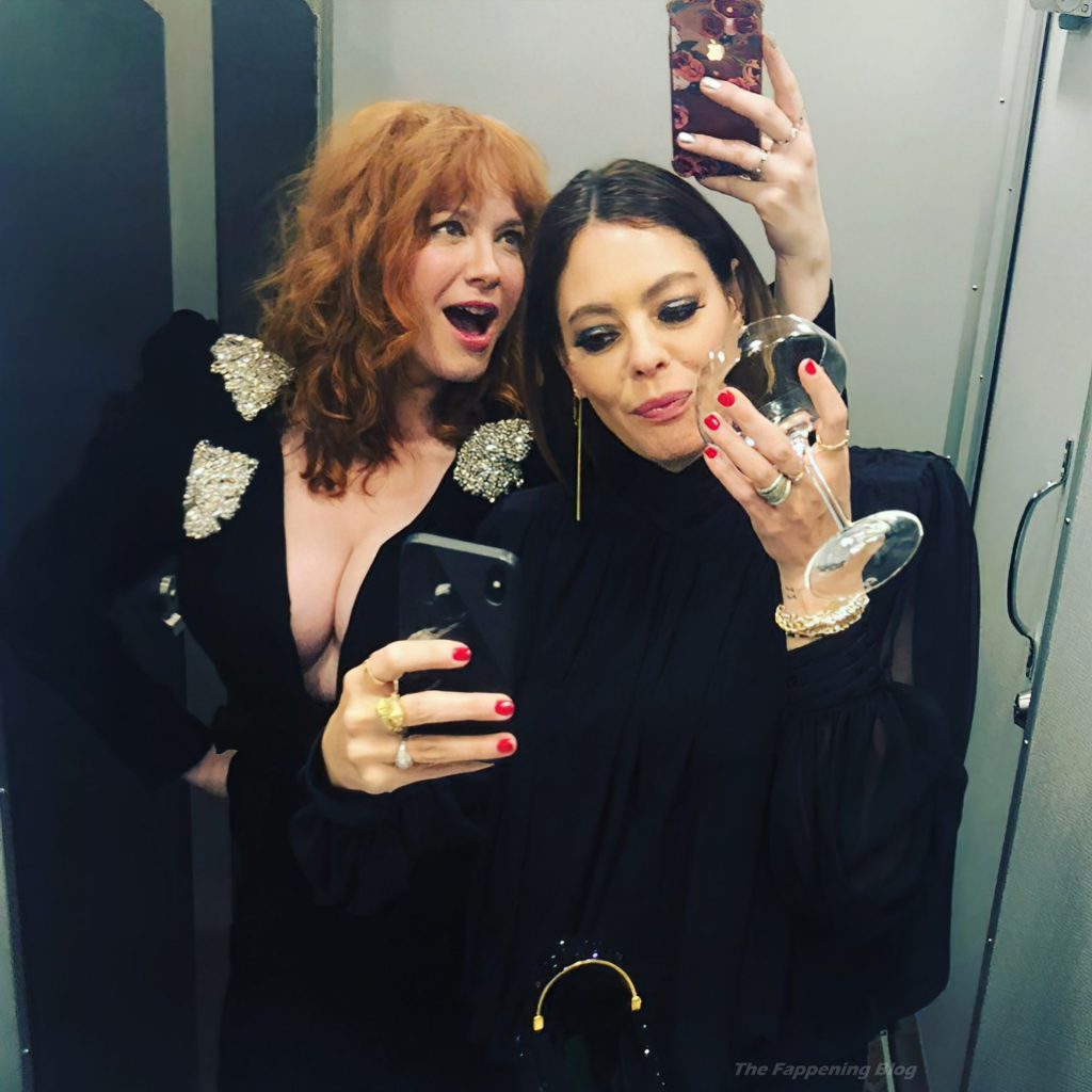 L’attrice Christina Hendricks mostra il suo bel décolleté mentre scatta un selfie con il suo stylist – Instagram, 16/09/2021.