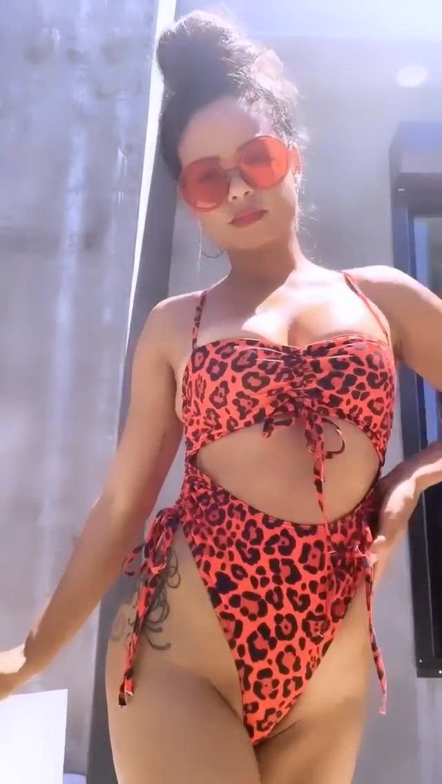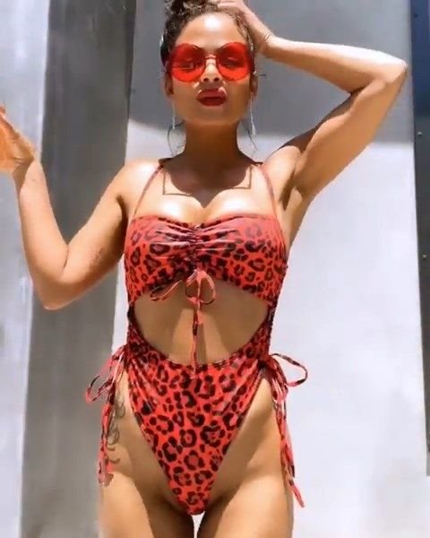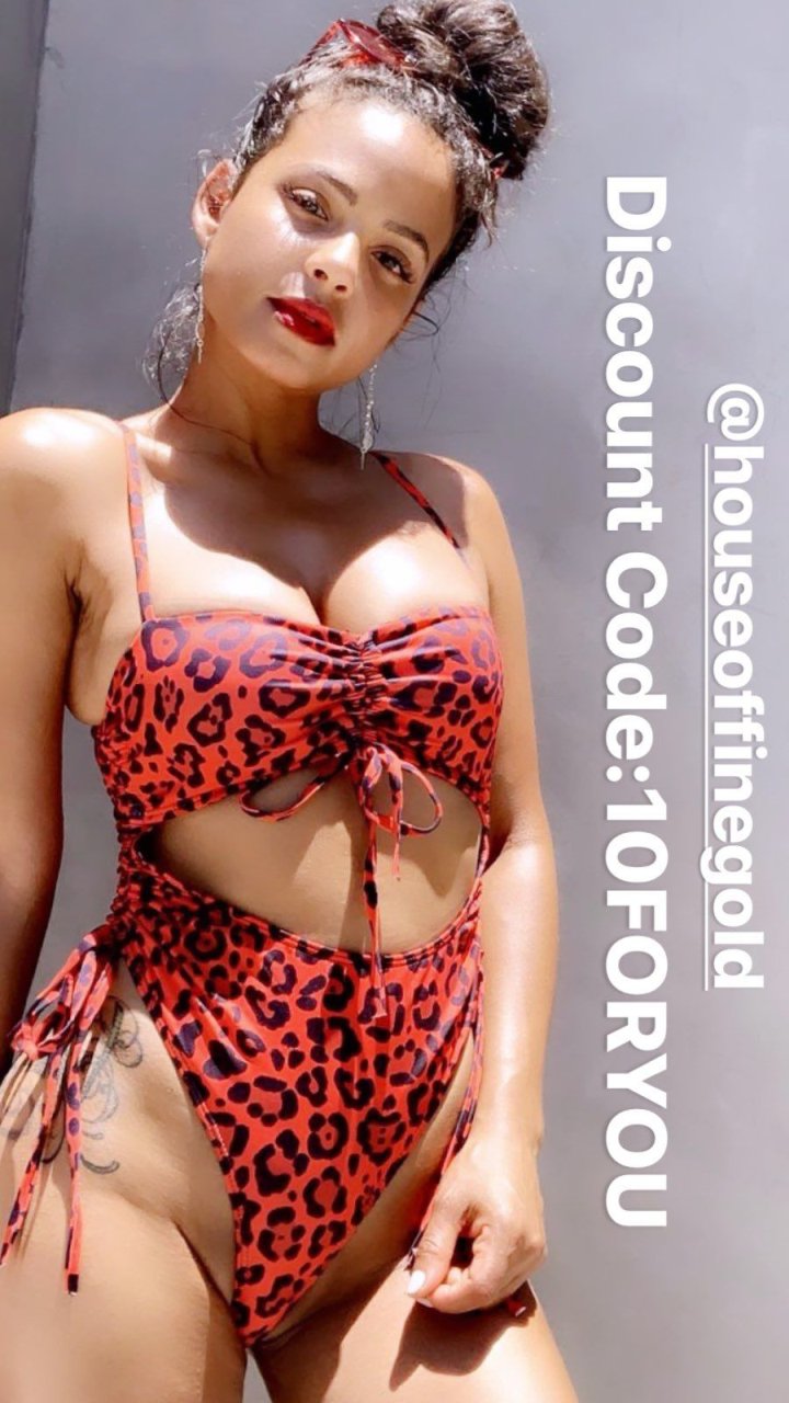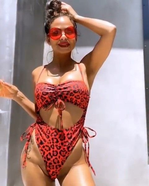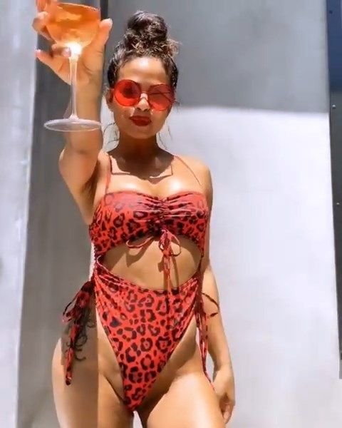 Attrice/cantante Christina Milian ha condiviso alcune foto e video sexy posando con un costume da bagno rosso con stampa leopardata – Instagram, 06/08/2019.