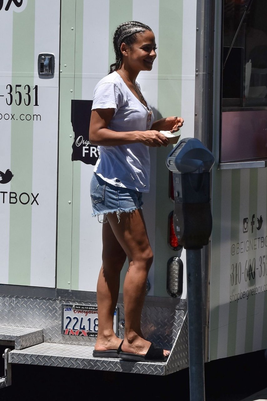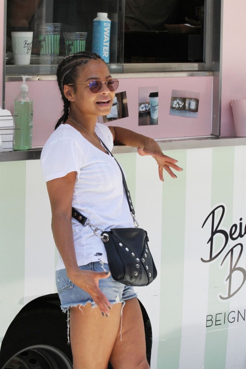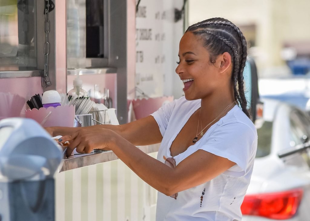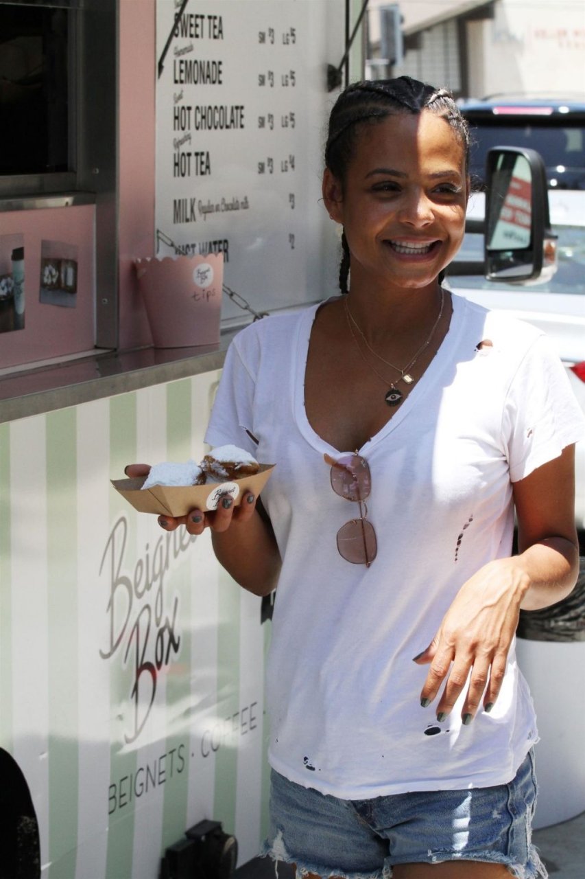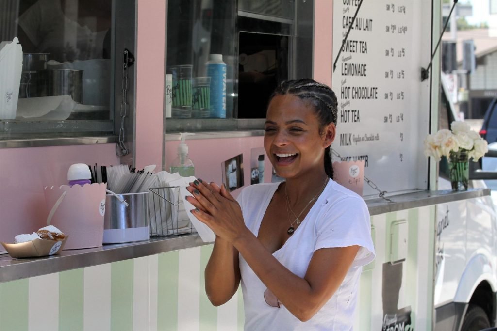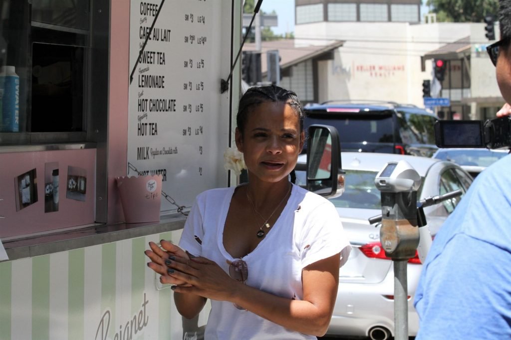 Attrice Christina Milian tutta sorridente mentre mostra le sue abilità con i dolci nella sua unità mobile Beignet Box a Studio City, 12/06/2019. Dopo il pranzo con sua figlia da Joan’s on Third, condivide alcuni dei suoi deliziosi Beignet con i fotografi.