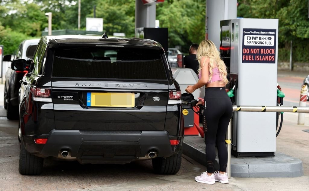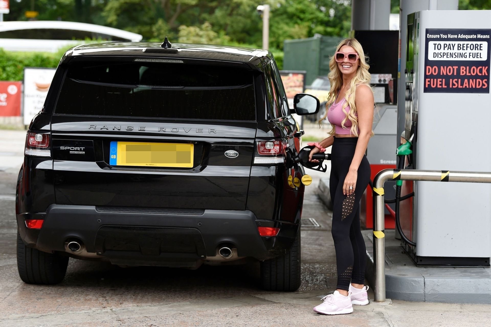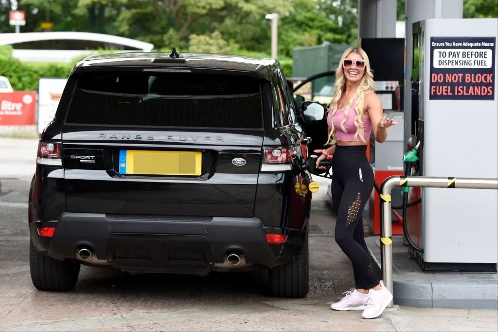 La moglie di Paddy McGuinness, Christine McGuinness, appare sportiva con abbigliamento da palestra mentre viene fotografata mentre fa rifornimento alla sua Range Rover 4X4 presso la sua stazione di servizio locale ad Alderley Edge, Cheshire, 18/07/2019.
