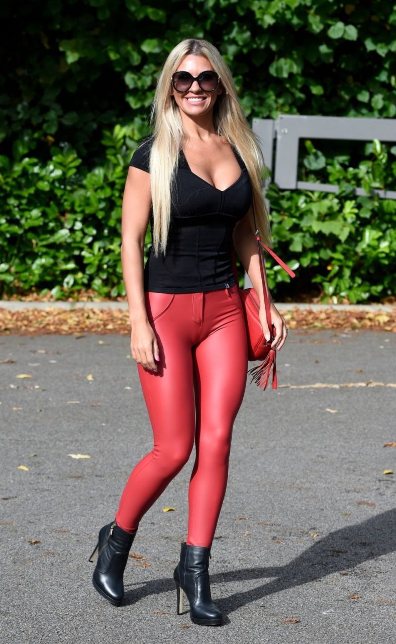 Modella prosperosa Christine McGuinness (31) mostra la sua figura incredibile con pantaloni aderenti in pelle rossa mentre fa commissioni a Cheshire, 10/09/2019.