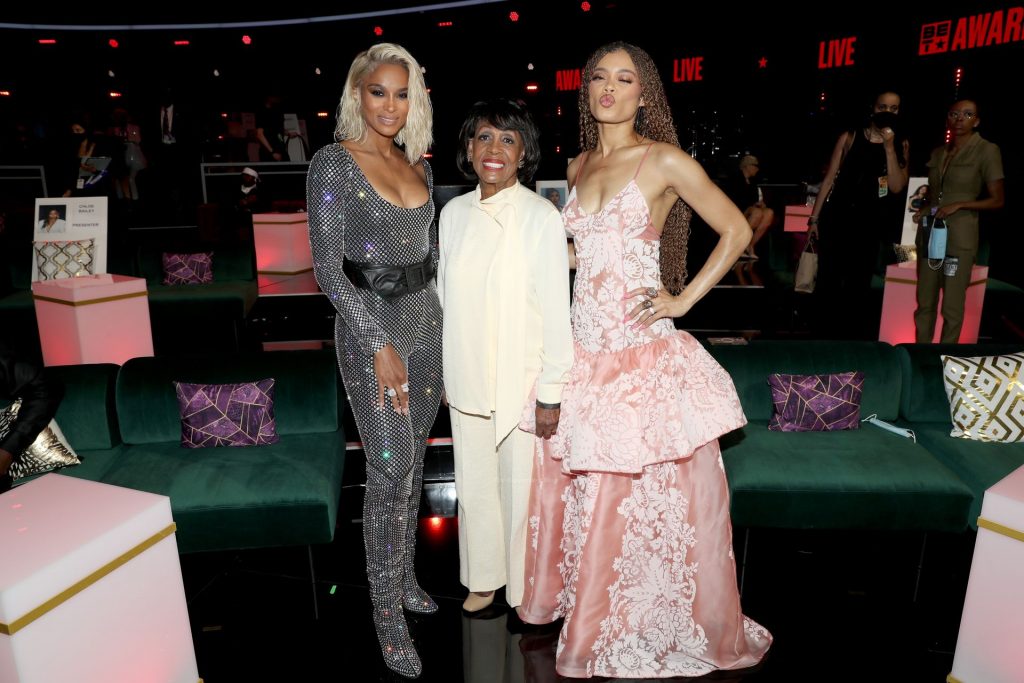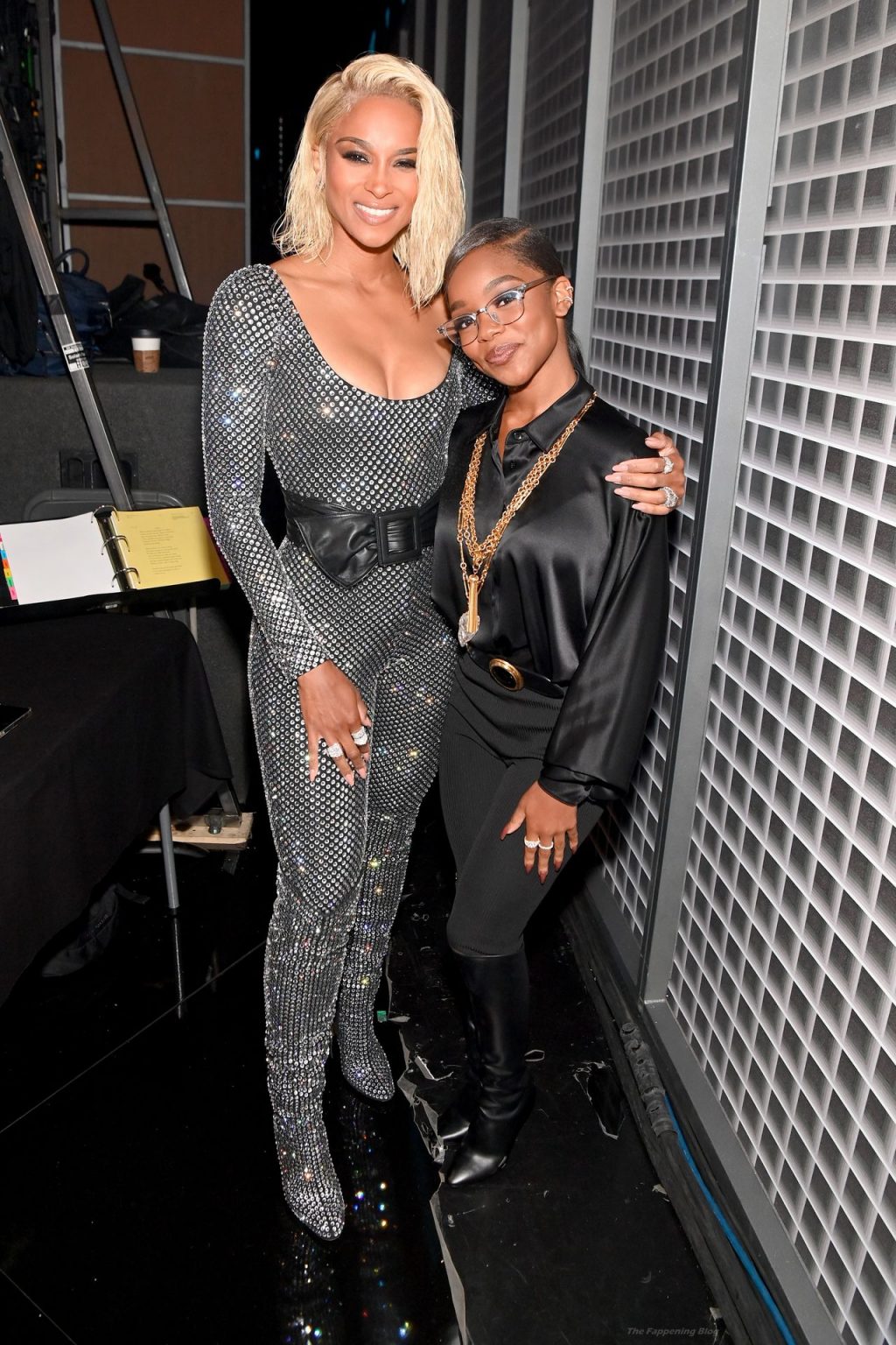 La cantante Ciara posa con la tuta aderente sul red carpet mentre arriva ai BET Awards al Microsoft Theatre di Los Angeles, 27/06/2021.