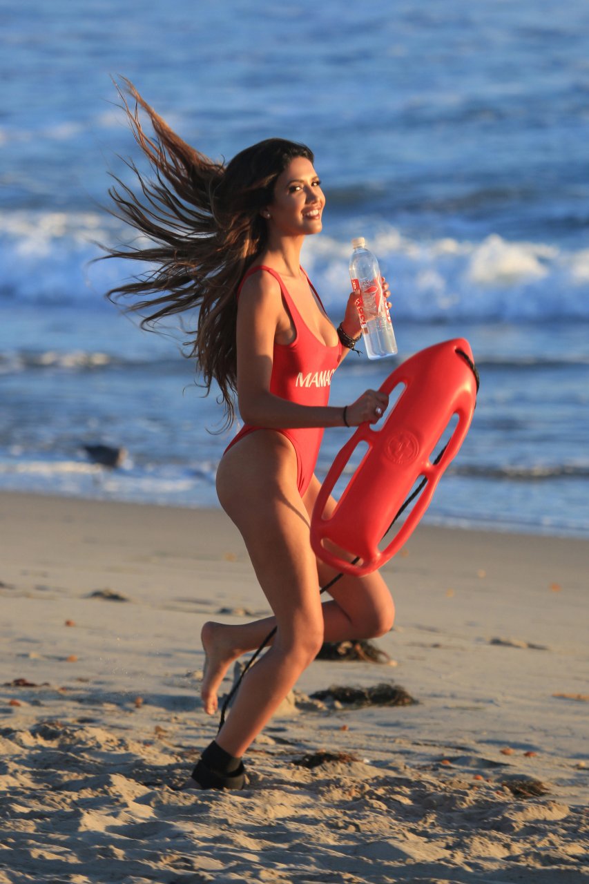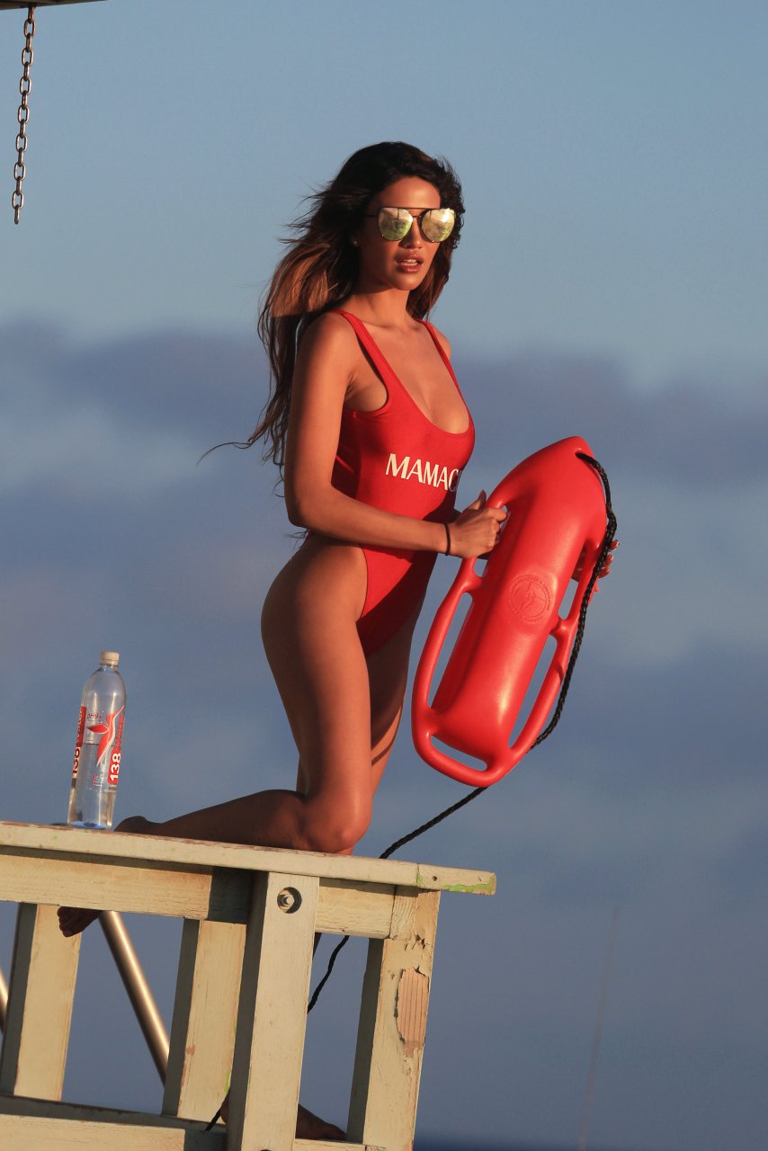 Model CJ Franco posa in un costume intero rosso per un servizio fotografico a tema 138 Water BayWatch sulla spiaggia di Malibu, 07/03/2018.