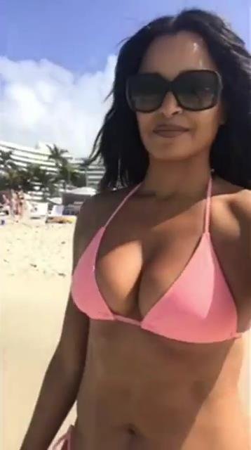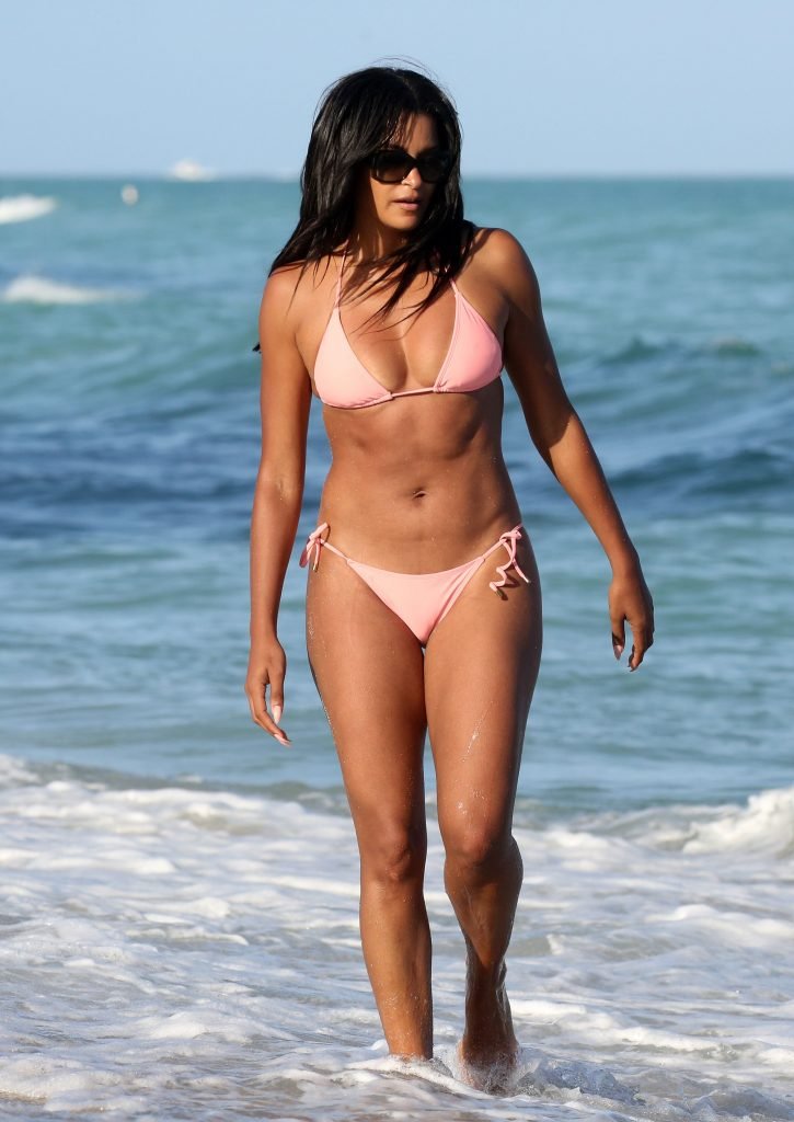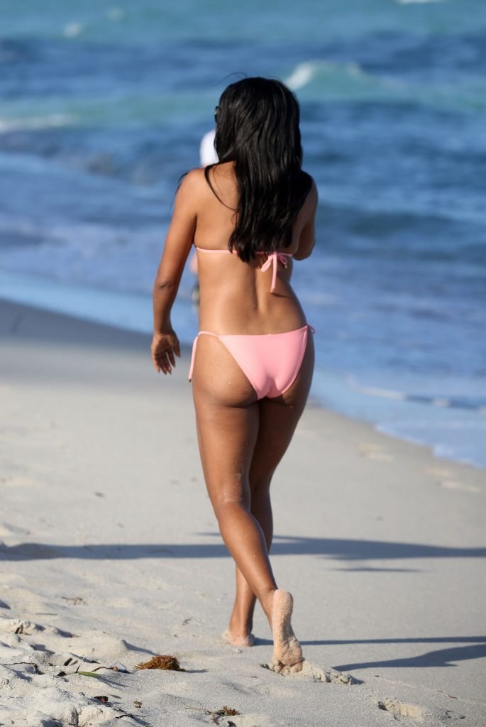 Attrice Claudia Jordan, 44 anni, mostra il suo corpo sexy in un bikini rosa a stringhe sulla spiaggia di Miami, 12/02/2018.