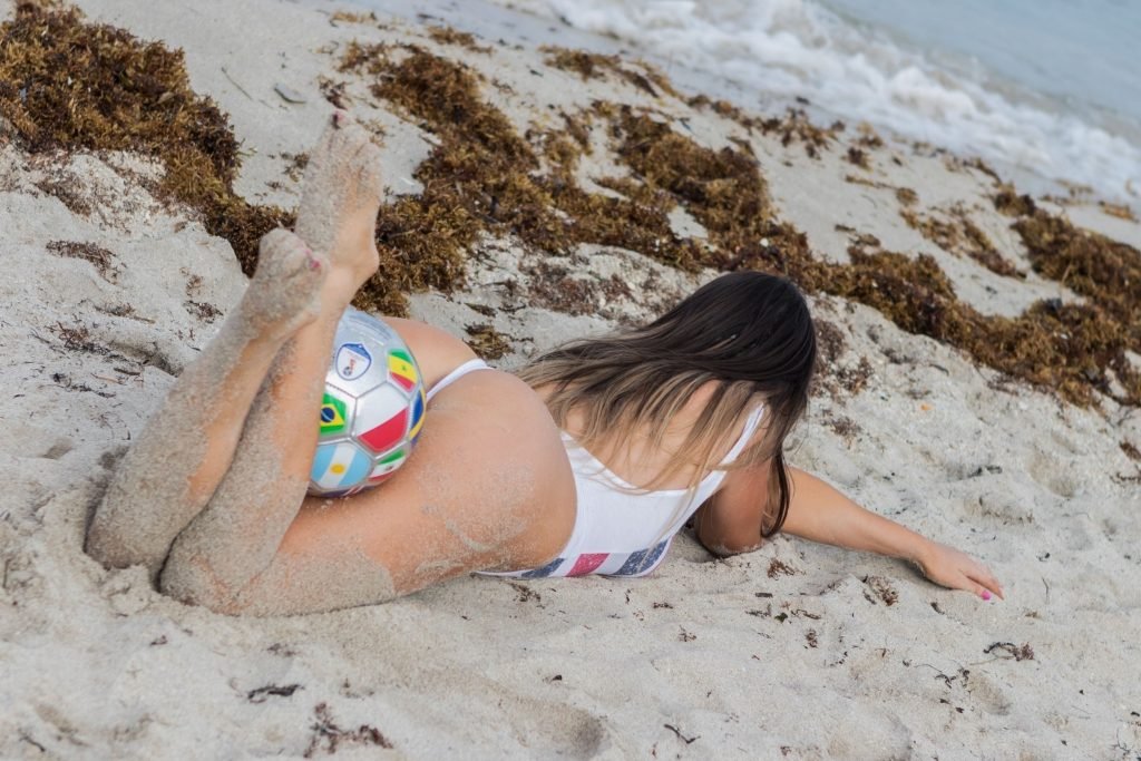 Modella italiana di costumi da bagno, arbitro e star della televisione reality Claudia Romani vuole farci sapere che sostiene l’Inghilterra nella Coppa del Mondo 2018, 21/06/2018. Era a South Beach con un nuovo sexy costume intero.