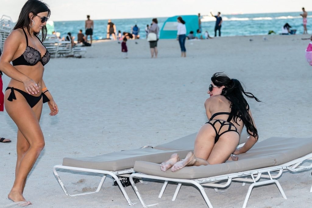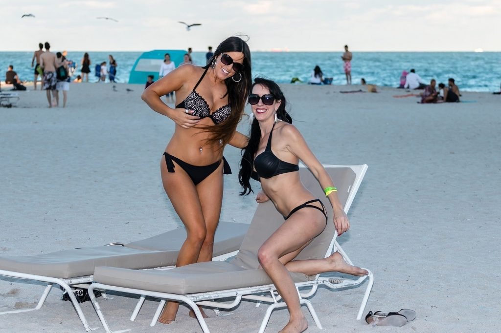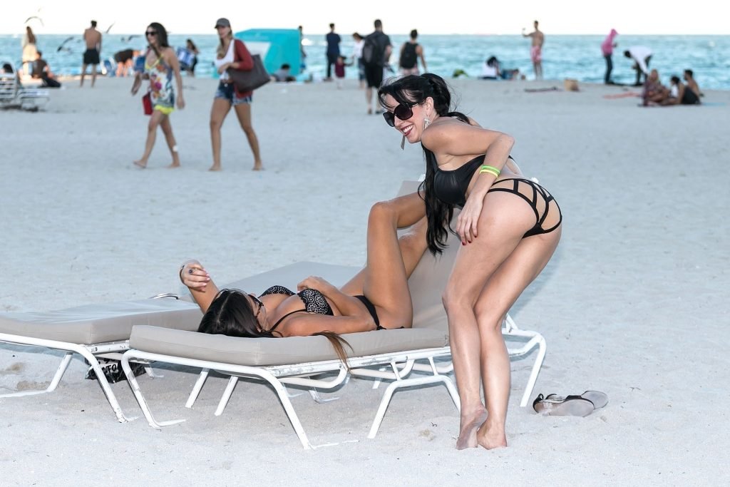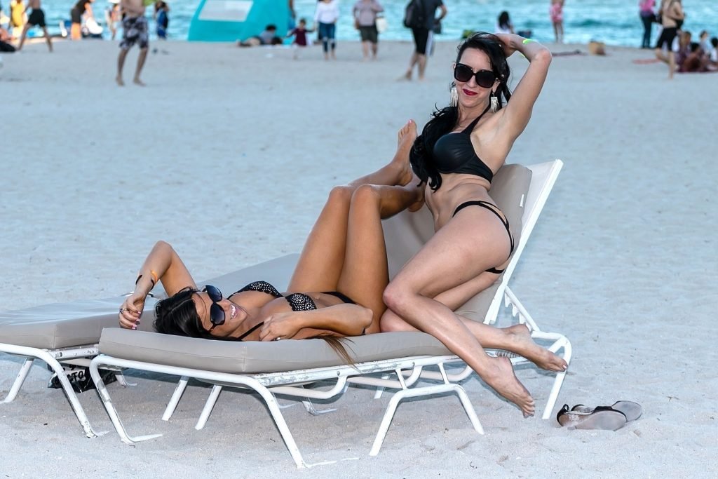 La star della TV reality italiana Claudia Romani e la sopravvissuta e sostenitrice della lotta contro il cancro al seno Bella Bond, tutte sorridenti e che posano per selfie e bagnanti. La calda coppia indossava piccoli bikini neri mentre si godeva una giornata in spiaggia a Miami, 14/01/2018.