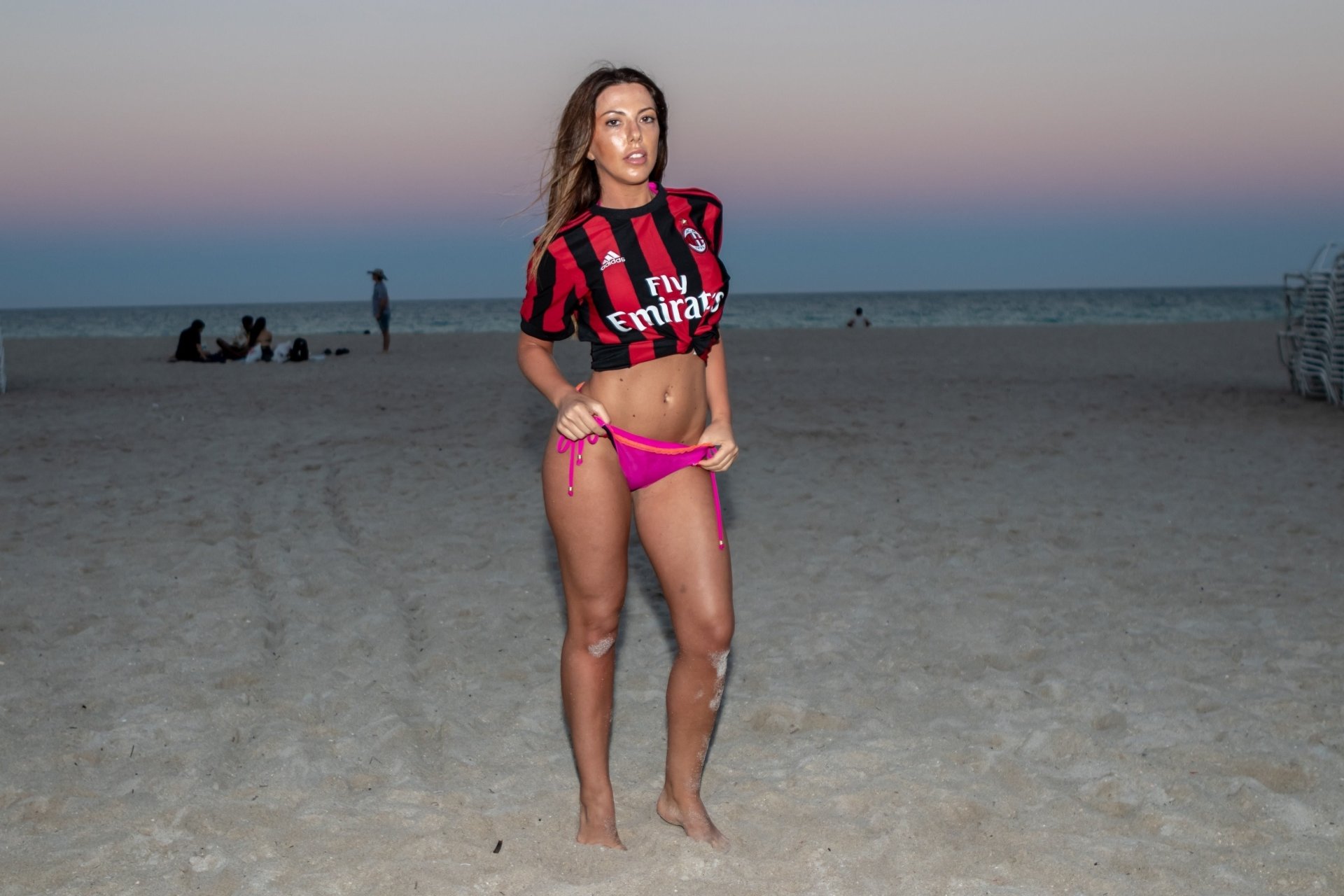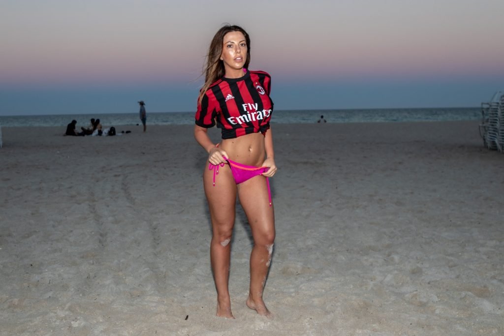 Claudia Romani, Laura Bragato e Julia Pereira posano con maglie da calcio e perizoma a South Beach prima della grande finale di Coppa Italia Juventus AC Milan, 08/05/2018. Claudia e Laura indossano le maglie del Rossoeri e Julia mostra il suo amore per l’Italia.
