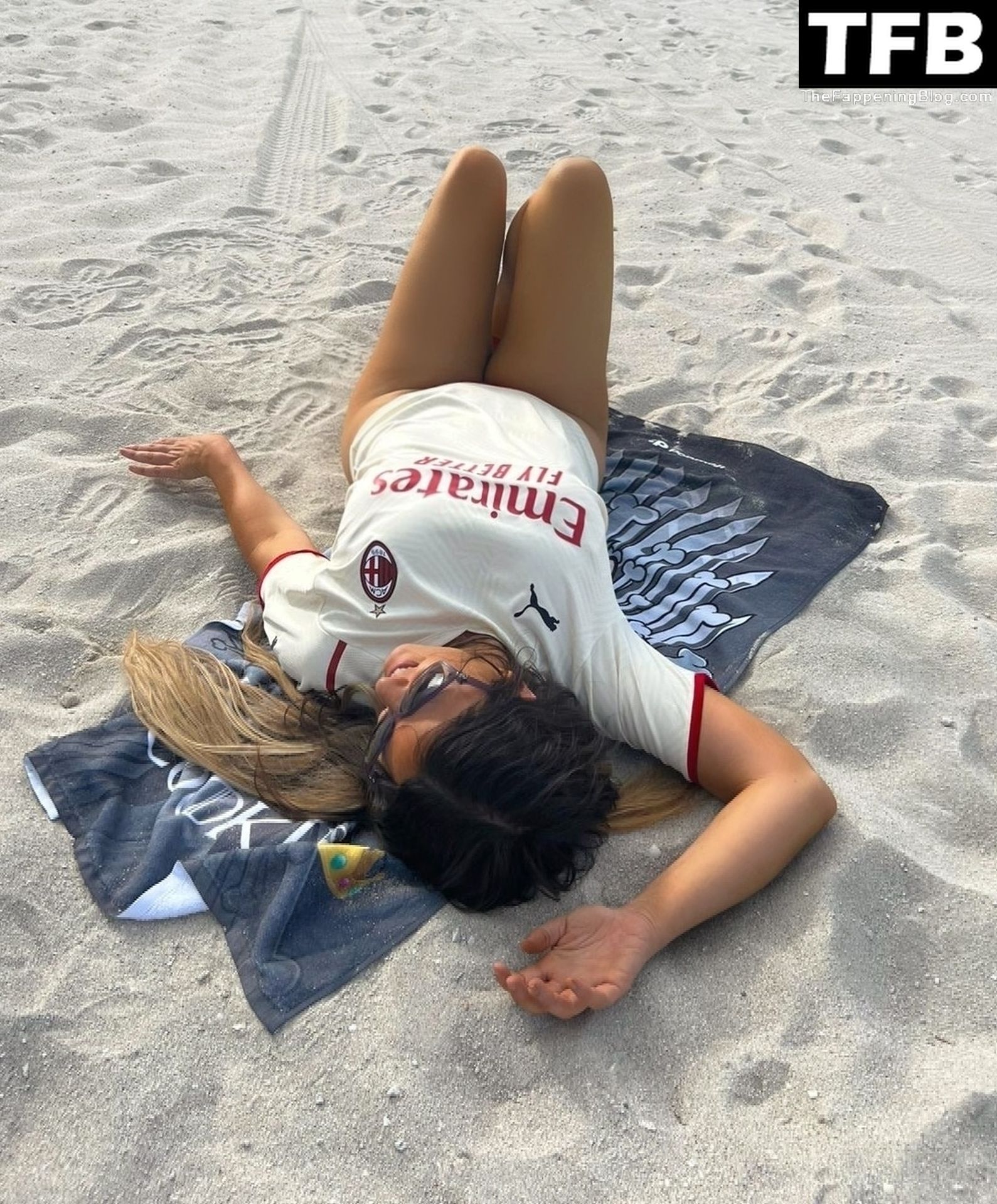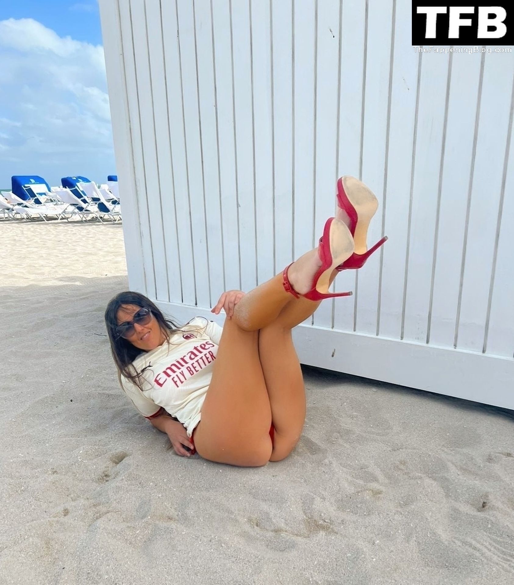 Claudia indossava un sexy bikini rosso abbinato alla maglia della Fondazione Milan e tacchi alti sulla sabbia.