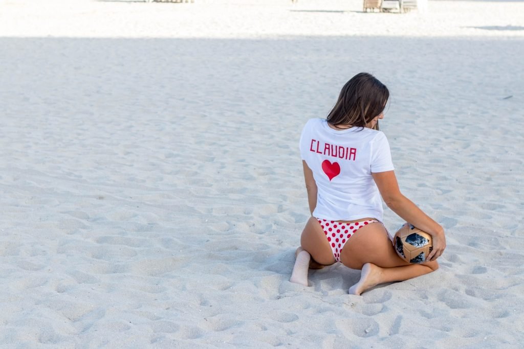 Claudia Romani a South Beach poco prima della finale della Coppa del Mondo indossando una maglietta personalizzata Russia 2018 e slip bikini a pois, 14/07/2018. La modella e personaggio televisivo di 36 anni sorrideva e mostrava le sue curve, divertendosi.