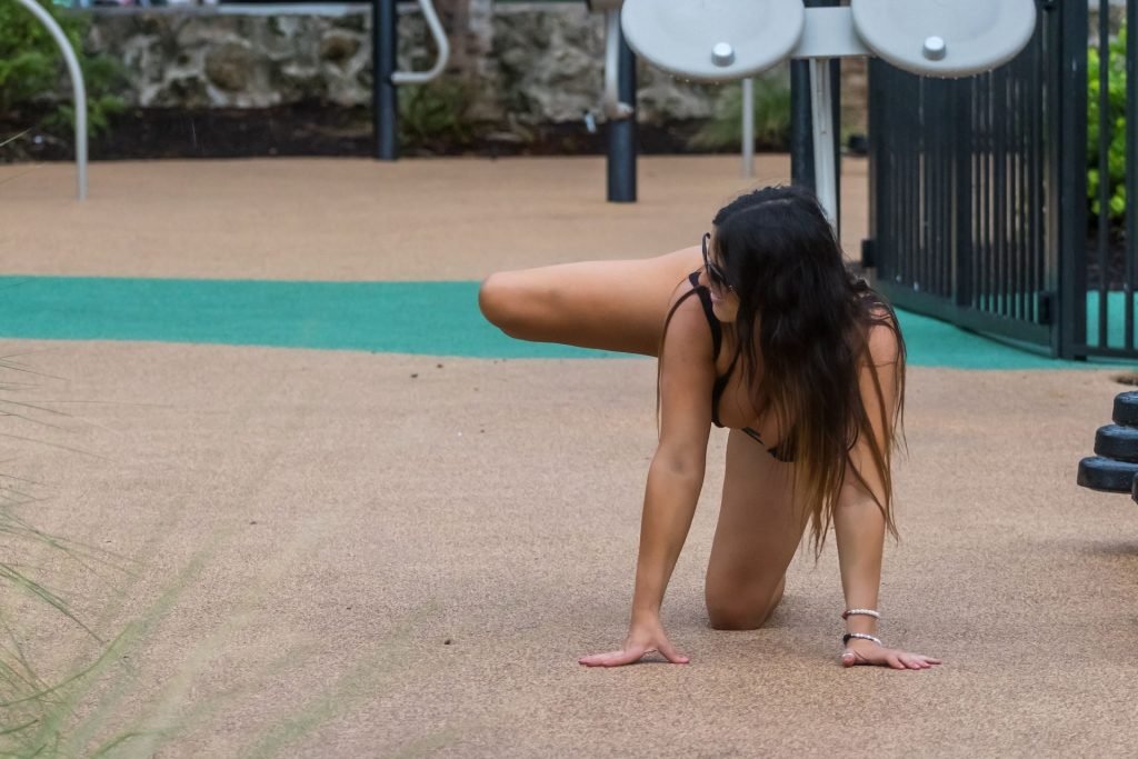 Claudia Romani è vista mentre si allena all’aperto e poi si rinfresca con una doccia a Miami, 20/10/2019. Indossa un body con perizoma e cerca di snellire quelle forme.