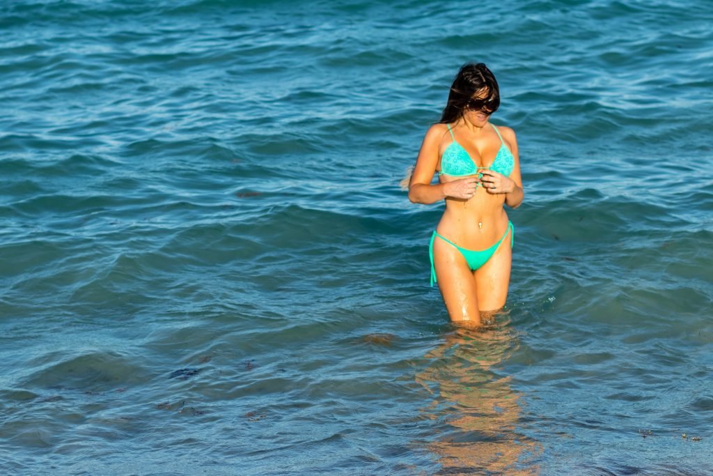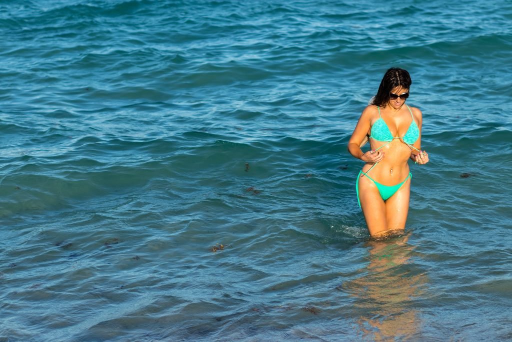 Modella italiana e star della TV reality Claudia Romani (36) era a South Beach sfilando con un bikini verde molto piccolo a perizoma, 29/07/2018. Stava giocando in acqua e rendendo felici tutti.