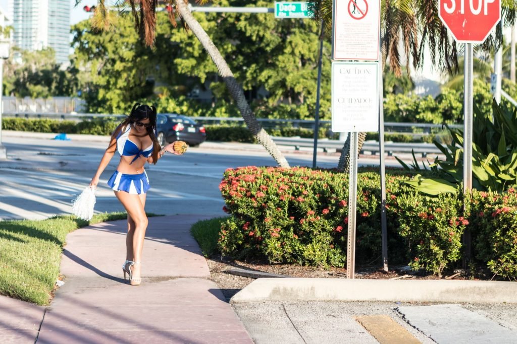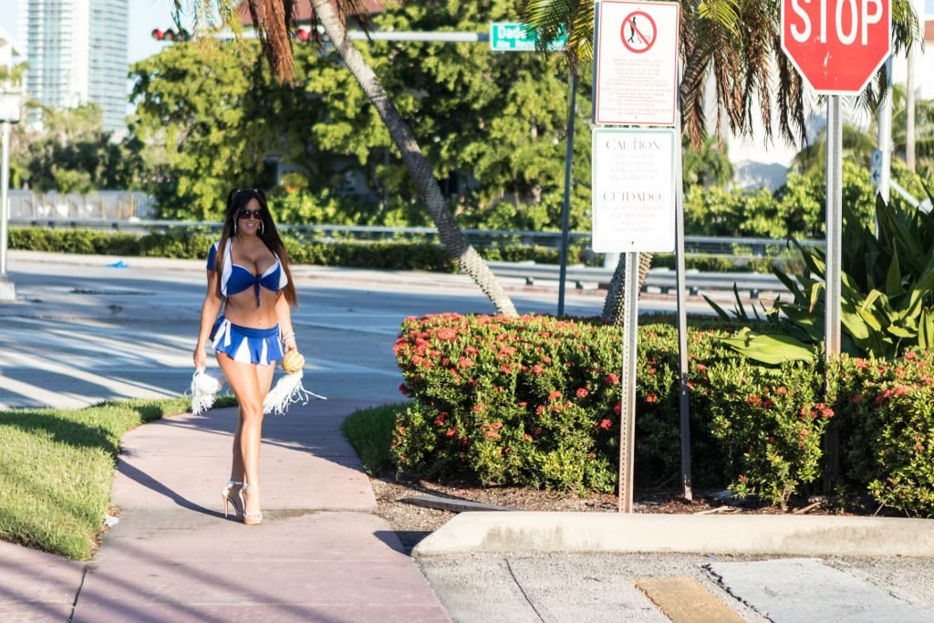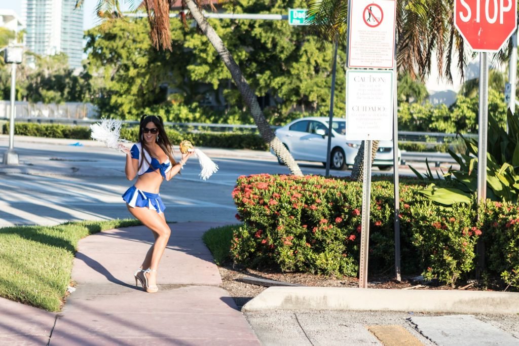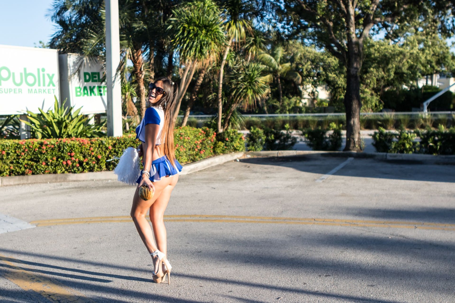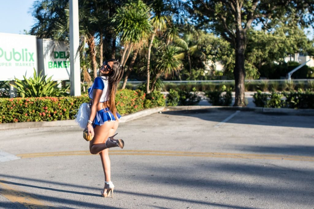 Modella italiana, star della TV reality Claudia Romani (35) a Publix a South Beach, attirando sguardi e rubando cuori con un costume da cheerleader di Halloween super piccolo, 29/10/2017. Gonna corta che non nasconde davvero il perizoma bianco sotto.